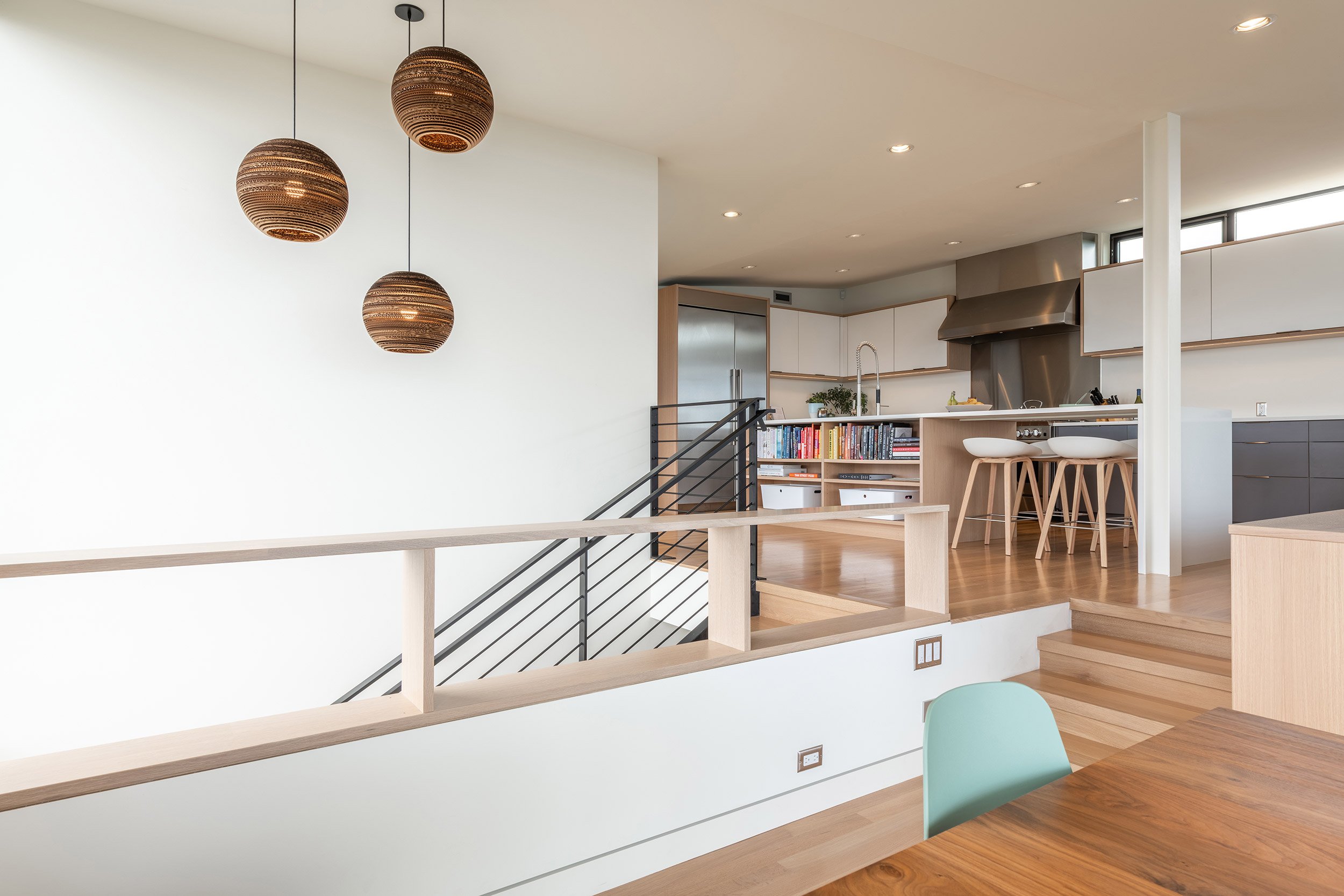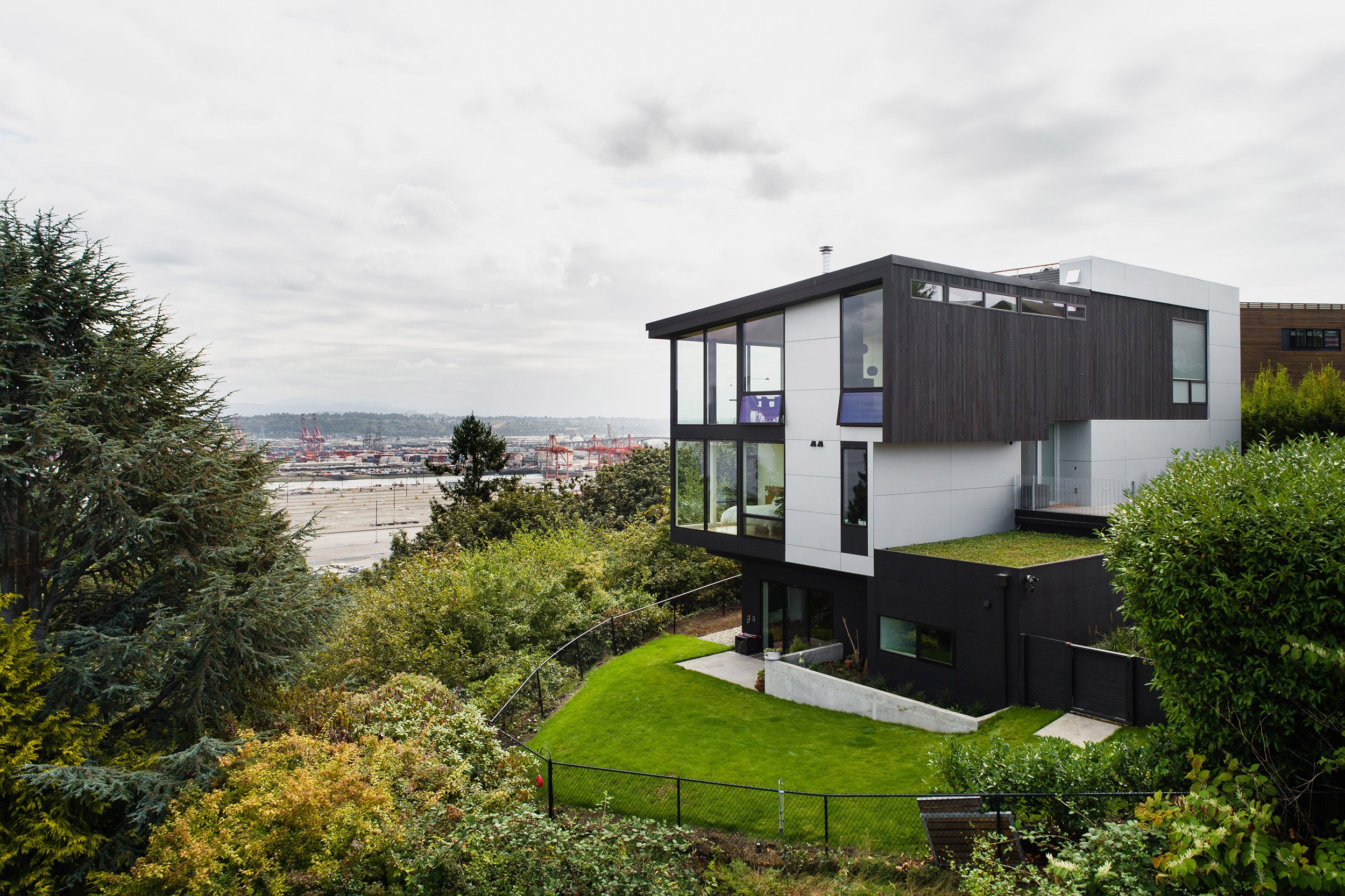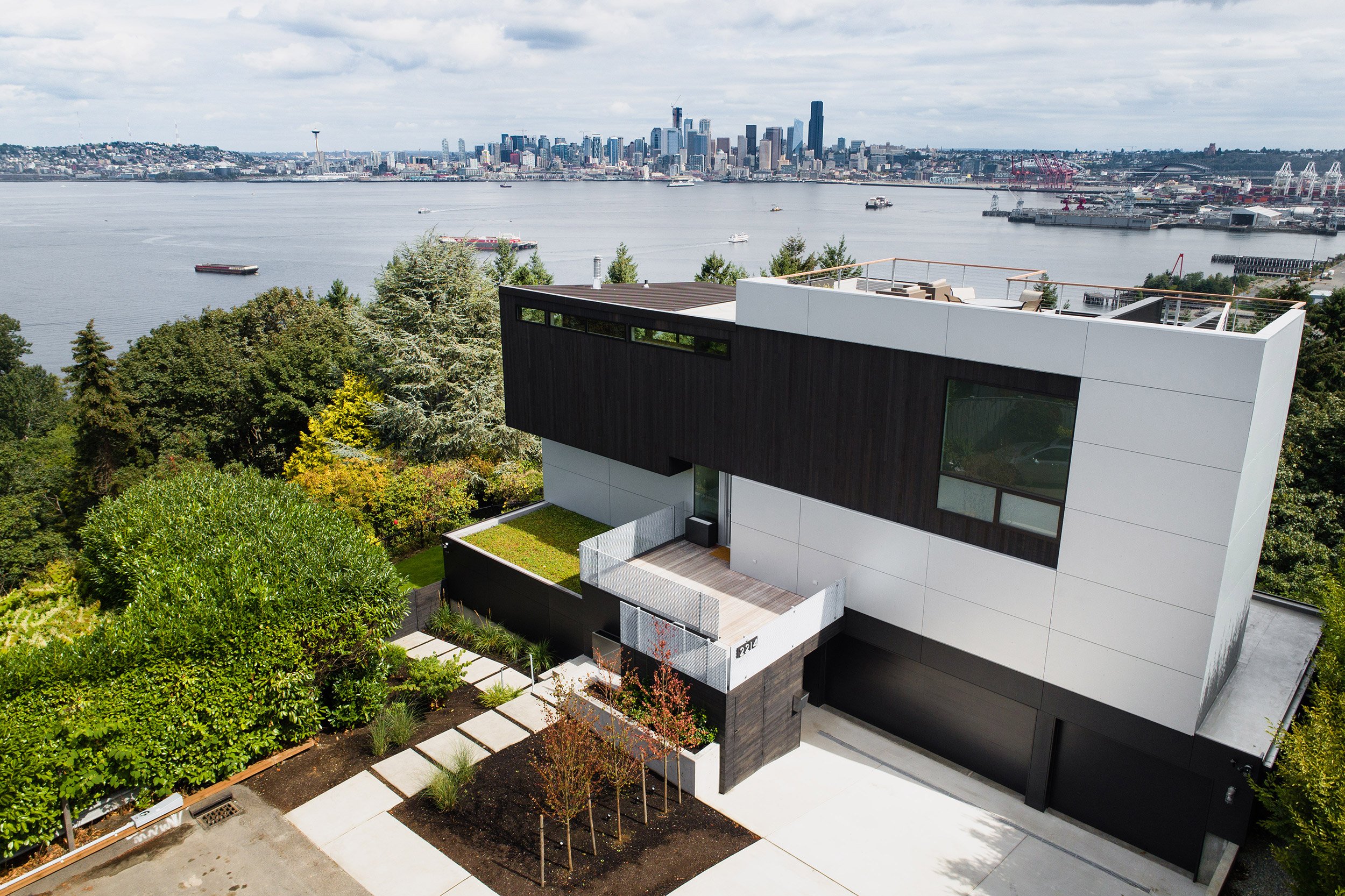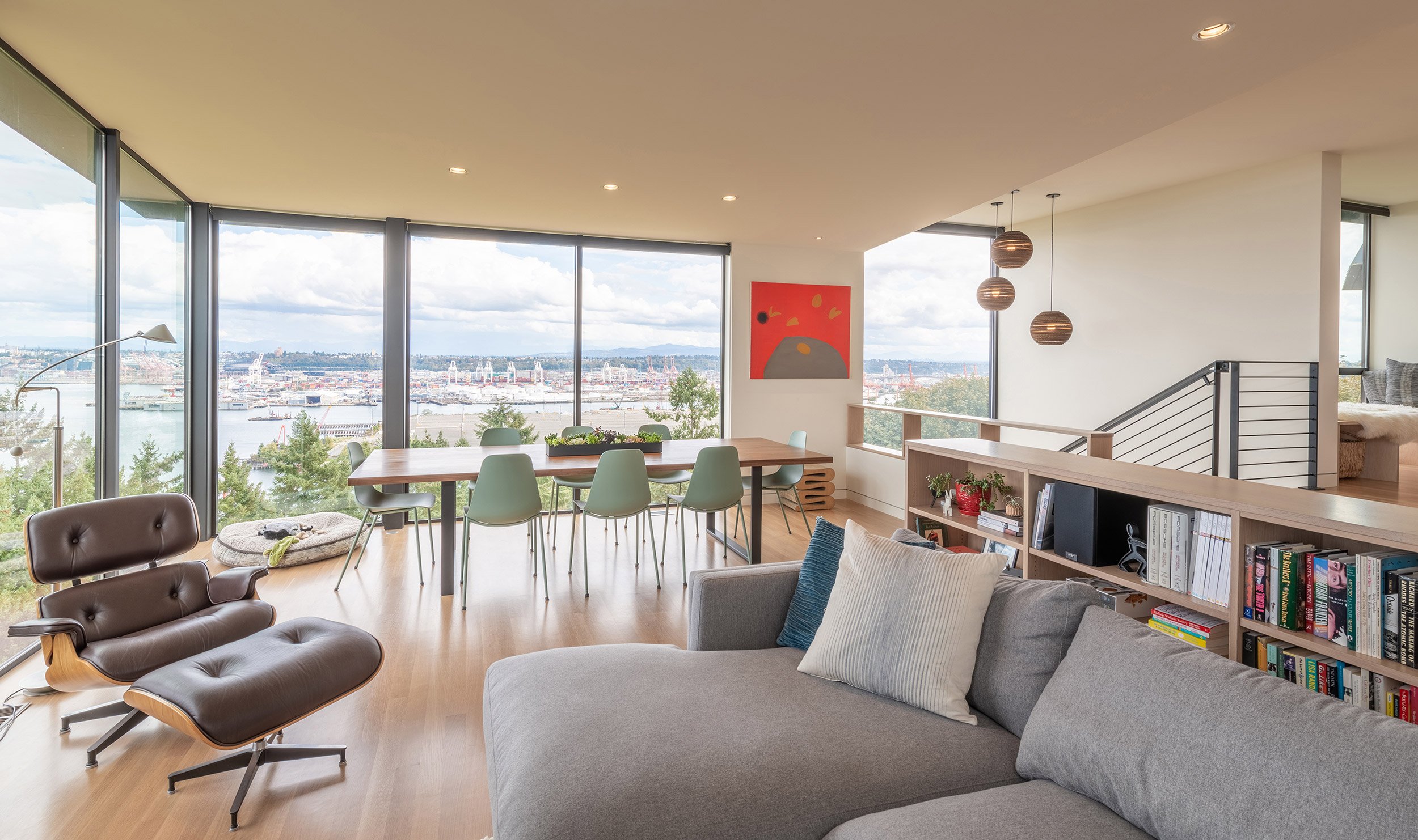 Perched on West Seattle’s northeast facing bluff, the design for this house centers around a stunning view of Harbor Island, Seattle, the Puget Sound, and the Olympic Mountains. It reuses an existing foundation, and follows the original footprint of the previous structure. A reverse floor plan allows the kitchen, dining, and living areas to maximize views and natural light. Bedrooms were designed into the mid-level, and a ground-floor lounge connects with the landscape. The envelope was designed to provide maximum daylight and views to the north and east, while the south and west maintain privacy.