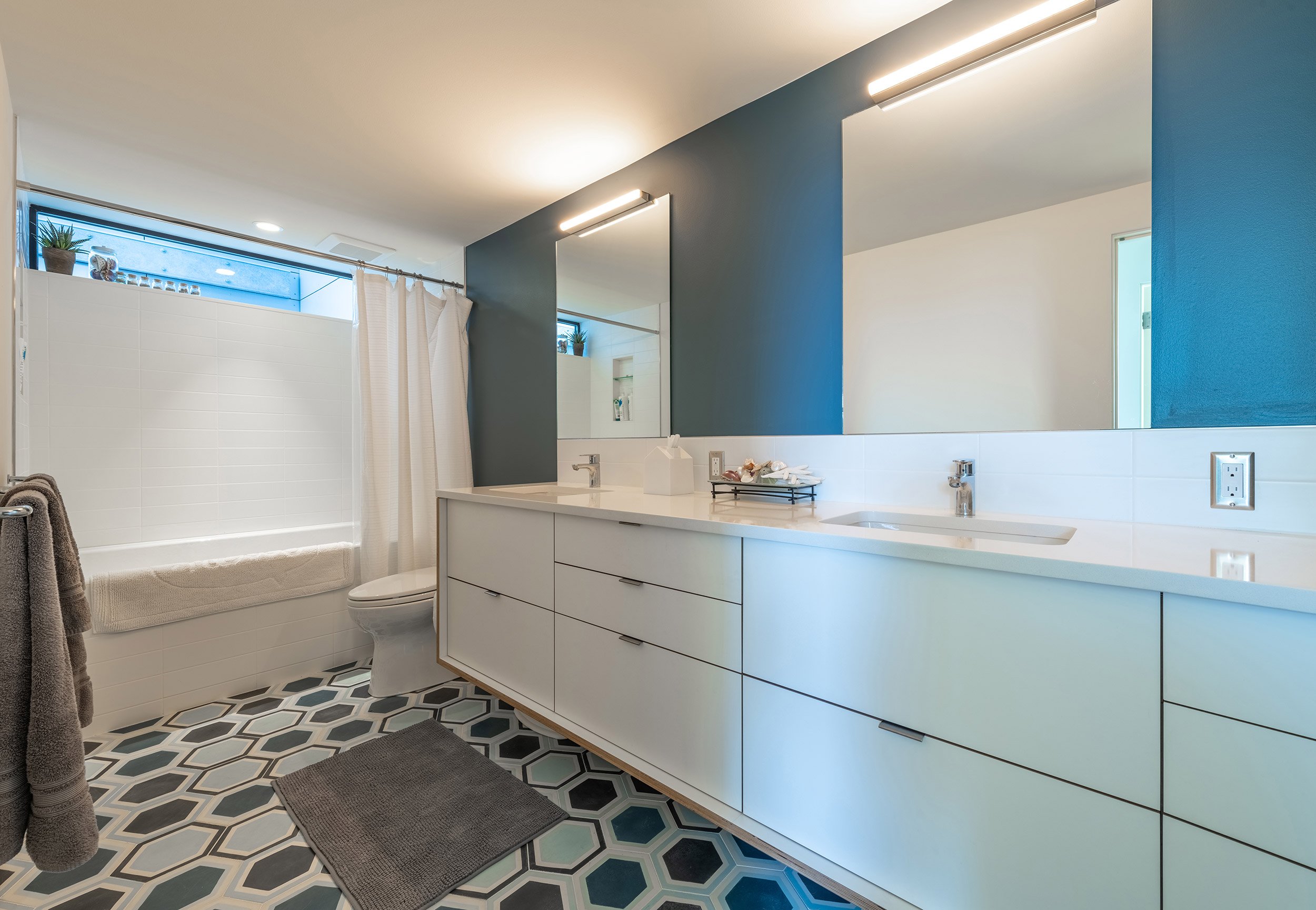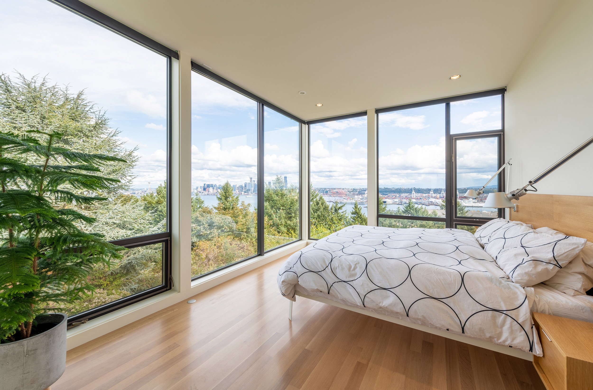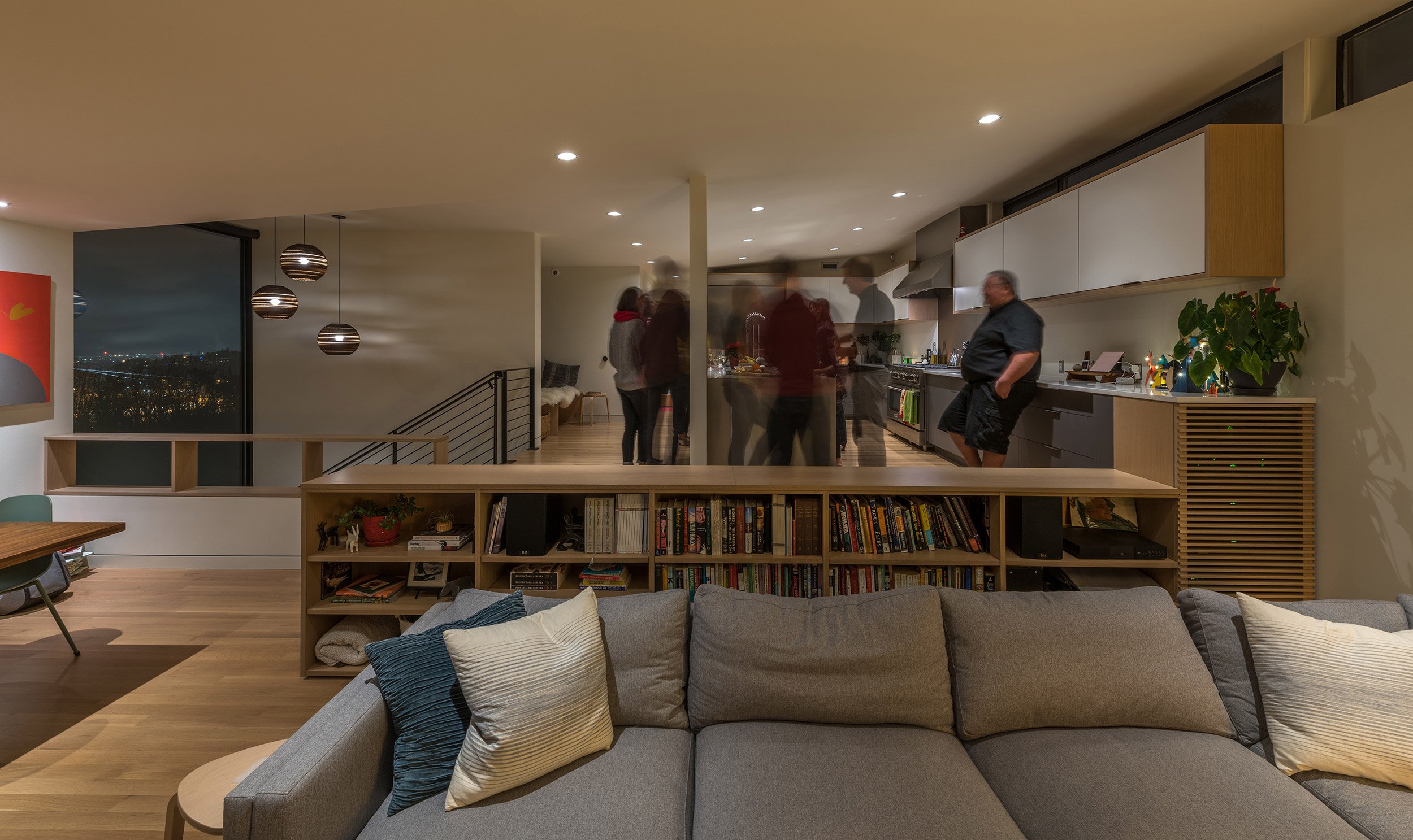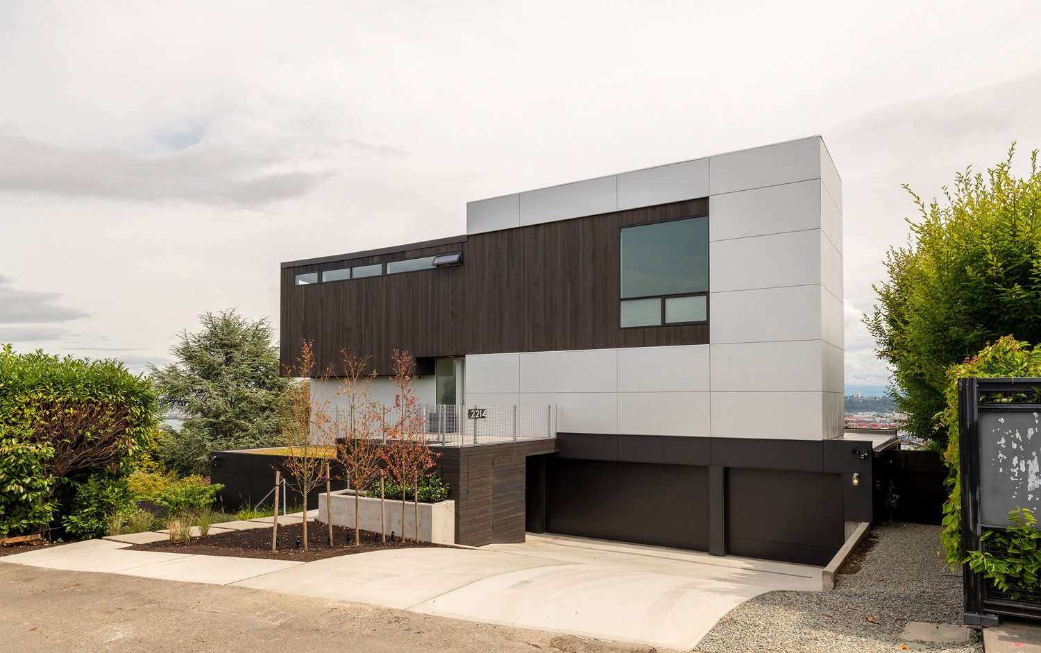 Perched on West Seattle’s northeast facing bluff, the design for this house centers around a stunning view of Harbor Island, Seattle, the Puget Sound, and the Olympic Mountains. It reuses an existing foundation, and follows the original footprint of the previous structure. A reverse floor plan allows the kitchen, dining, and living areas to maximize views and natural light. Bedrooms were designed into the mid-level, and a ground-floor lounge connects with the landscape. The envelope was designed to provide maximum daylight and views to the north and east, while the south and west maintain privacy.