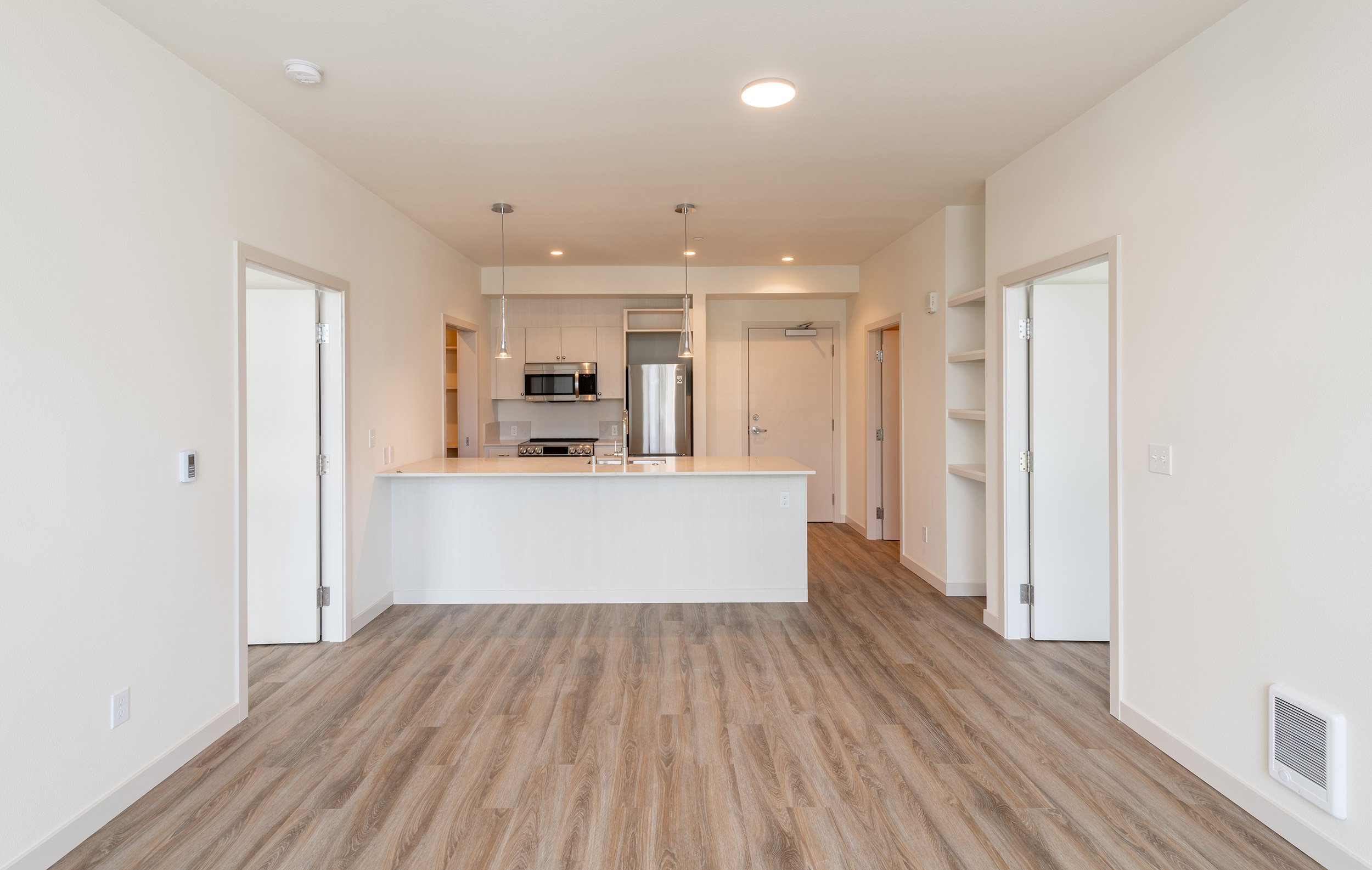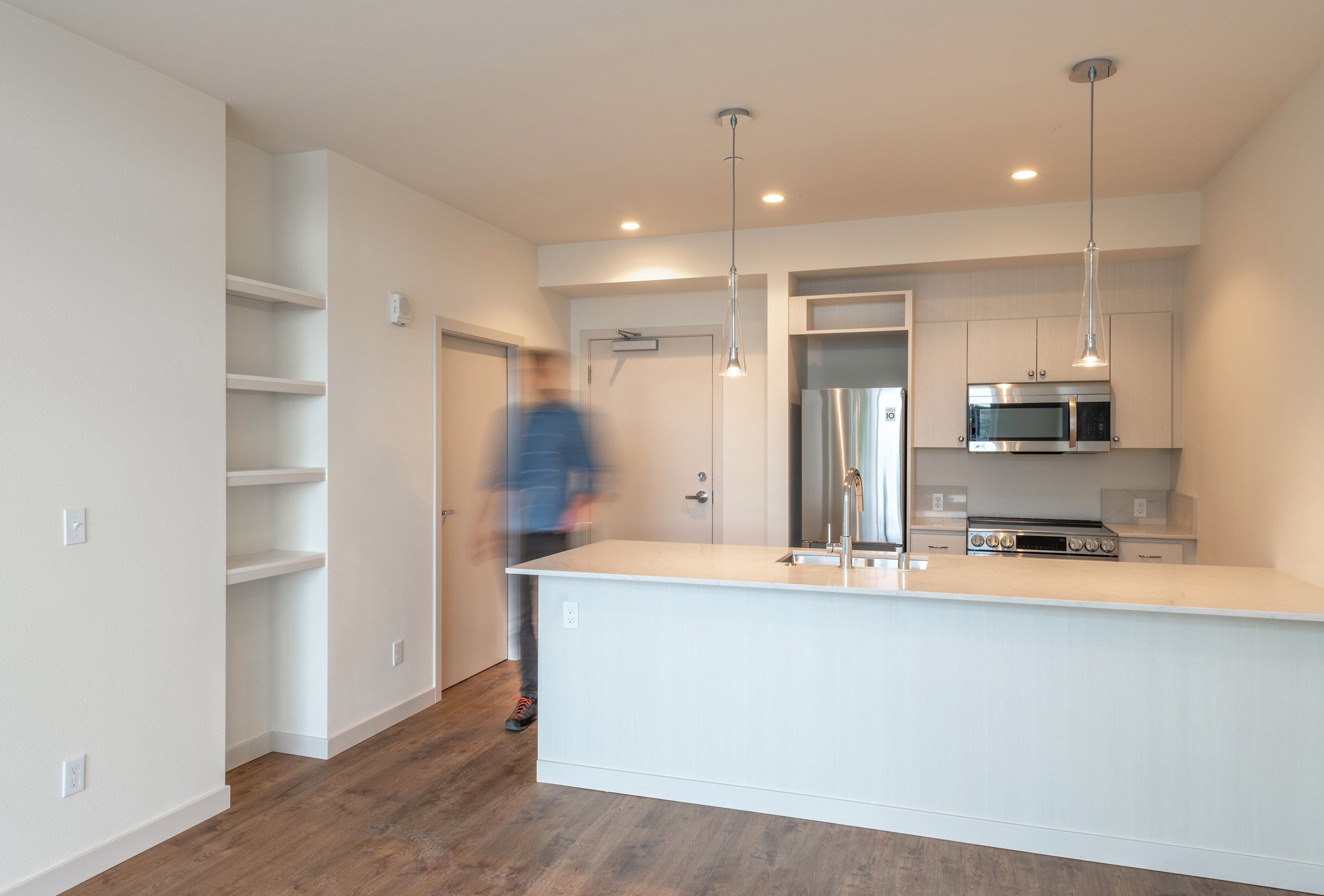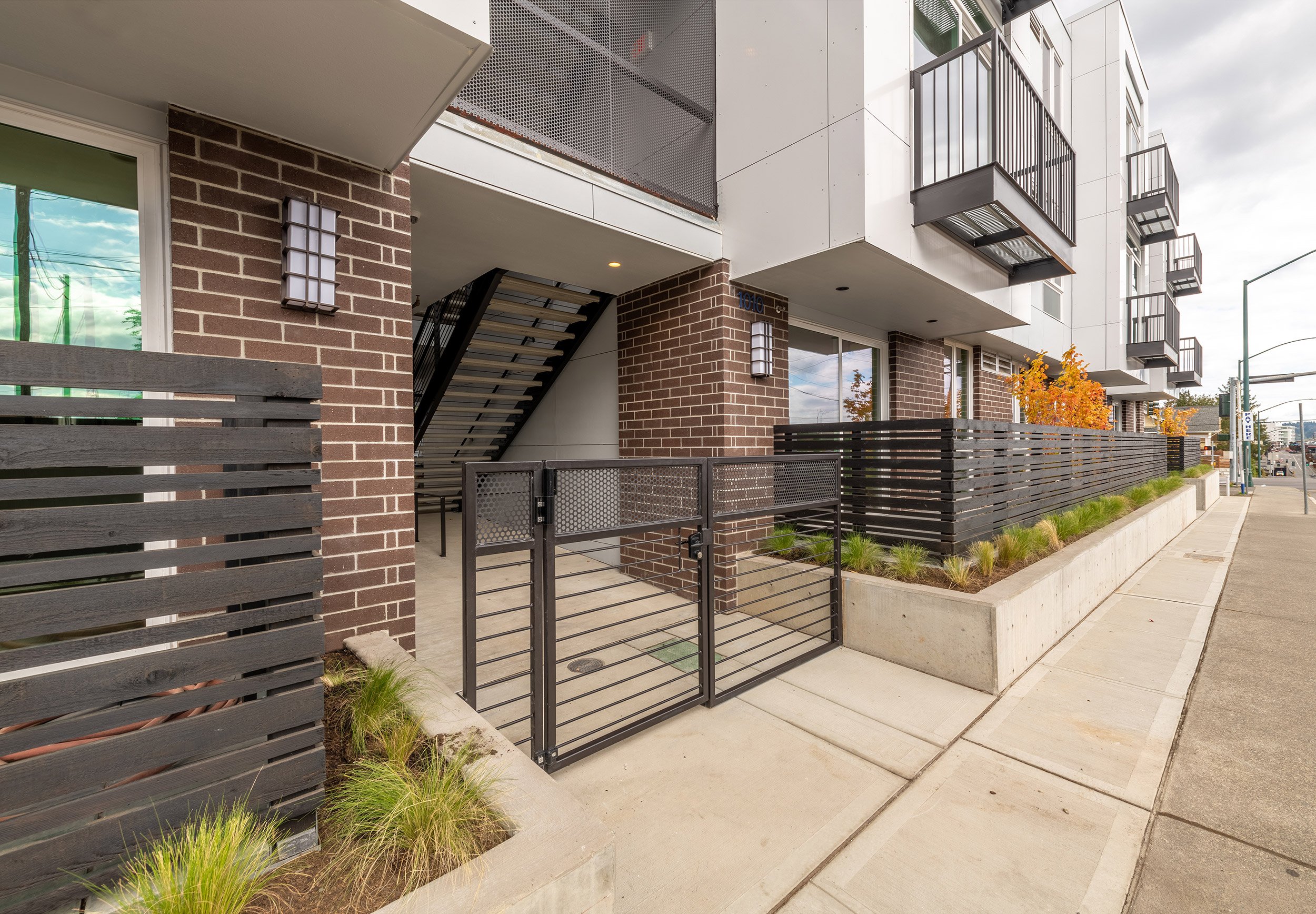 The Burwell Apartments are located in Bremerton, WA, a ferry ride from downtown Seattle on the Kitsap Peninsula. This new, 20,000-sf, 25-unit apartment building includes covered and open parking. The design follows a rigorous logic of varying unit types to offer flexibility and optimize the building footprint. The program incorporates accessible ground floor units that open to terraces, and upper level units that capture views of the harbor and Puget Sound. The massing emphasizes articulation of form and geometrical rhythm. The project was completed in the fall of 2022.