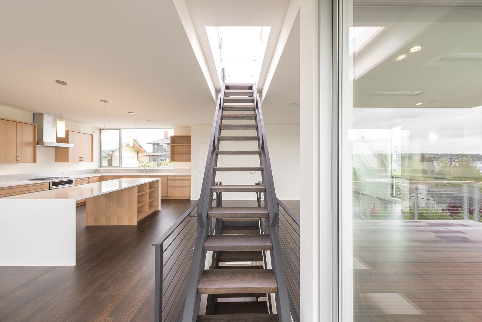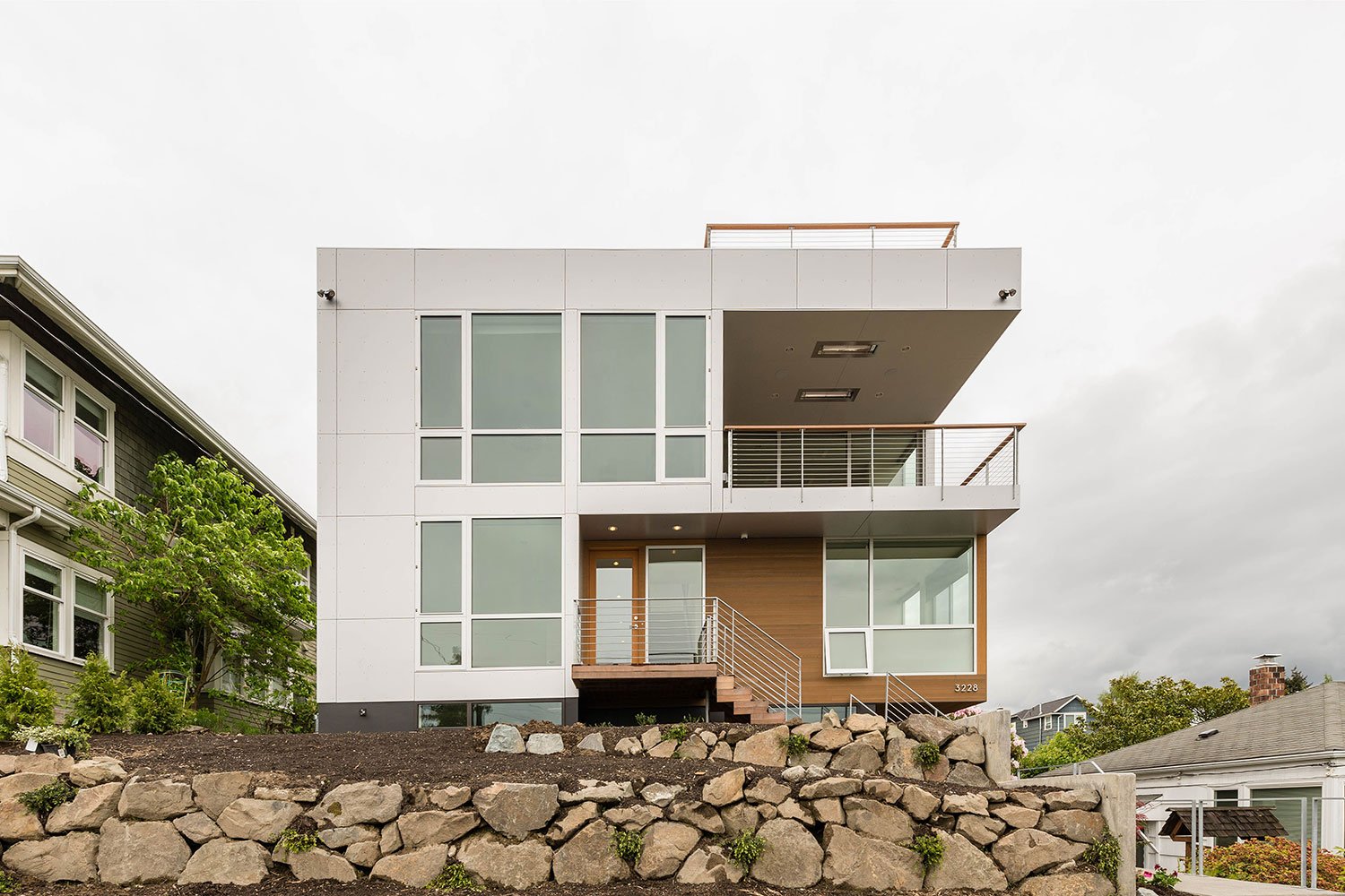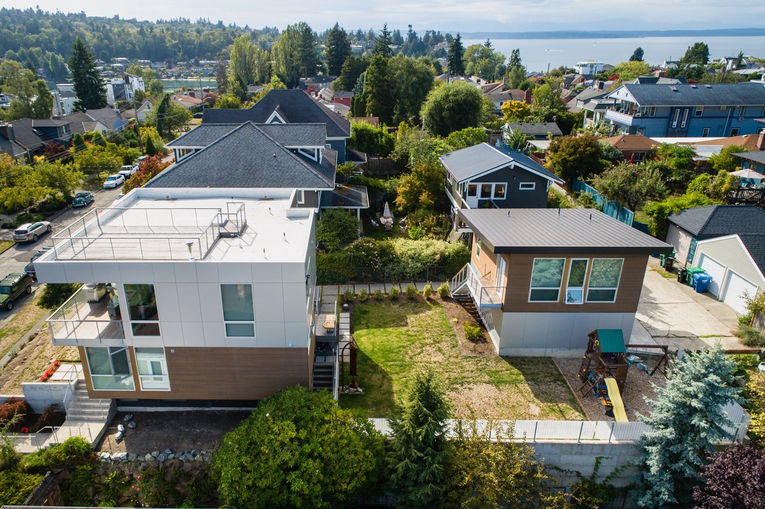 Continuing with our rich tradition of self-developing projects and experimenting with small, single-family lots with primary residences and accessory dwelling units, this three-storey residence for a small family employs a reverse floor plan where the common areas are located at the upper level to capture natural light and views of Ballard, the ship canal, and downtown Seattle. A steep slope condition, coupled with alley access, retains a tidy footprint while offering design opportunities for a day-lit basement and detached garage.
