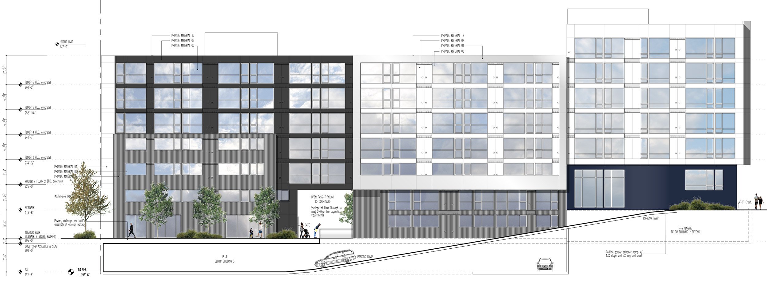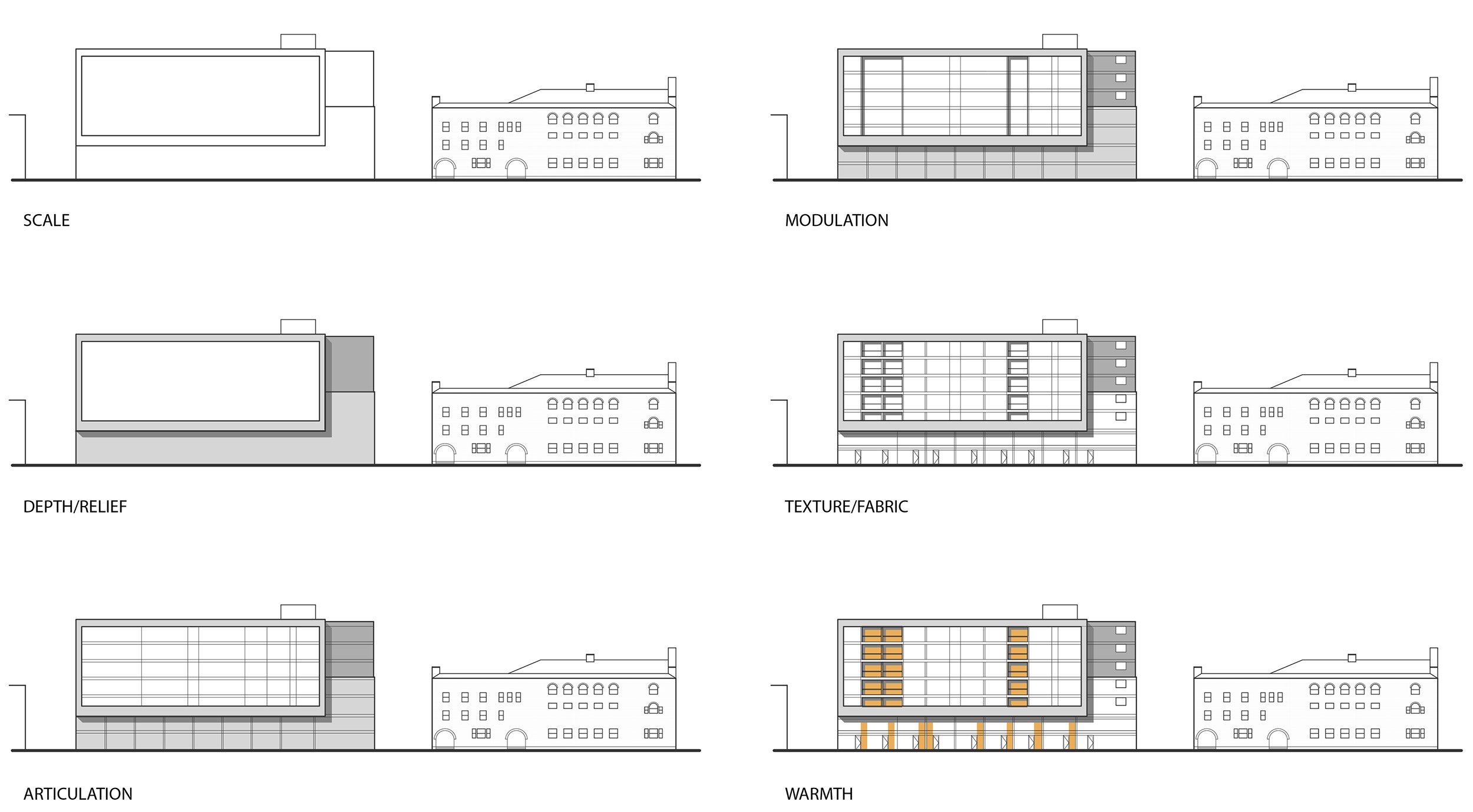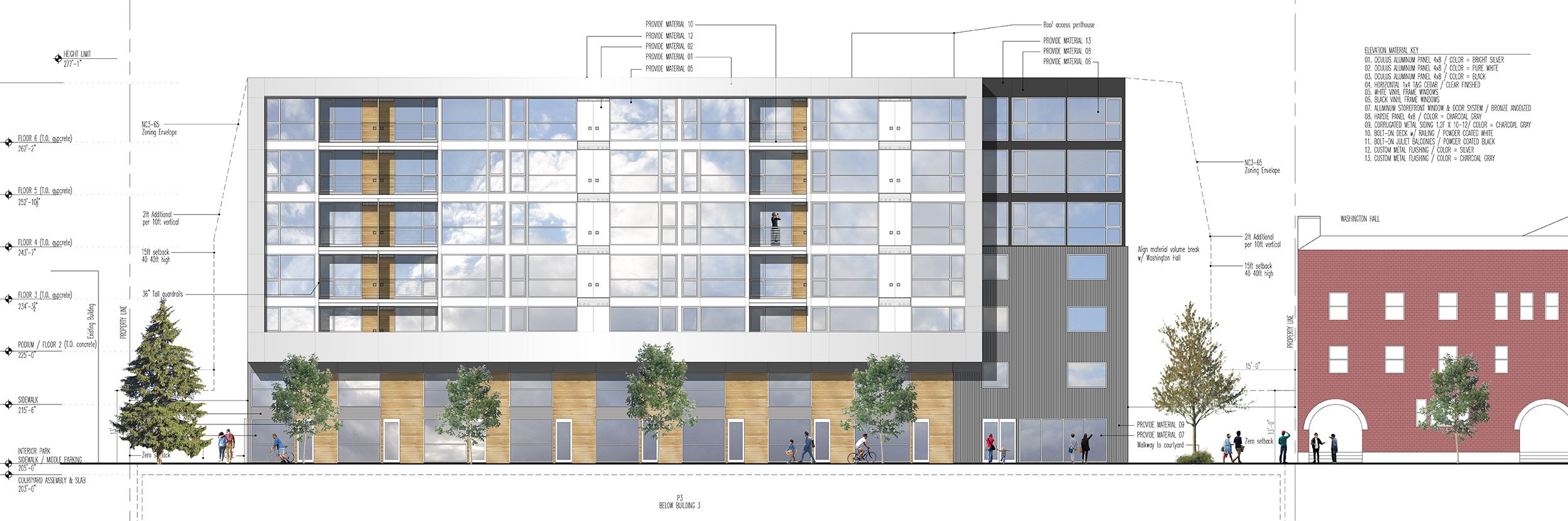Directly adjacent to the landmarked Washington Hall, the building design thoughtfully weaves modern and transparent gestures, with a scale and massing that is respectful of its historic neighbor. Through a series of intentional design moves — depth/relief, articulation, modulation, layering of texture/fabric — a human scale and inviting street presence were achieved. The project was successfully taken through master-use and building permitting processes, with a building permit being made available to the client.
