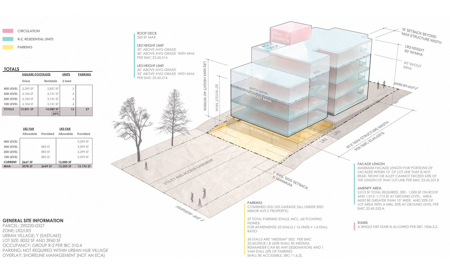 This site, zoning, and permitting analysis provides a clear strategy to design, permit and build a 14-unit apartment building on a 5,400 square foot lot within the City of Seattle. Strategic zoning code navigation allows the project to eliminate Seattle’s time consuming and costly design review process. The project type is an important example of the mid-density housing so desperately needed in the Puget Sound region.
