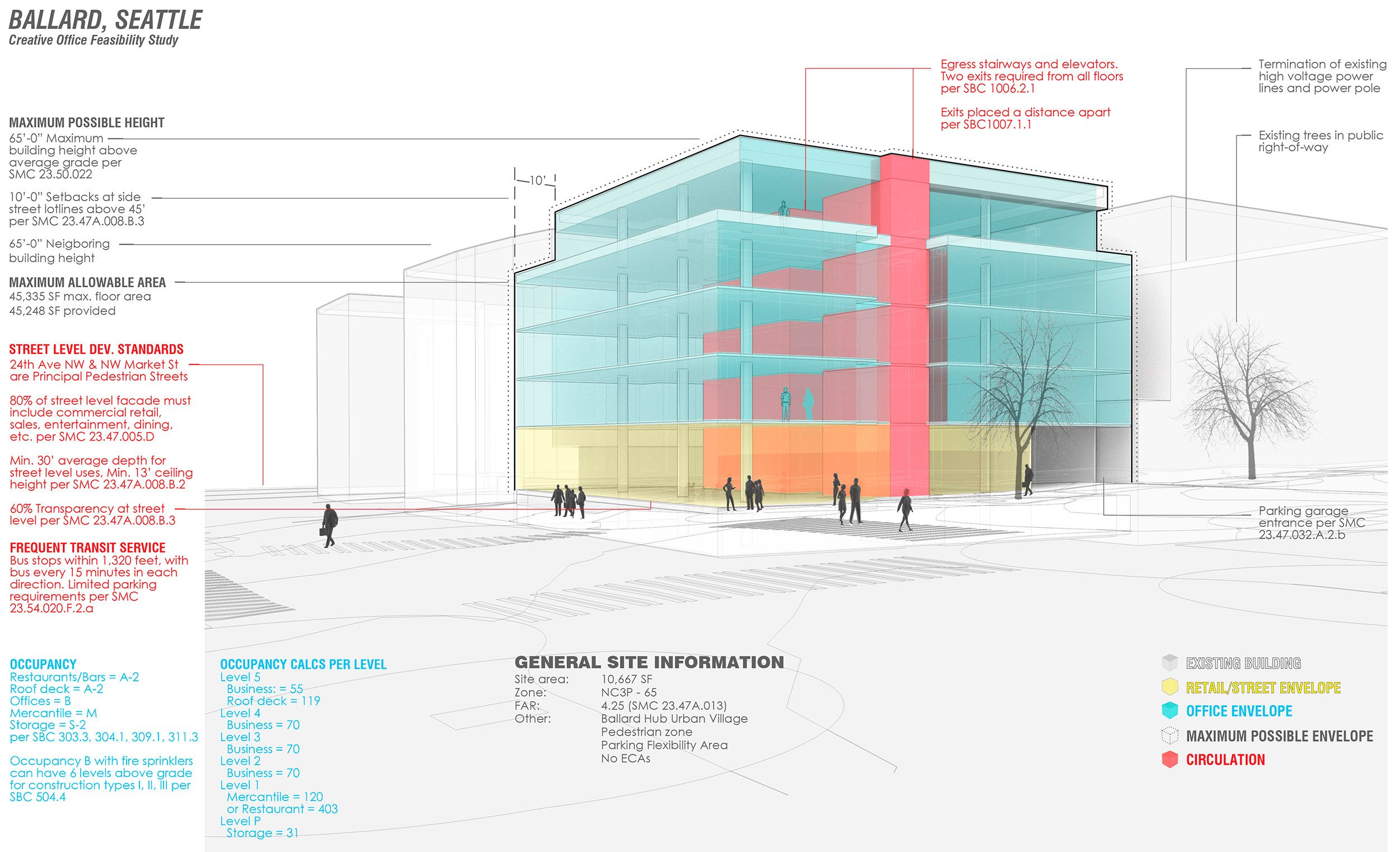 The study optimized a corner lot for a five-level, mixed-use building with two street facing facades. Upper level setbacks were configured as garden terraces for the top floor spaces.