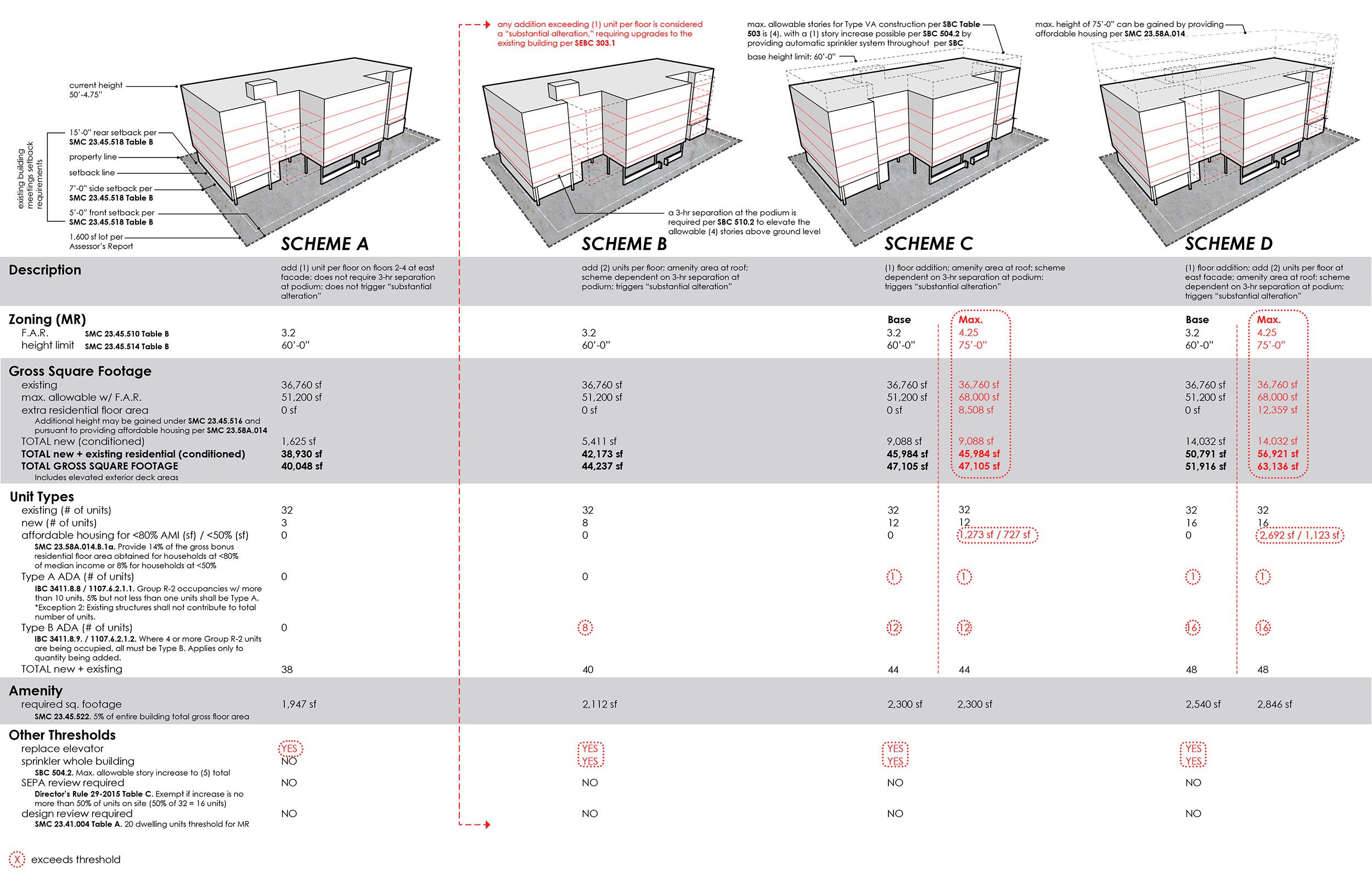 This study analyzed several scenarios to add floors onto an existing apartment building. Diagrams and pro formas were established to show proof of concept for a maximum of 16 additional units, or a 50% increase in rental units.