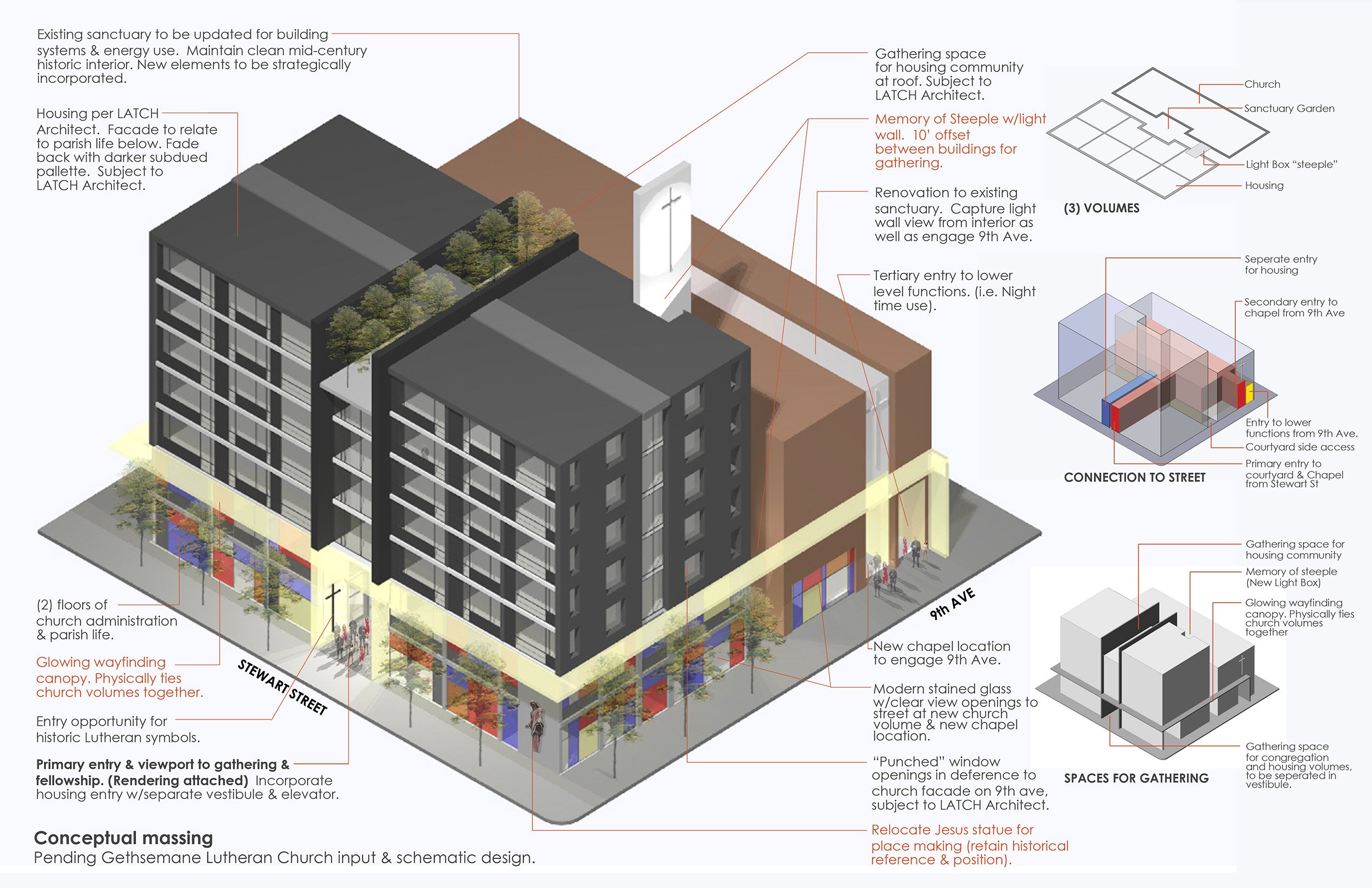 The study focused on a reconfiguration of the Gethsemane Lutheran Church in downtown Seattle with an additional five levels of subsidized housing above. Design and program requirements of the religious organization were successfully balanced with the pro forma of the housing group.