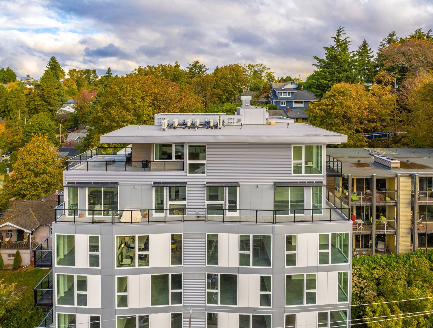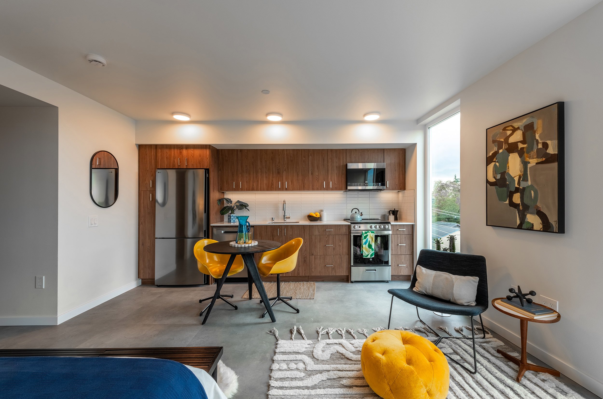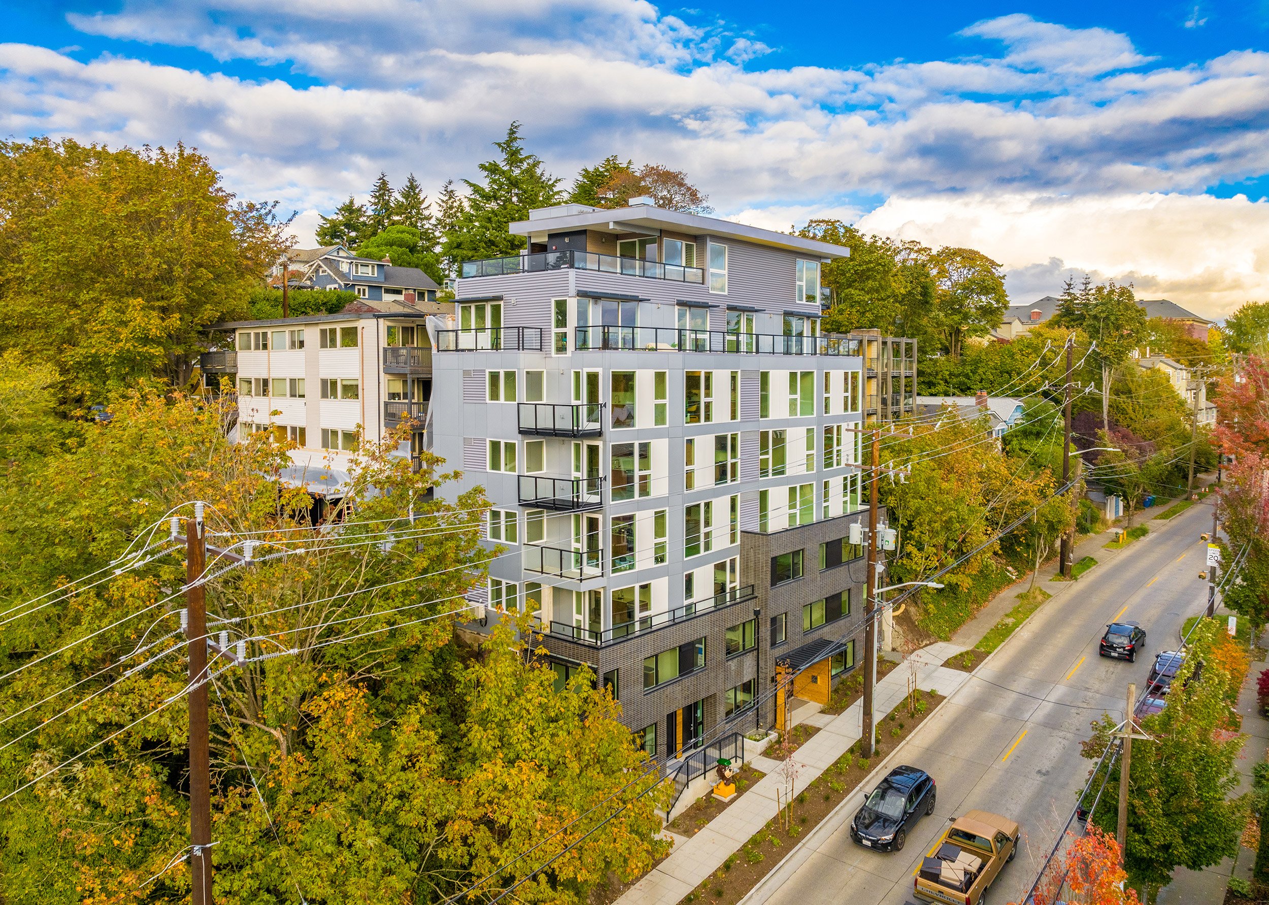 Part of the Fremont View Campus in Seattle’s growing Fremont neighborhood, this project consists of a three unit addition and seismic upgrades to a mid-century apartment building, and a new eight-story building consisting of 29 apartment homes. Because the project site is on a significant slope that was created during the original Seattle street construction, we have employed a terraced design approach to take advantage of the unique terrain, and to integrate the two buildings. Extended information gathering and preliminary design phases allowed us to work through the unique utility and adjacent street complexities, building access, and impacts to adjacent neighbors. The project was completed in October of 2024
