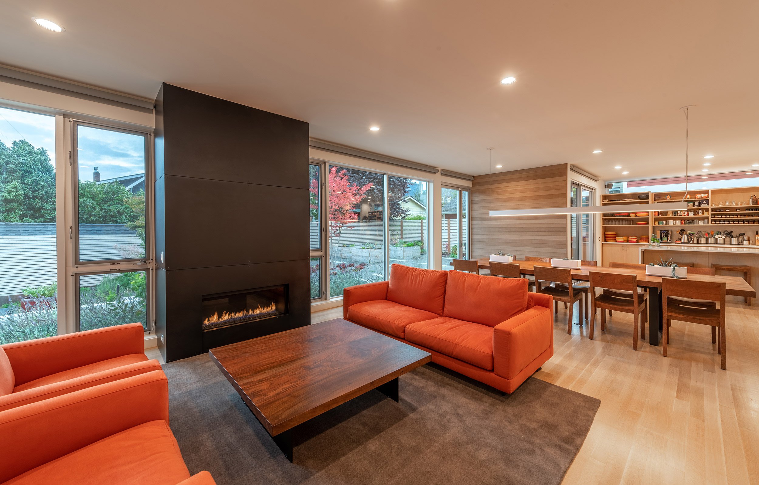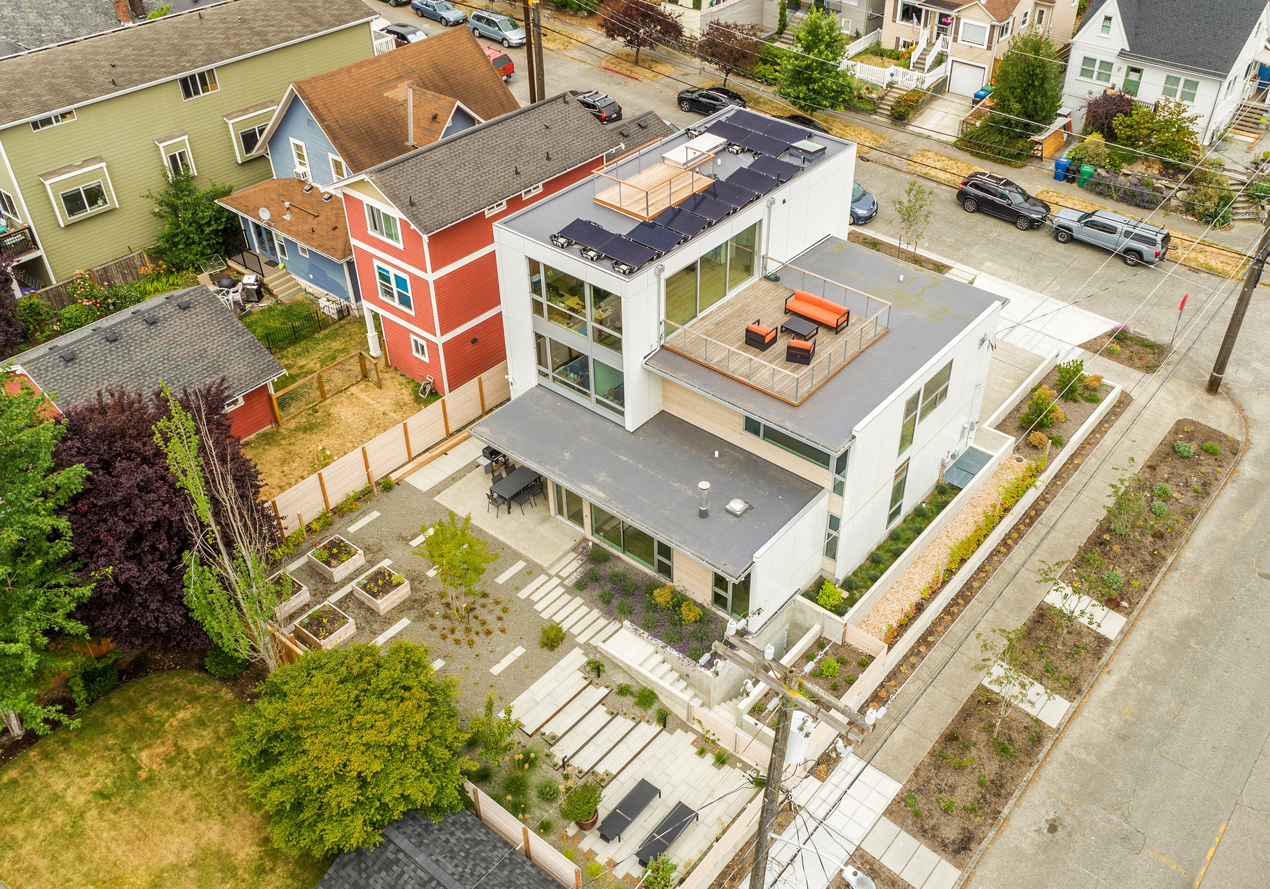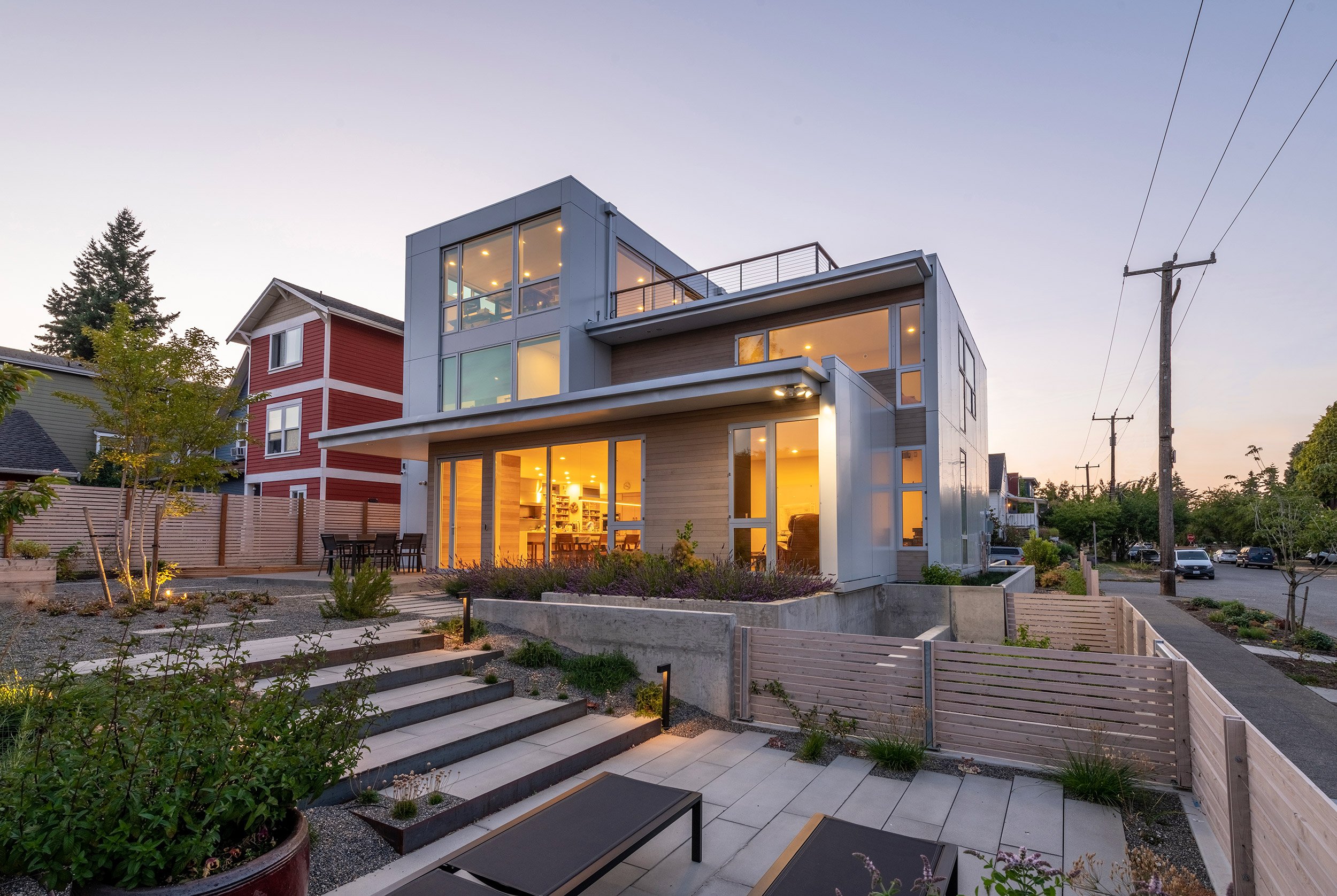 This three-level residence with a full basement boasts a vertical stature to access views from Seattle’s Greenwood neighborhood. Two primary volumes provide a hard edge to the street intersection, and the rear of the structures step down to a southern facing backyard. Crisp white walls create a modern envelope, and long roof eaves provide protection to inset cedar walls. The landscape package draws alignment from the house geometry.