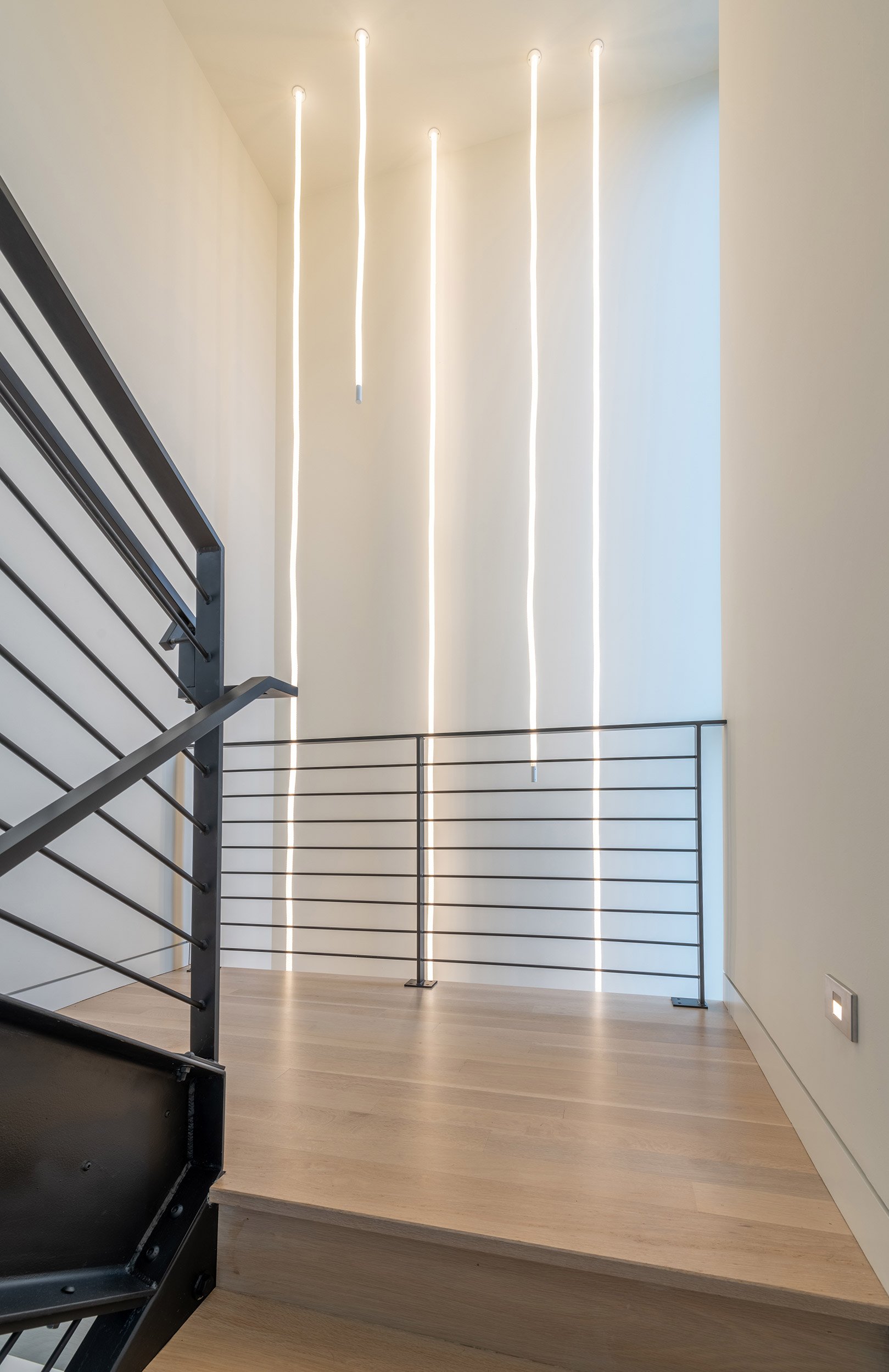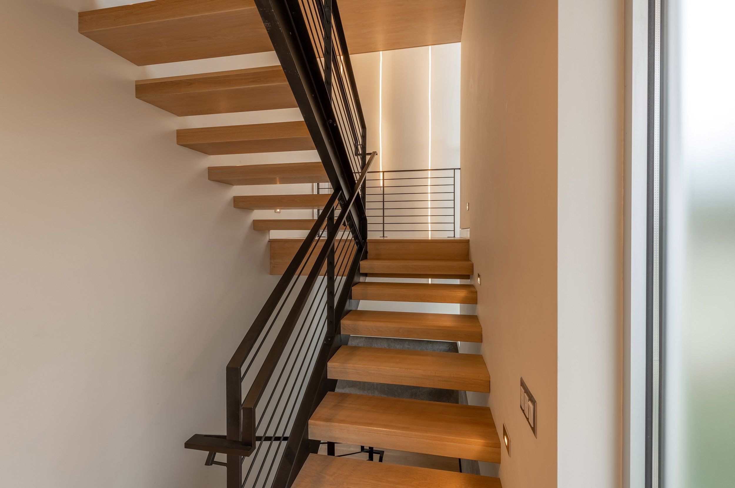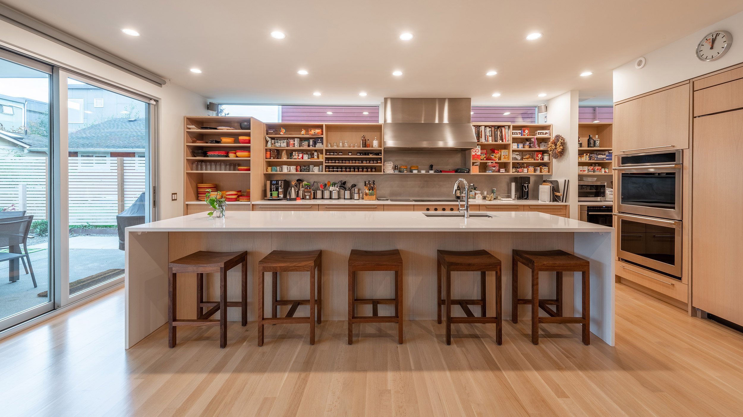 This three-level residence with a full basement boasts a vertical stature to access views from Seattle’s Greenwood neighborhood. Two primary volumes provide a hard edge to the street intersection, and the rear of the structures step down to a southern facing backyard. Crisp white walls create a modern envelope, and long roof eaves provide protection to inset cedar walls. The landscape package draws alignment from the house geometry.