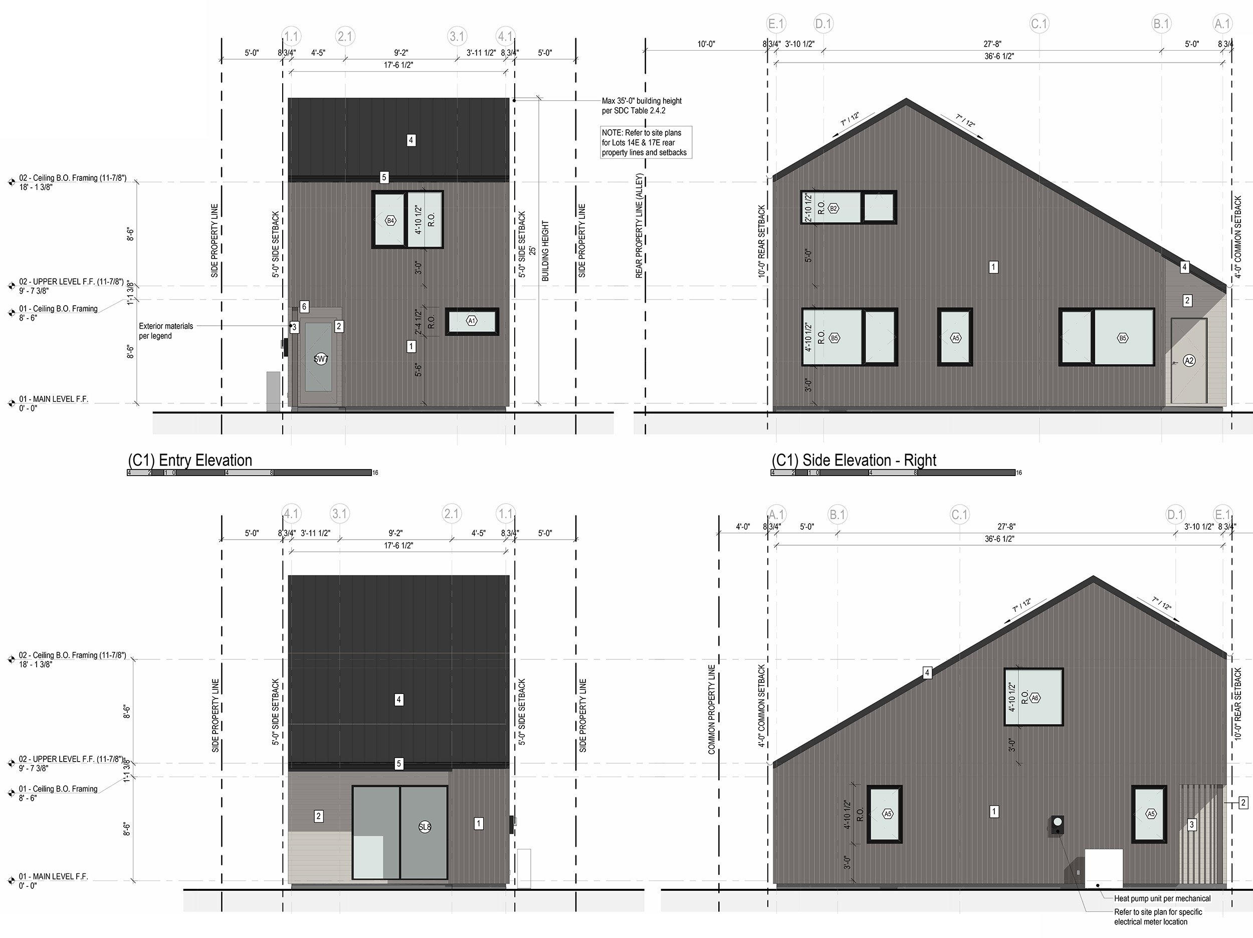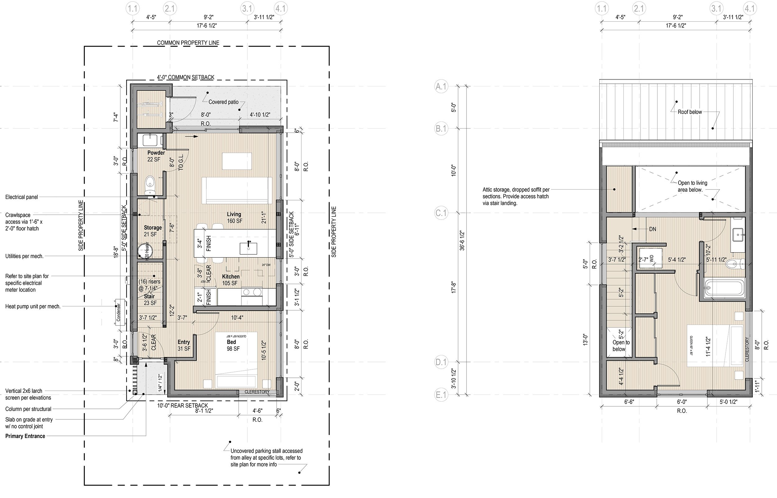 Twelve unique cottage and townhome designs—each named after lumber terms in tribute to the town’s heritage—maximize compact yet efficient footprints within the downtown core. Rather than individual garages, the plan features shared carports and storage facilities to foster a sense of community. The cottages are clad in fire- and pest-resistant wood siding with metal roofs, offering both wildfire resilience and a material palette that recalls the region’s frontier-era architecture. The townhomes feature deep green corrugated siding paired with warm wood porches, reinforcing a cohesive, earth-toned aesthetic throughout the development.
