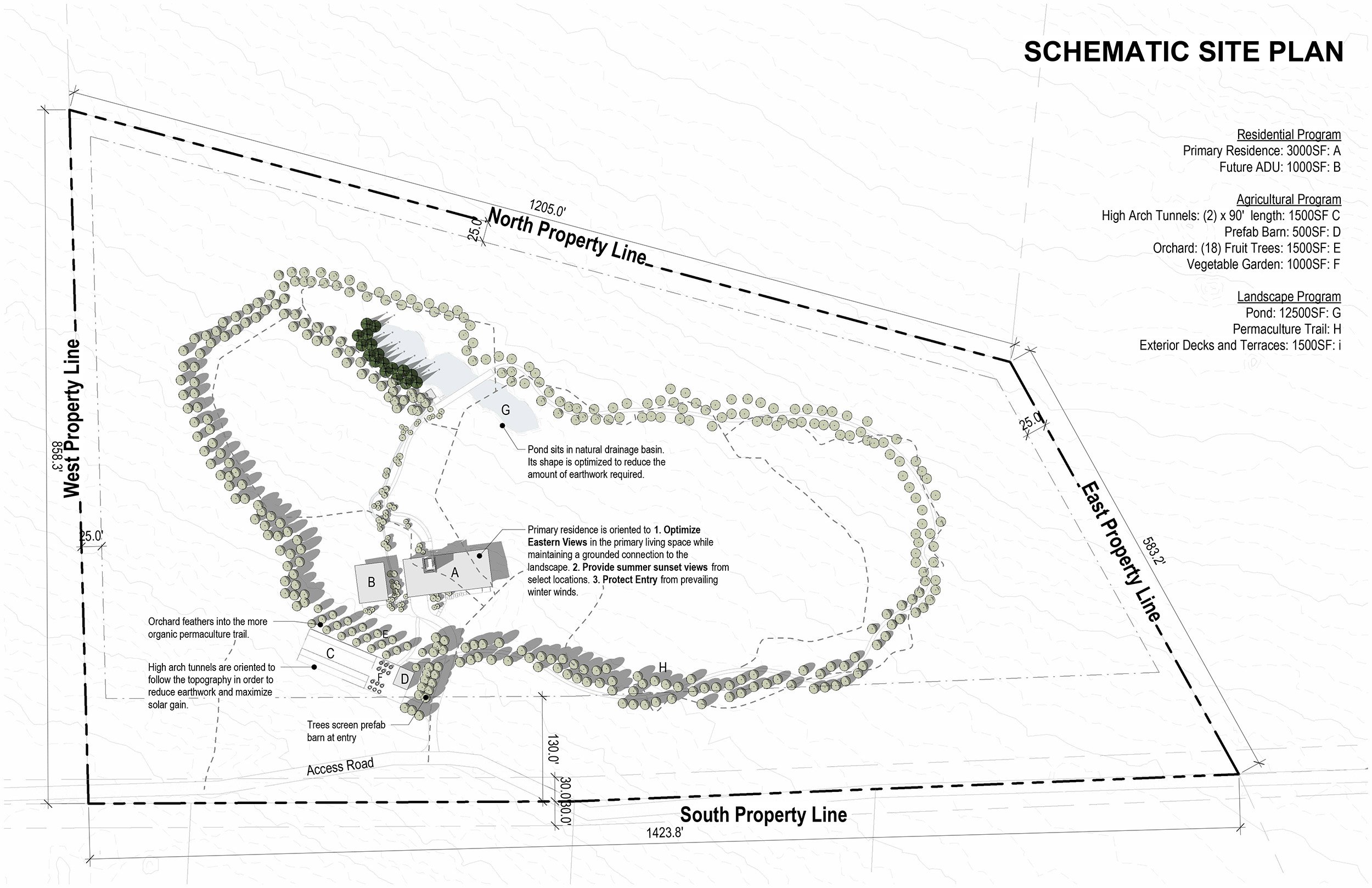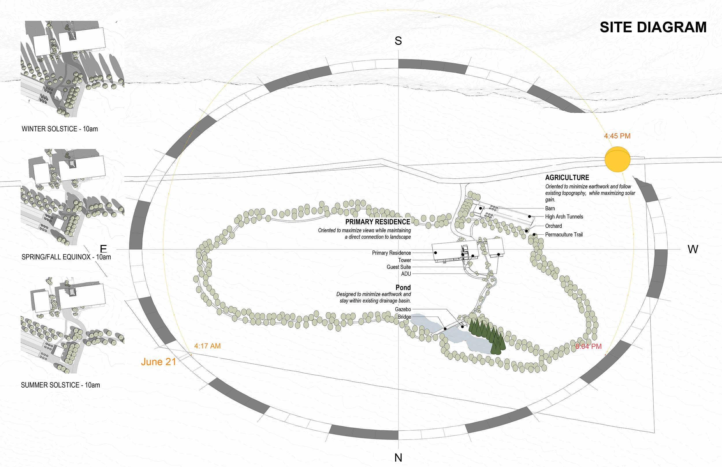 Perched on a 20-acre site at the foothills of the Cascade Mountains, this project weaves a 4,000-square-foot residence into a thoughtfully designed permaculture landscape. The master plan integrates a main residence, guest quarters, greenhouses, an orchard, a permaculture trail, and a barn. The home is carefully sited to cantilever over the forested slope, capturing expansive territorial and mountain views to the east and west. Anchoring the design is an observation tower—a striking architectural feature that offers a daily retreat for taking in sunrises and sunsets. BUILD’s scope includes a feasibility study, comprehensive architectural services, landscape design, and full permitting.