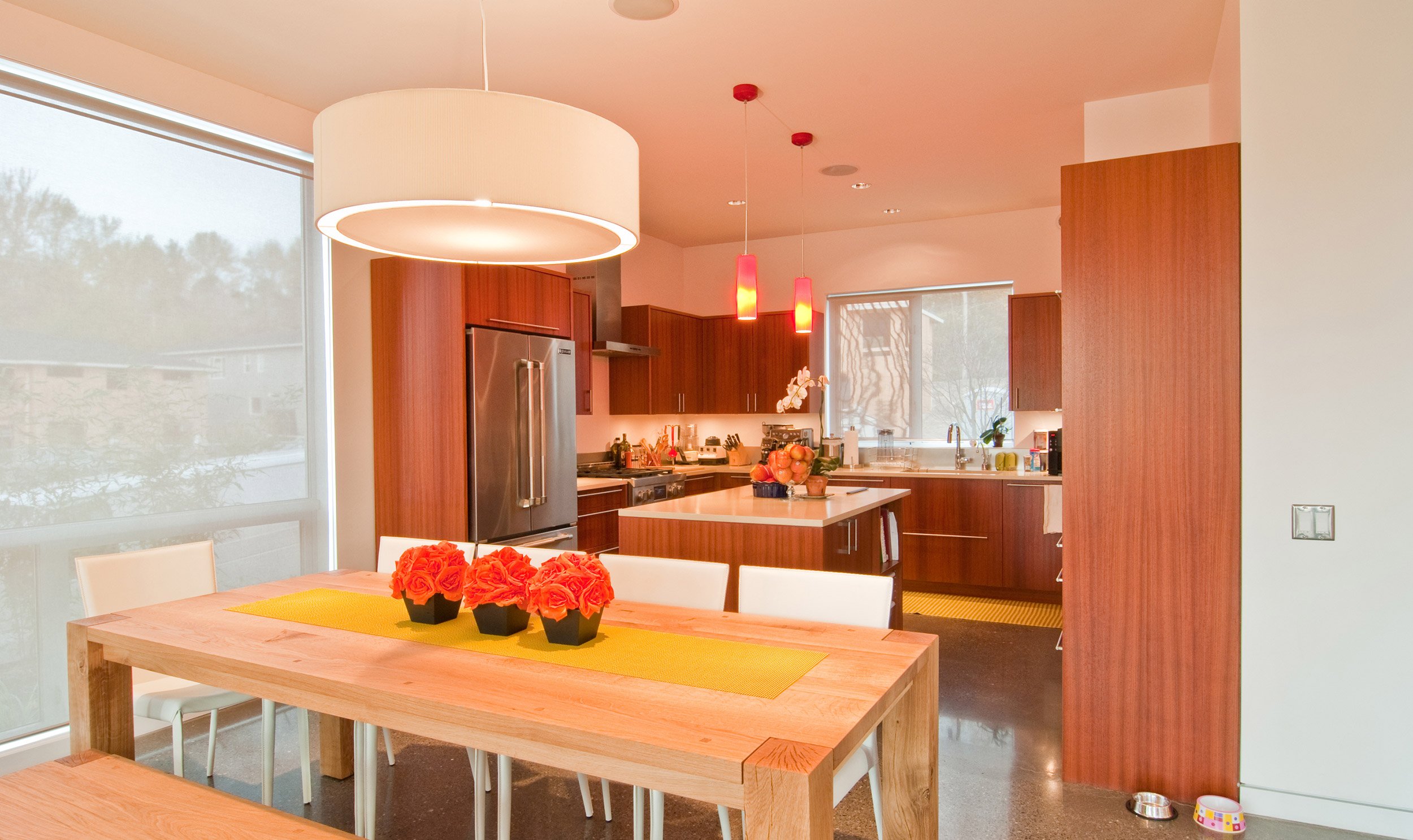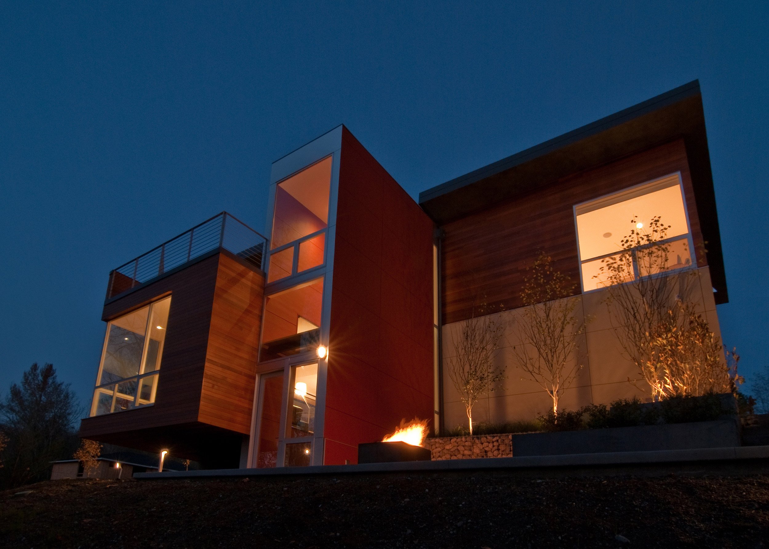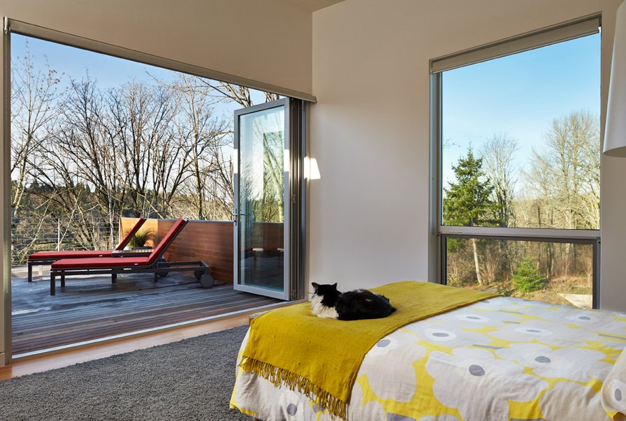 This two-storey home was built on an empty lot in Bellevue, WA. The floor plan is efficient and effective, and includes 2,400-sf of conditioned area, and a two car garage. Inside, the open floor plan allows for smaller, smarter spaces, and the envelope is a simple and elegant translation of the interior functions. The cantilevered living room hovers adjacent to a greenbelt, giving the interior common areas a tree-house-like feel. An open tread stairway is a sculptural feature of the home, and allows unique views to the tree canopy beyond. Floor-to-ceiling windows in the bedrooms allow generous amounts of natural daylight and fresh air.