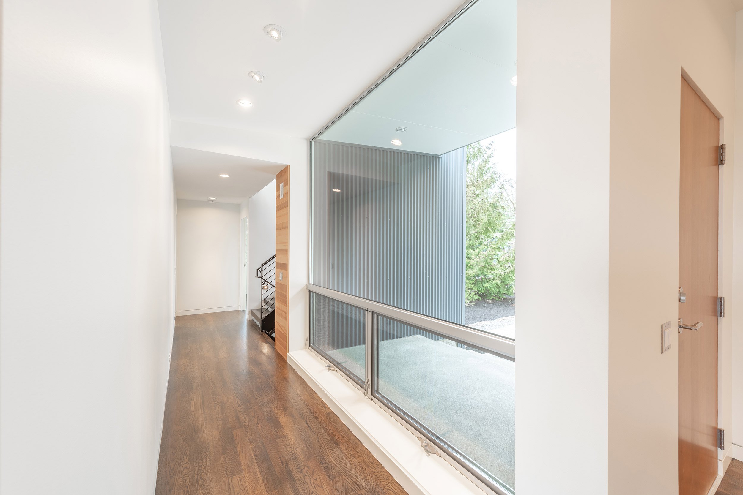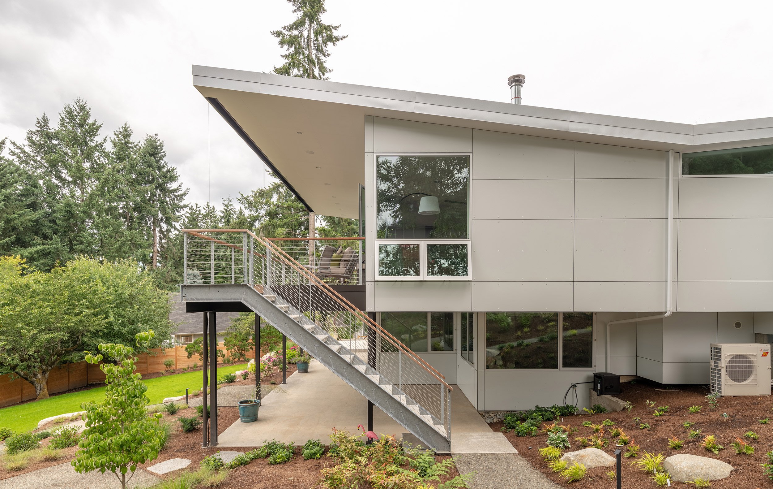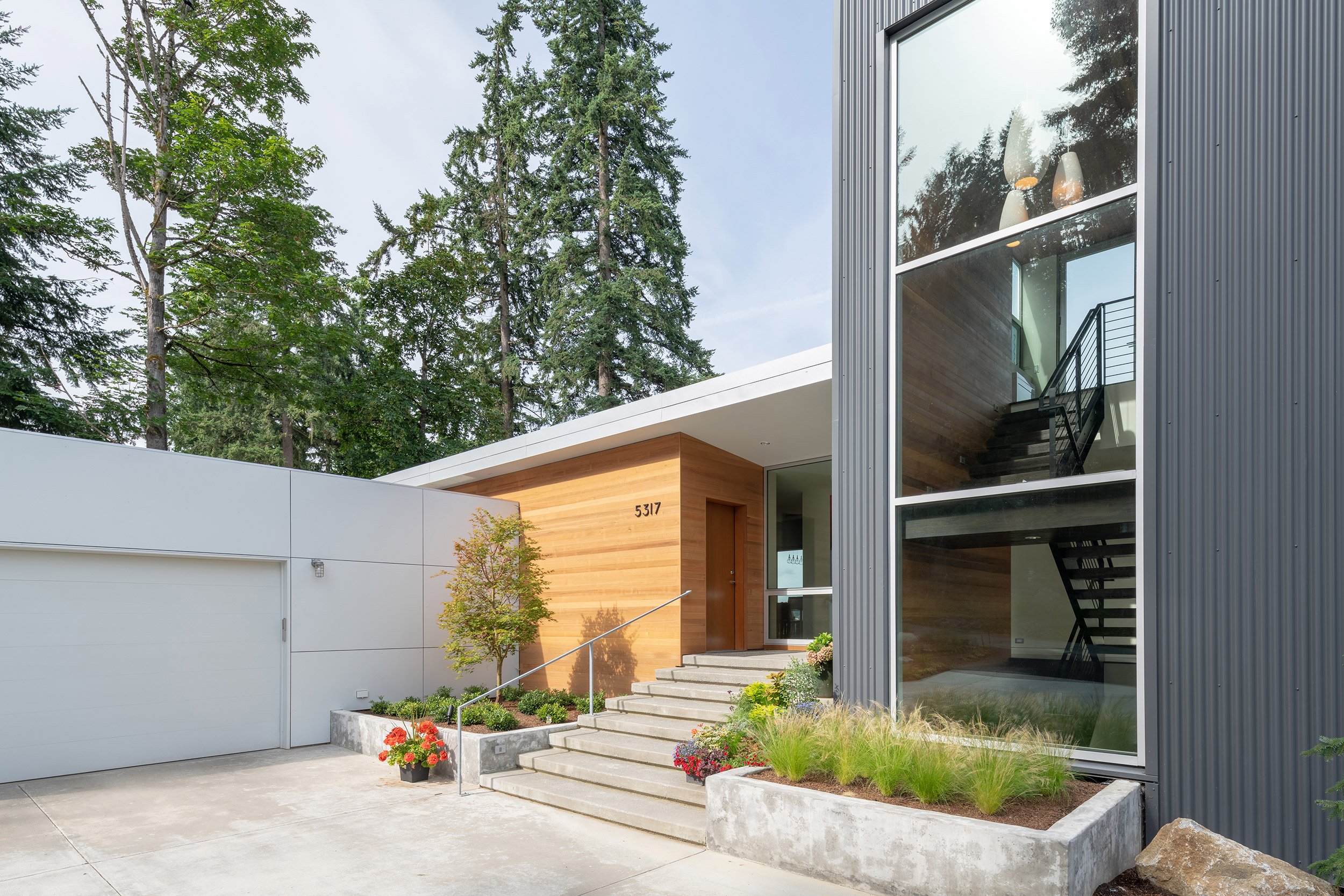 Nestled into a hillside overlooking Lake Sammamish, this residence repurposes an existing foundation, and by keeping the footprint tidy and building up, the structure captures natural light and views. The new framing package increased the interior heights, while reworking the function of the spaces. A third level library brings a strong vertical element to the composition, and a new garage volume emphasizes the horizontal. Aluminum rainscreen and corrugated metal siding systems bookend the primary façade, and warm cedar siding welcomes visitors to the entry.