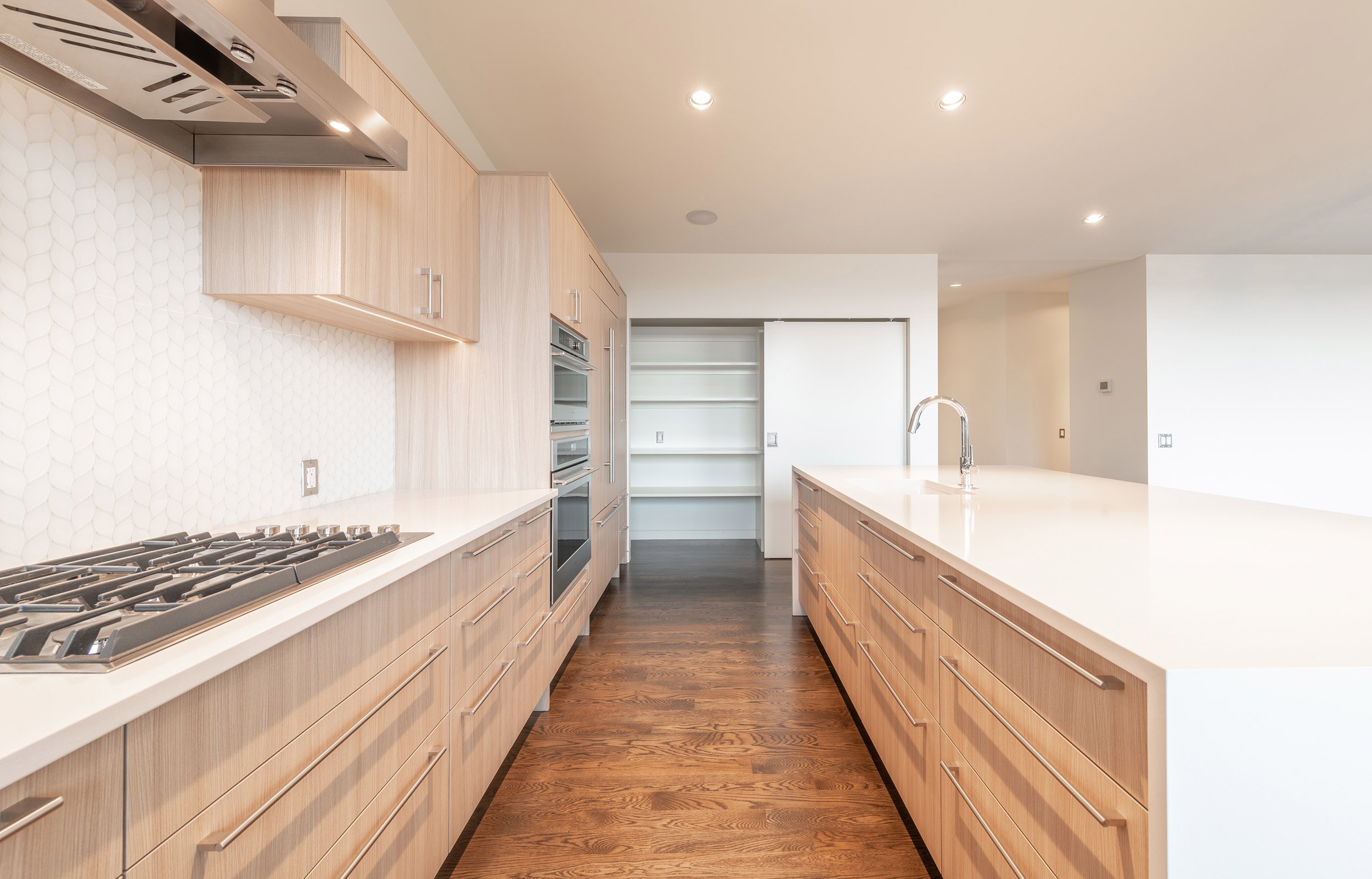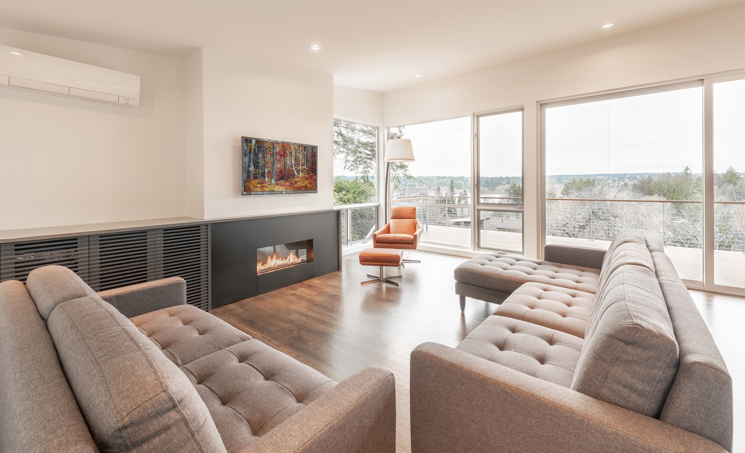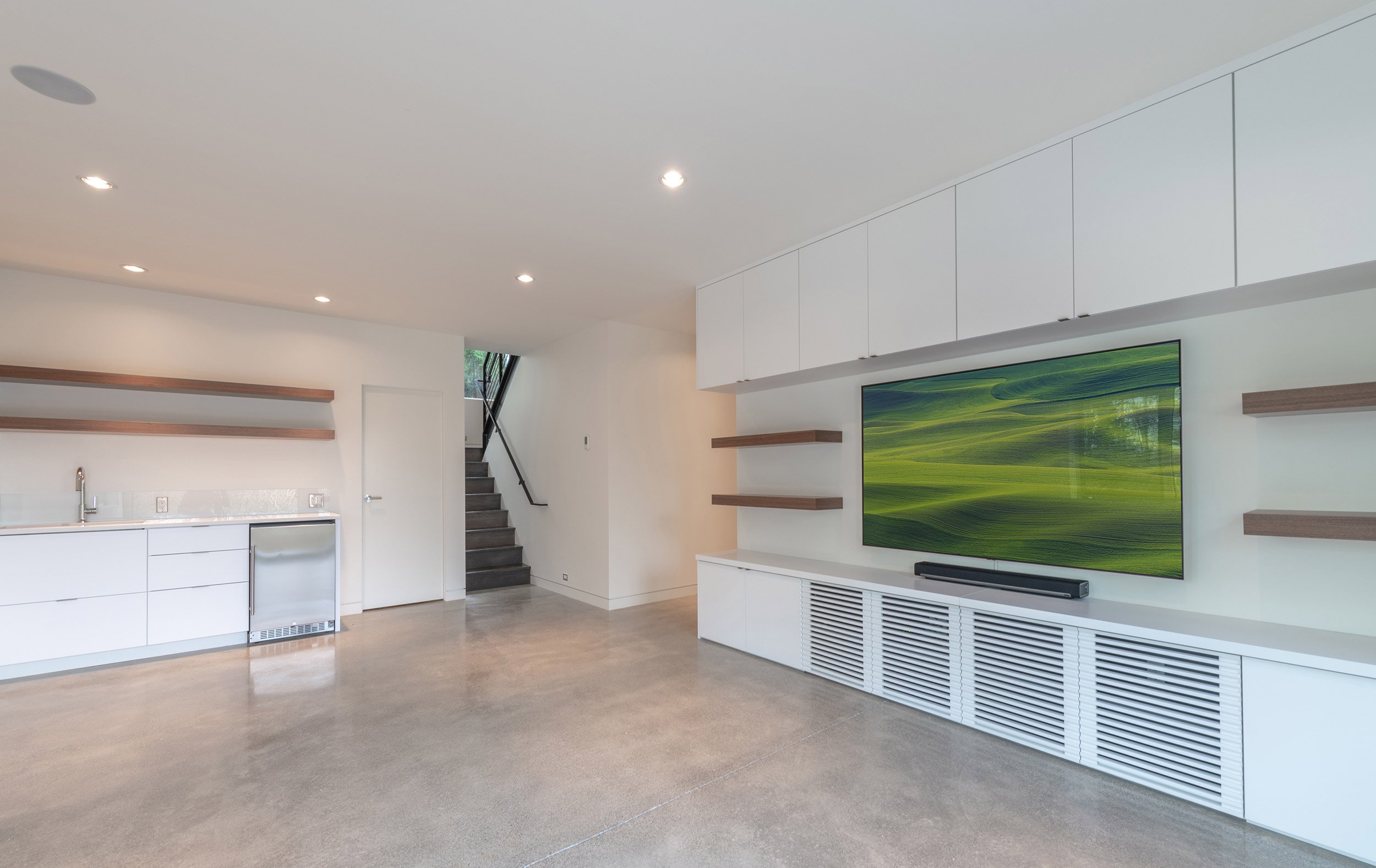 Nestled into a hillside overlooking Lake Sammamish, this residence repurposes an existing foundation, and by keeping the footprint tidy and building up, the structure captures natural light and views. The new framing package increased the interior heights, while reworking the function of the spaces. A third level library brings a strong vertical element to the composition, and a new garage volume emphasizes the horizontal. Aluminum rainscreen and corrugated metal siding systems bookend the primary façade, and warm cedar siding welcomes visitors to the entry.