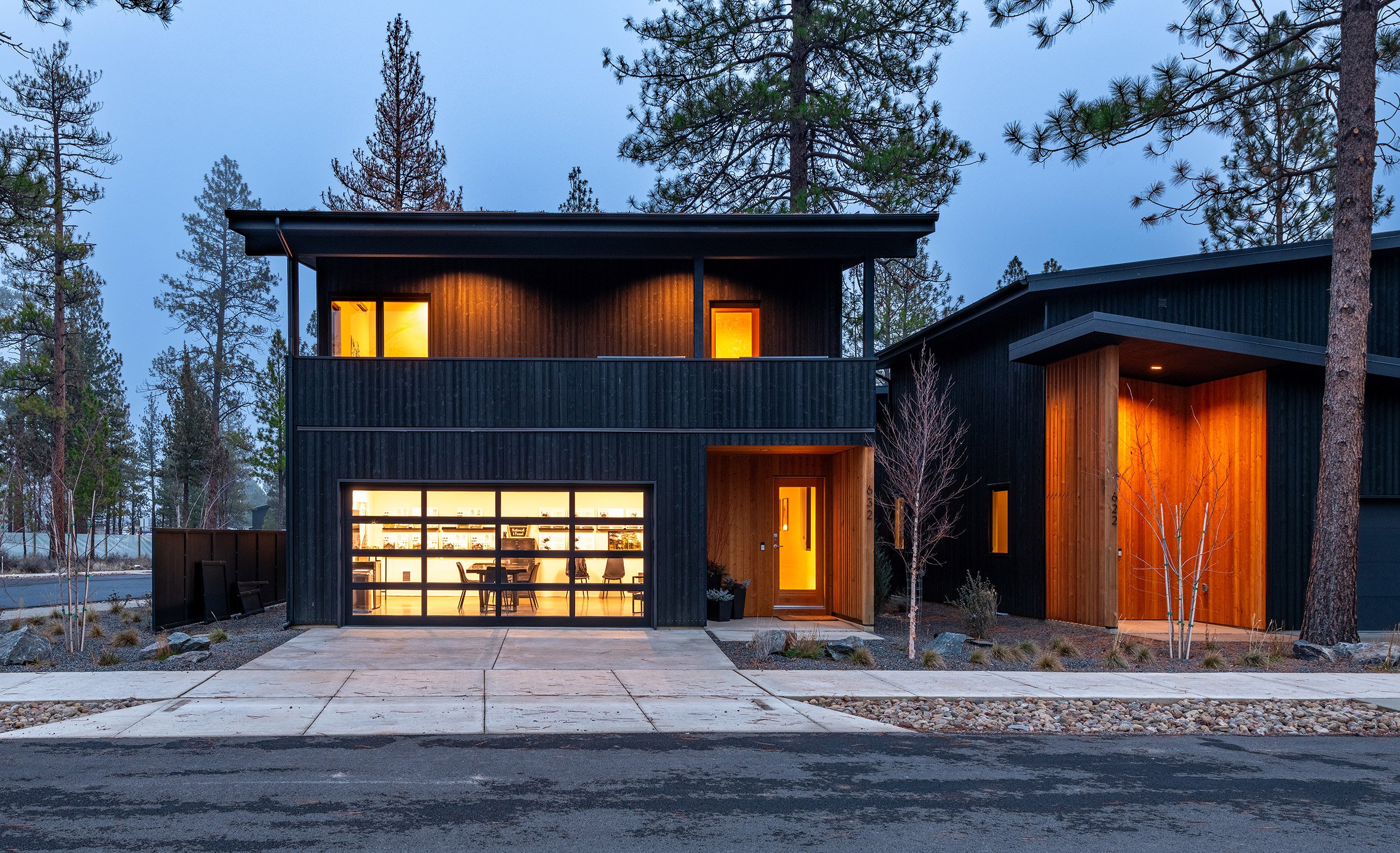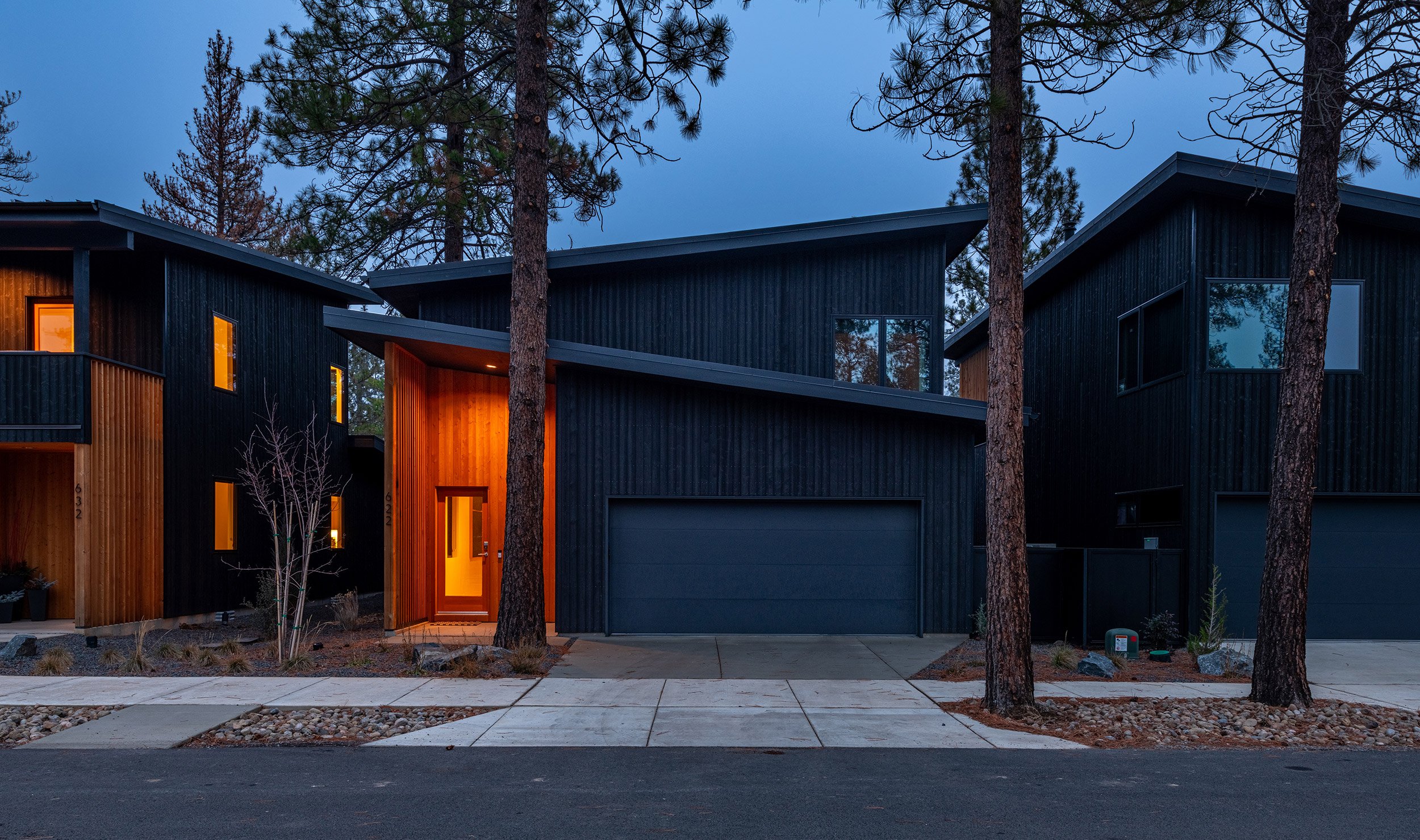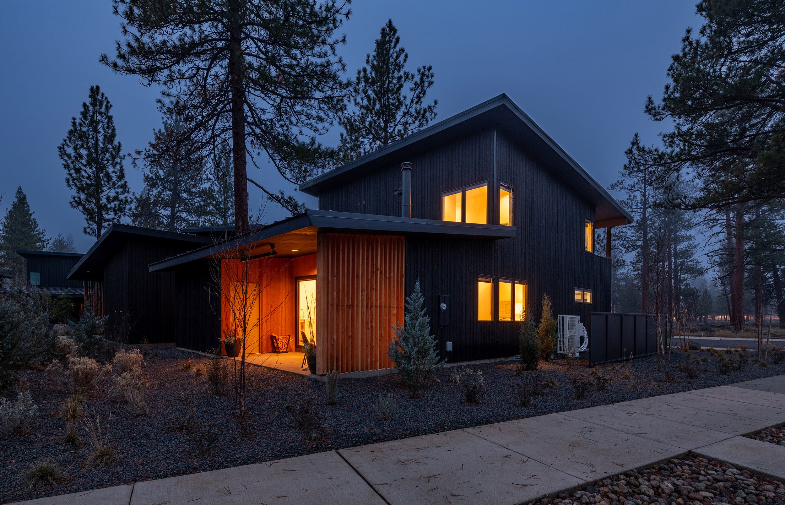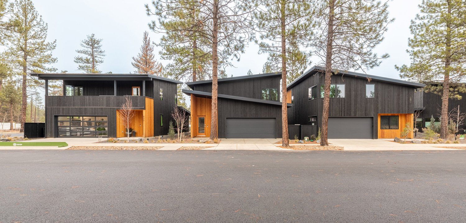 Each cottage is comprised of a minimum of two off-street parking spaces, two bathrooms, two to three bedrooms, and vaulted living, dining and kitchen spaces. The front of each cottage includes a generous covered porch that faces a shared community space, and the rear-facing garages contain modest entrances. The design of the cottages was inspired by the western frontier storefront facades that have historically been used throughout Sisters, and the surrounding mountains that may be viewed prominently from the site.