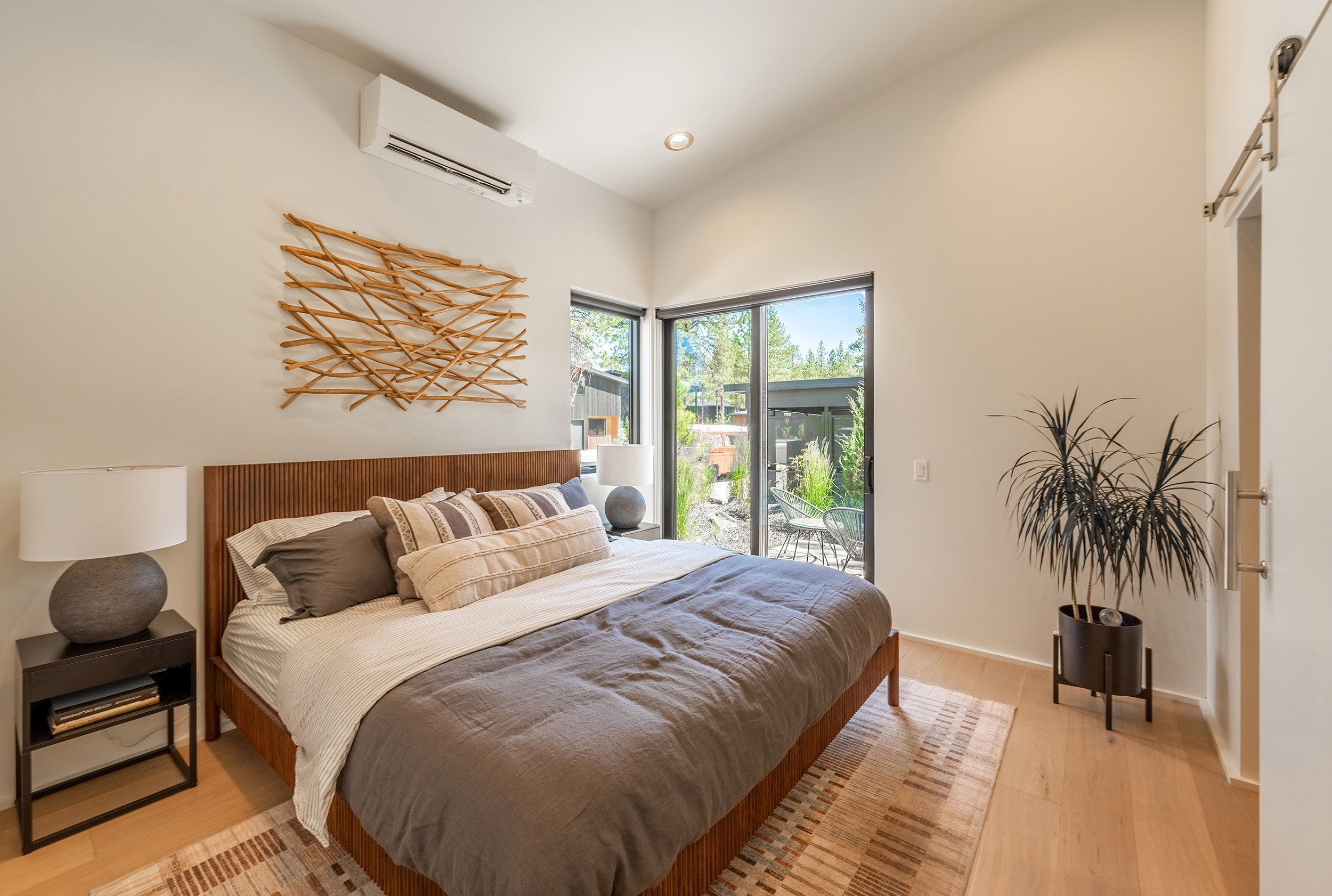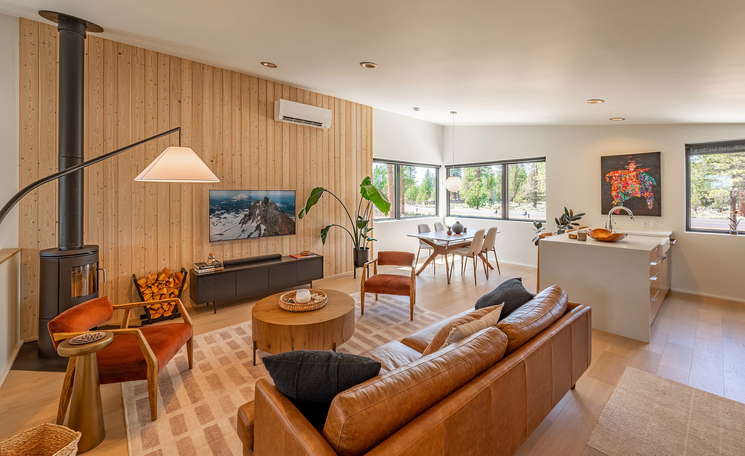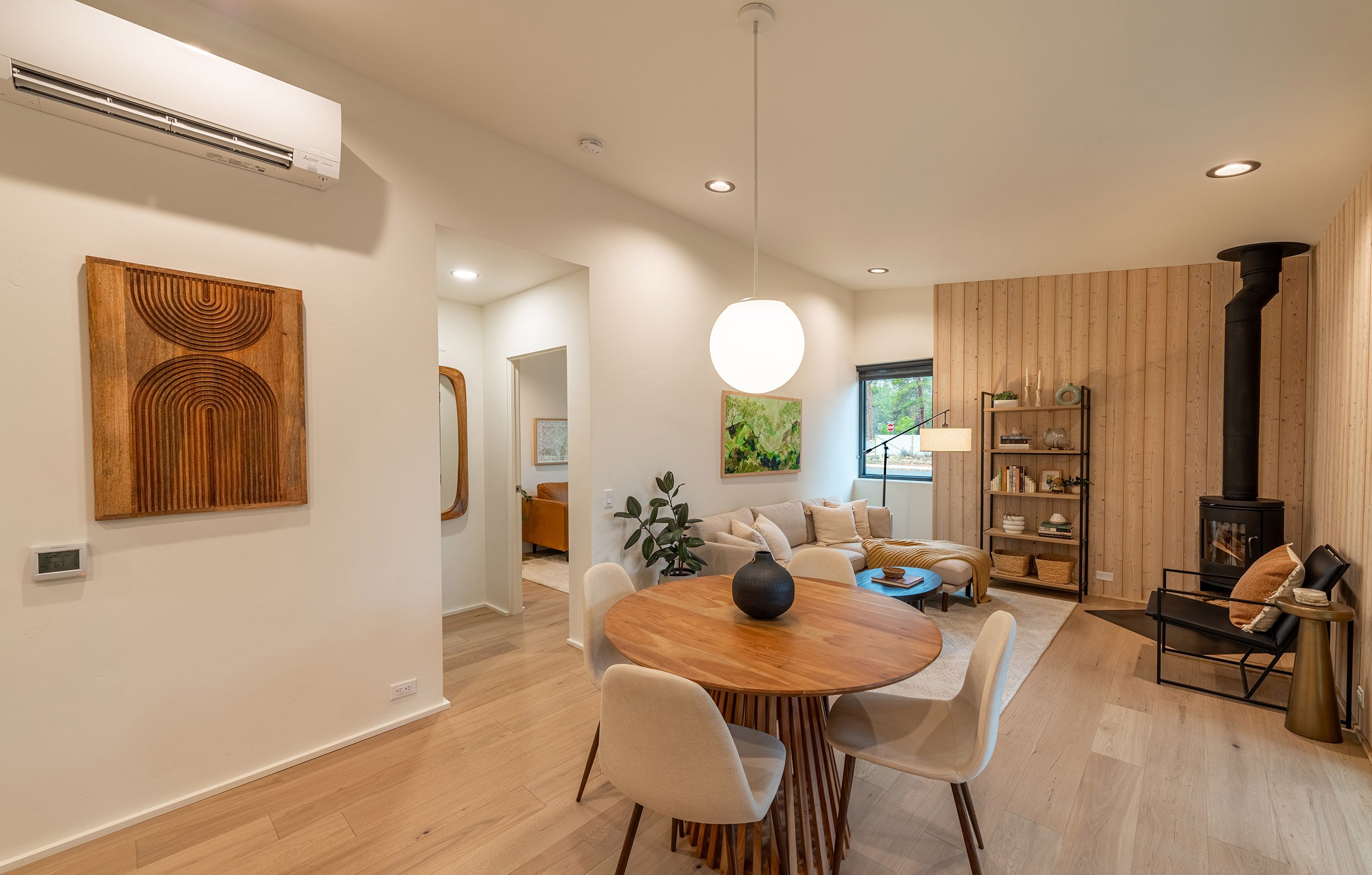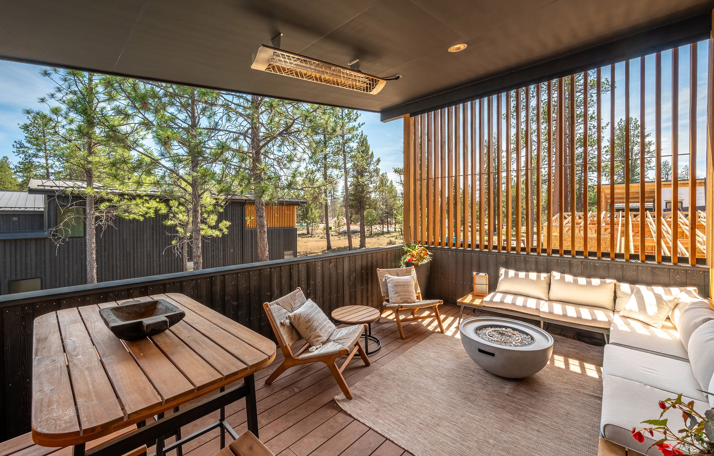Each cottage is comprised of a minimum of two off-street parking spaces, two bathrooms, two to three bedrooms, and vaulted living, dining and kitchen spaces. The front of each cottage includes a generous covered porch that faces a shared community space, and the rear-facing garages contain modest entrances. The design of the cottages was inspired by the western frontier storefront facades that have historically been used throughout Sisters, and the surrounding mountains that may be viewed prominently from the site.