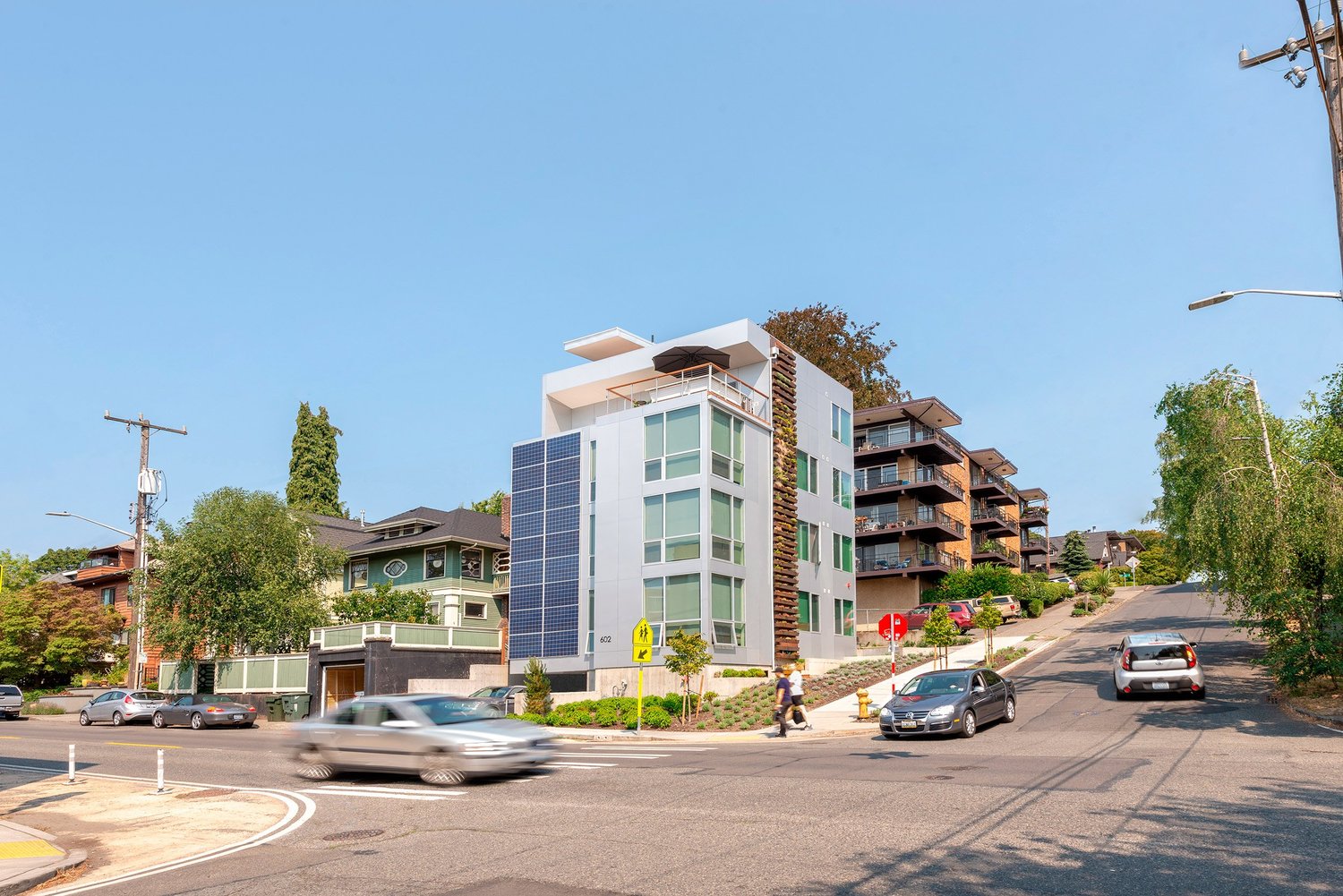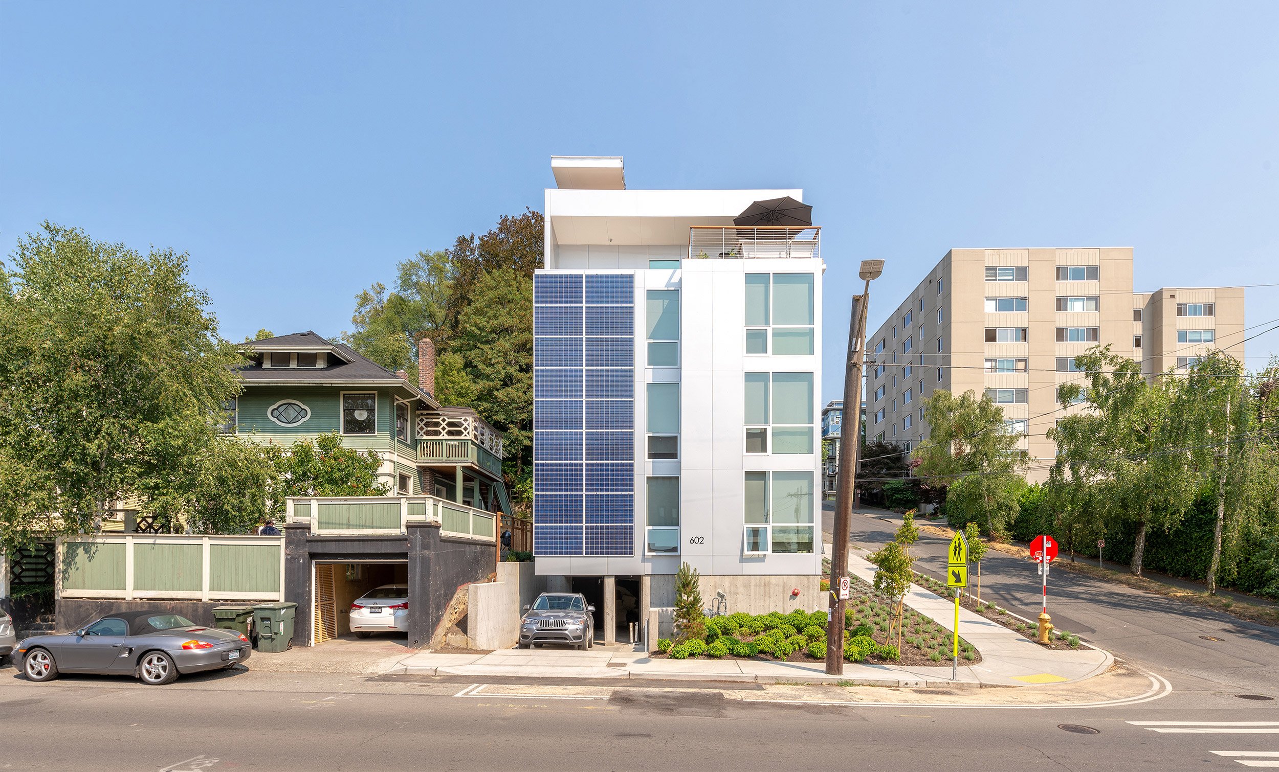 The structure's massing responds directly to the numerous regulatory and utility constraints on the small site. The finished envelope consists of metal windows, and a neutral background of aluminum panels that are punctuated by functional and dynamic photo-voltaic sheets and living green walls. The building systems and interiors were carefully designed and assembled to minimize energy use, and maximize comfort and durability. The 602 Flats are certified Built Green 4-Star.