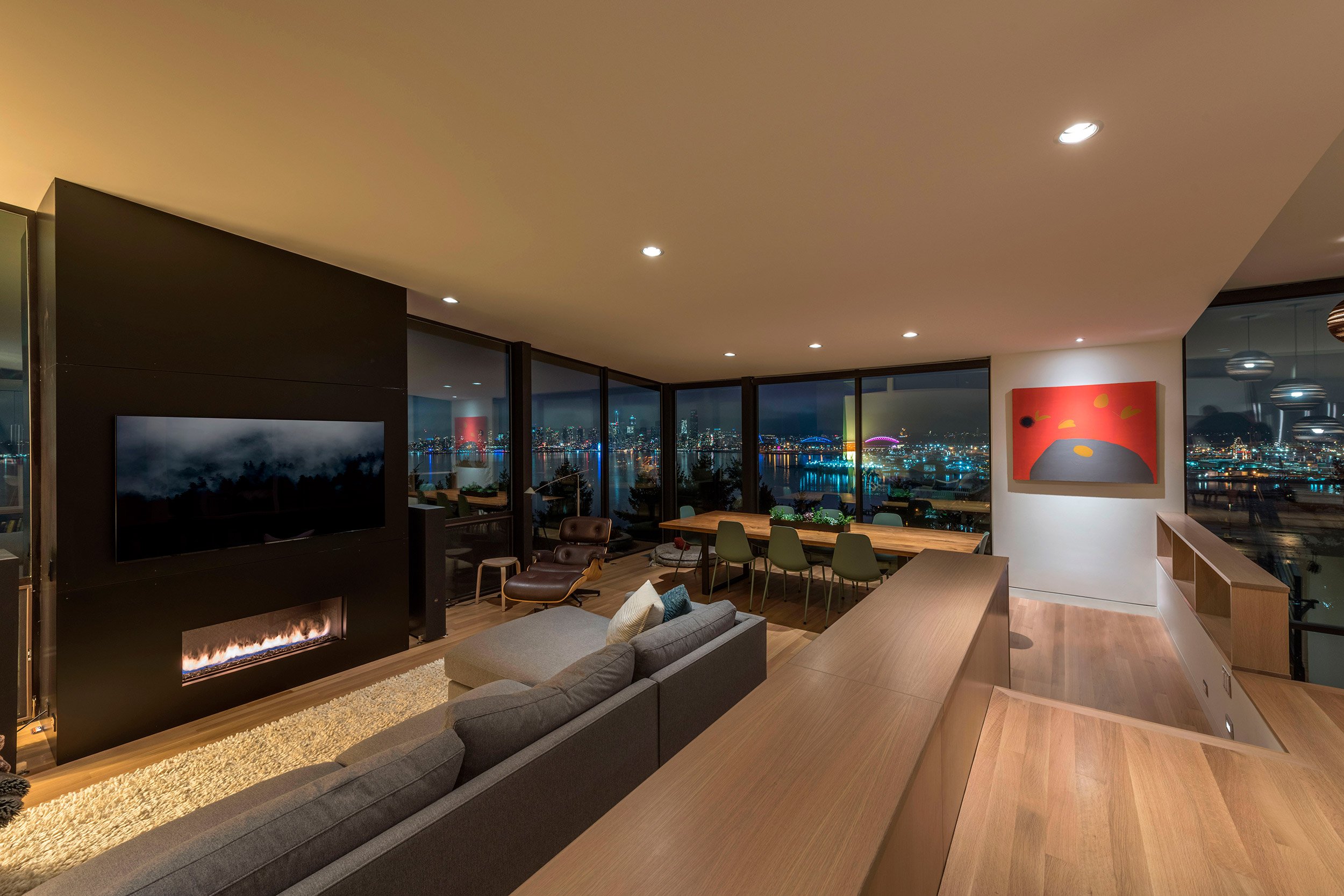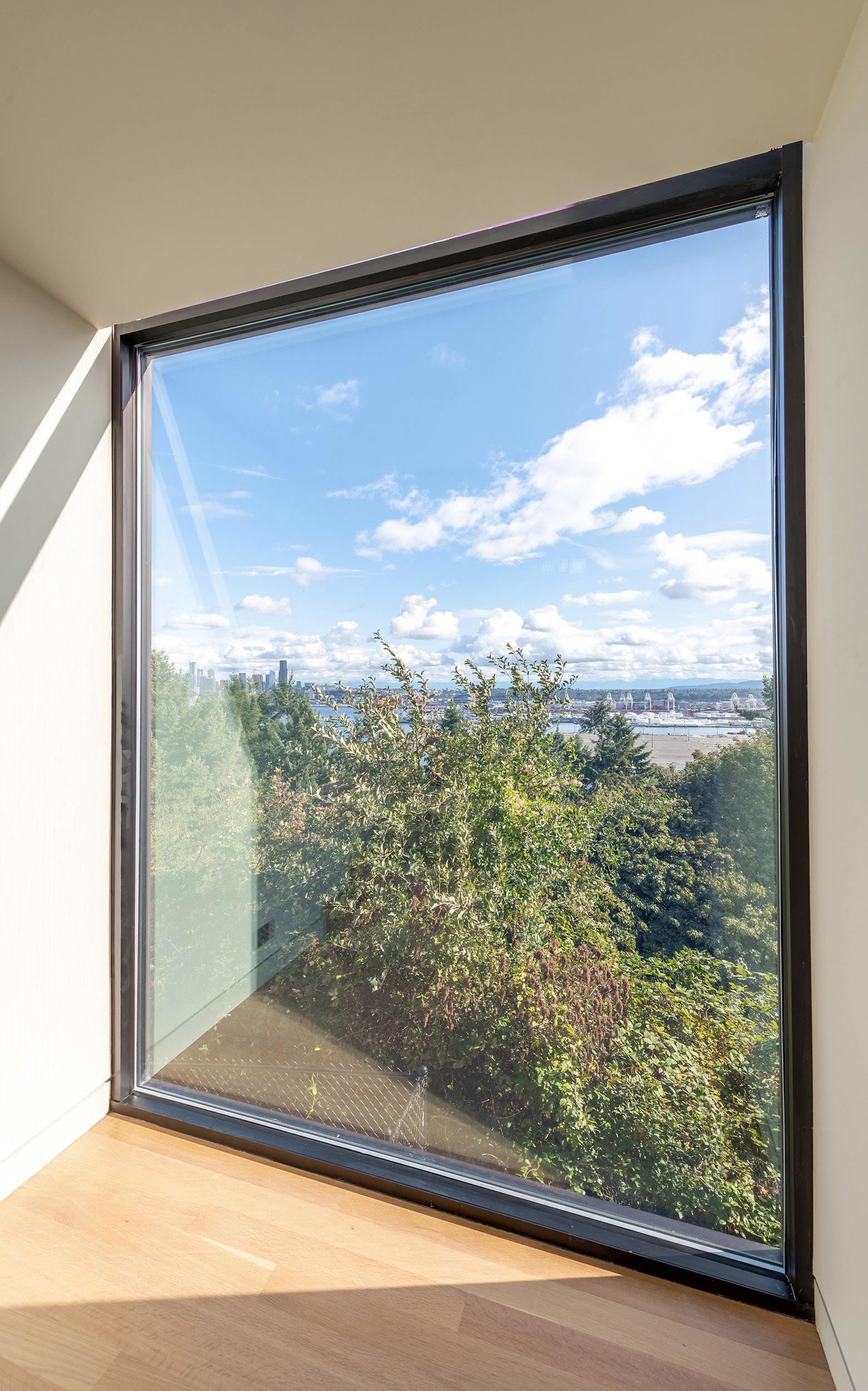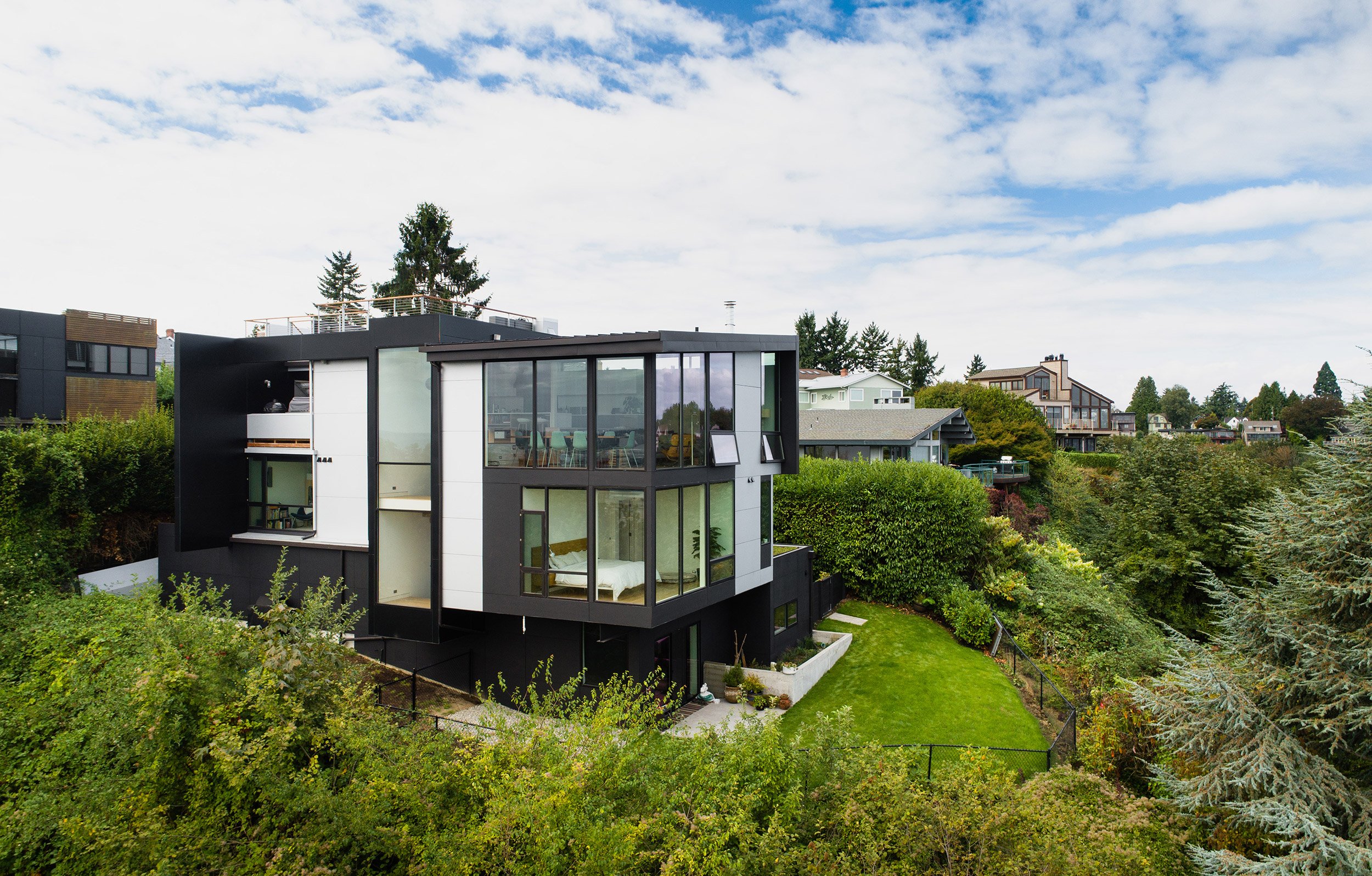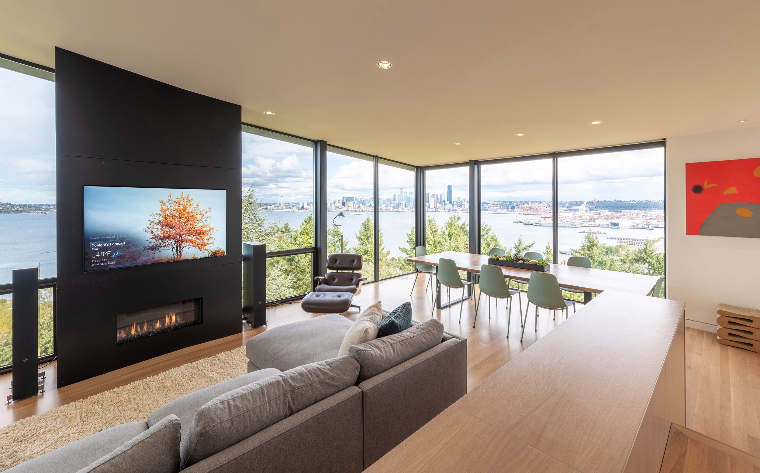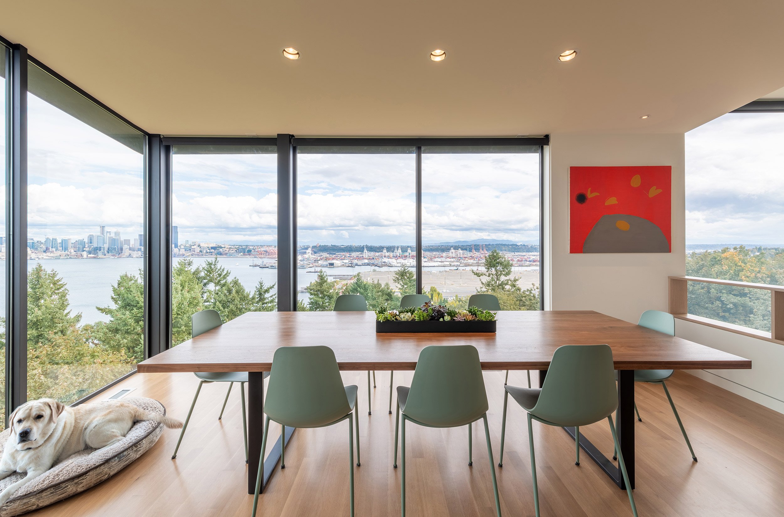Perched on West Seattle’s northeast facing bluff, the design for this house centers around a stunning view of Harbor Island, Seattle, the Puget Sound, and the Olympic Mountains. It reuses an existing foundation, and follows the original footprint of the previous structure. A reverse floor plan allows the kitchen, dining, and living areas to maximize views and natural light. Bedrooms were designed into the mid-level, and a ground-floor lounge connects with the landscape. The envelope was designed to provide maximum daylight and views to the north and east, while the south and west maintain privacy.