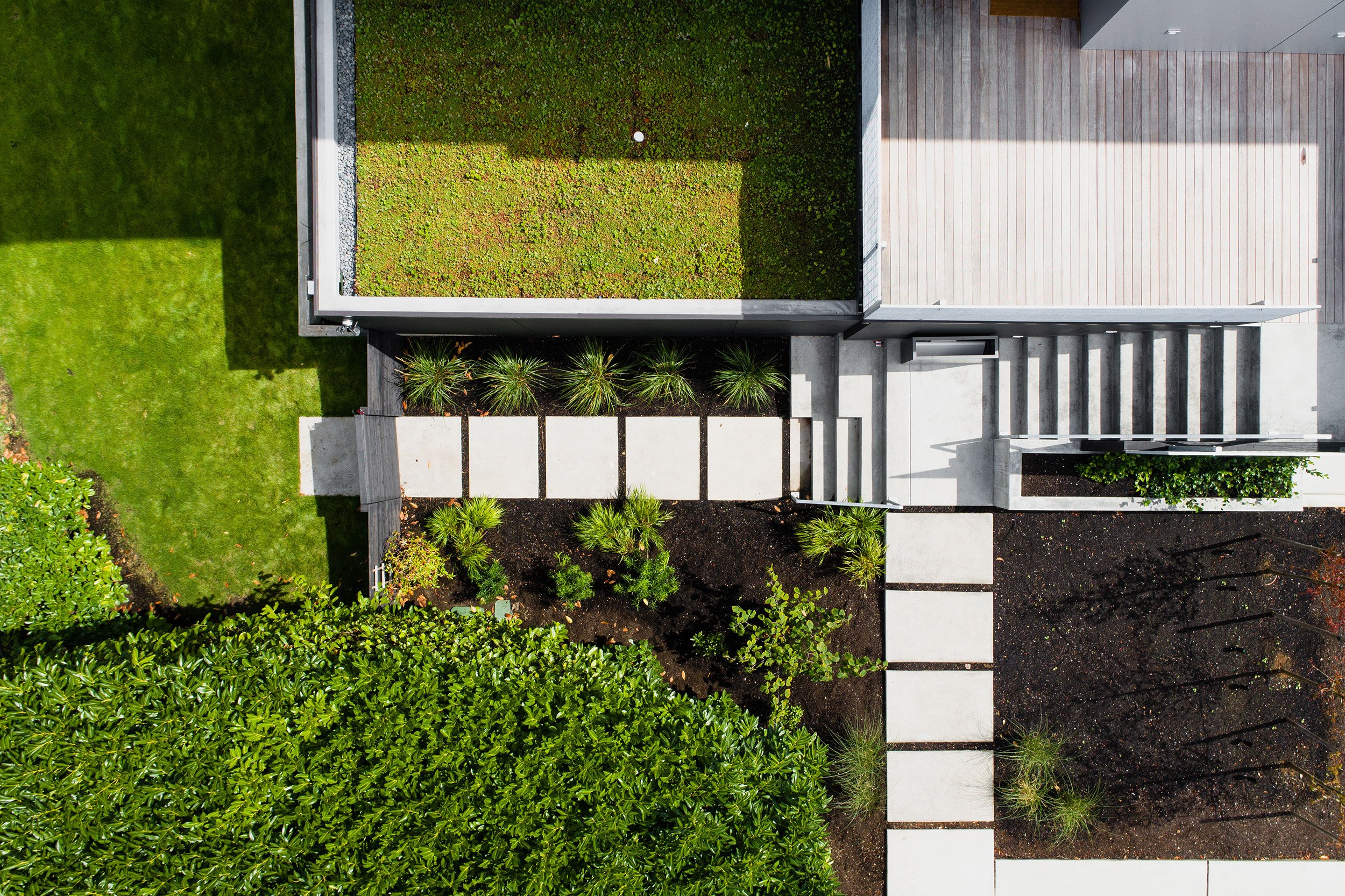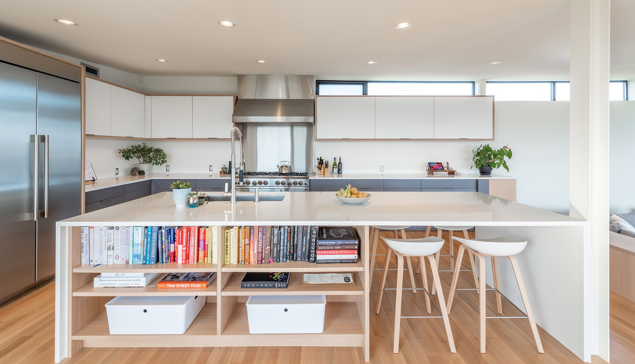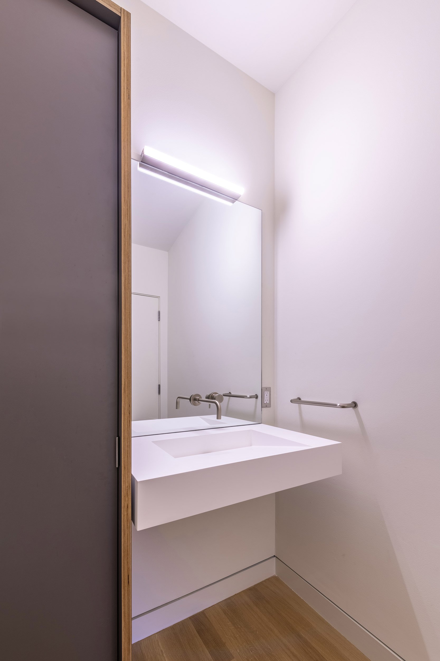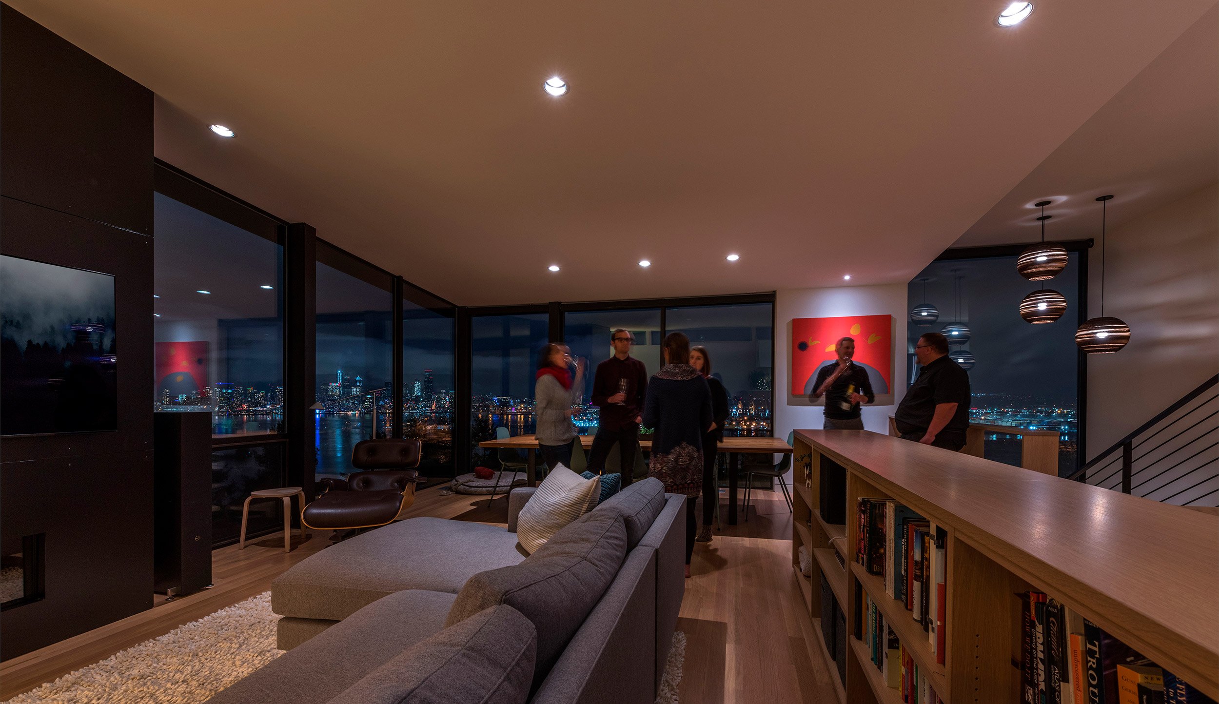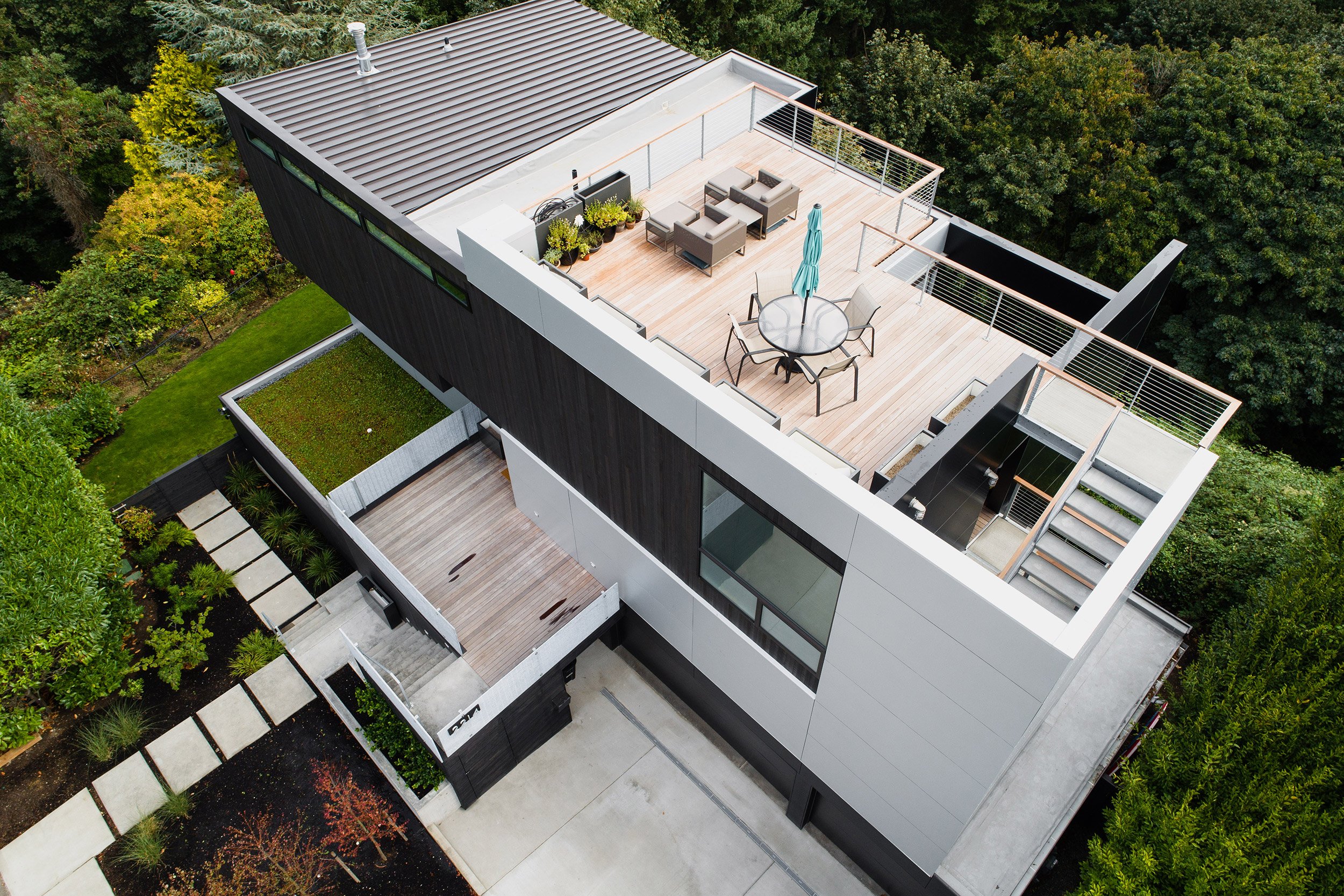 Perched on West Seattle’s northeast facing bluff, the design for this house centers around a stunning view of Harbor Island, Seattle, the Puget Sound, and the Olympic Mountains. It reuses an existing foundation, and follows the original footprint of the previous structure. A reverse floor plan allows the kitchen, dining, and living areas to maximize views and natural light. Bedrooms were designed into the mid-level, and a ground-floor lounge connects with the landscape. The envelope was designed to provide maximum daylight and views to the north and east, while the south and west maintain privacy.