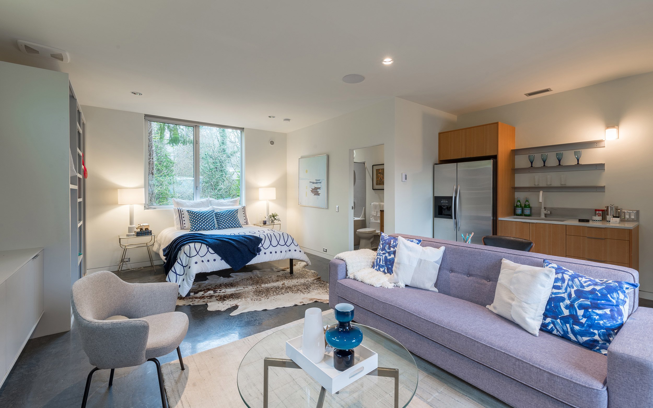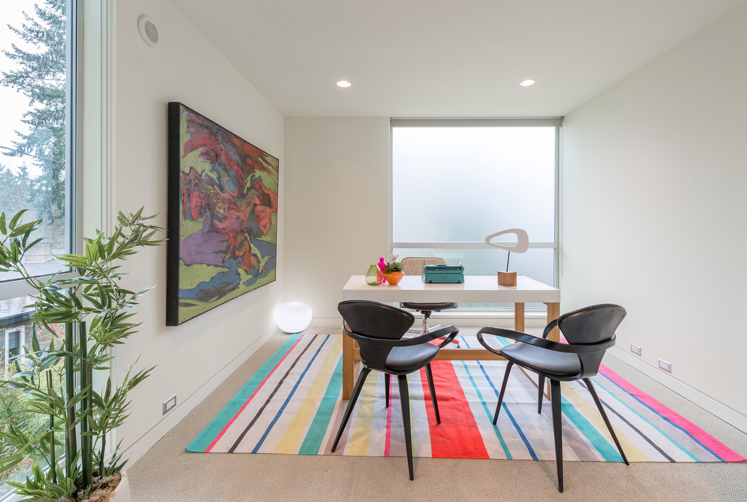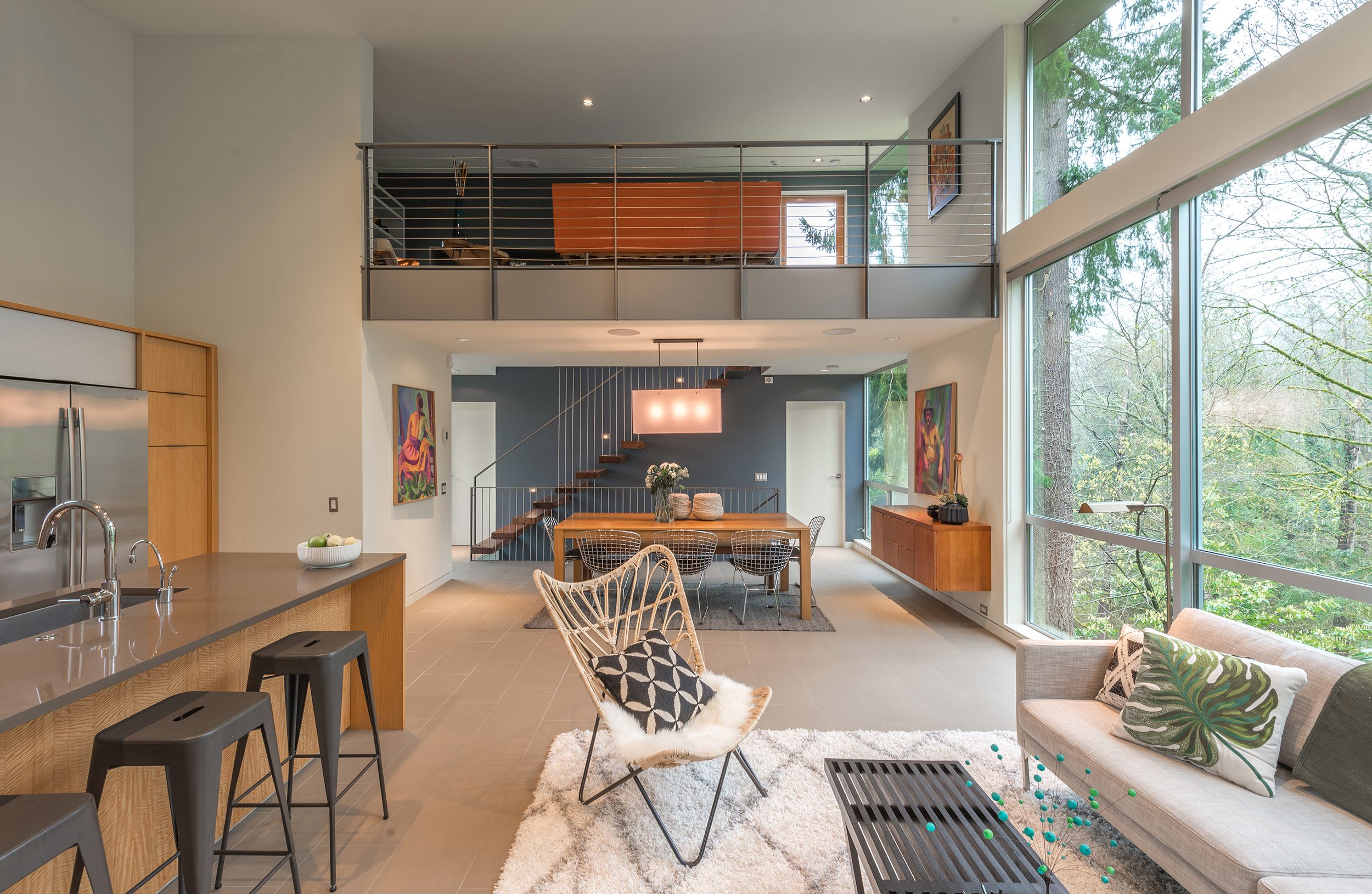 The 2,200-sf residence, with additional 700-sf flex space for shop and studio, is a design-build-development project, and the first realization of our Case Study House series. The project takes advantage of a rare, private, wooded site directly above the Thornton Creek watershed. The flexible program allows for urban family living, and a provision for a separate apartment at the ground level for an aging relative. The lofted living space provides an abundance of natural light, while providing framed views to the forest beyond. Exterior and interior finishes are carefully selected for durability, warmth, and timelessness: clean modernism that will last deep into the 21st century and beyond.
