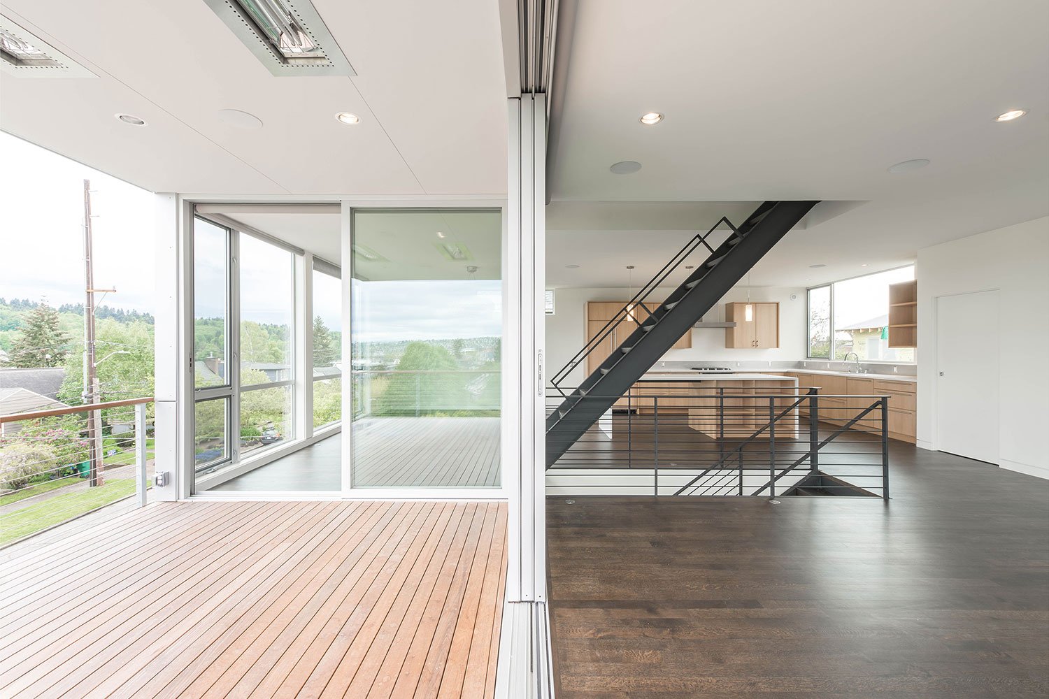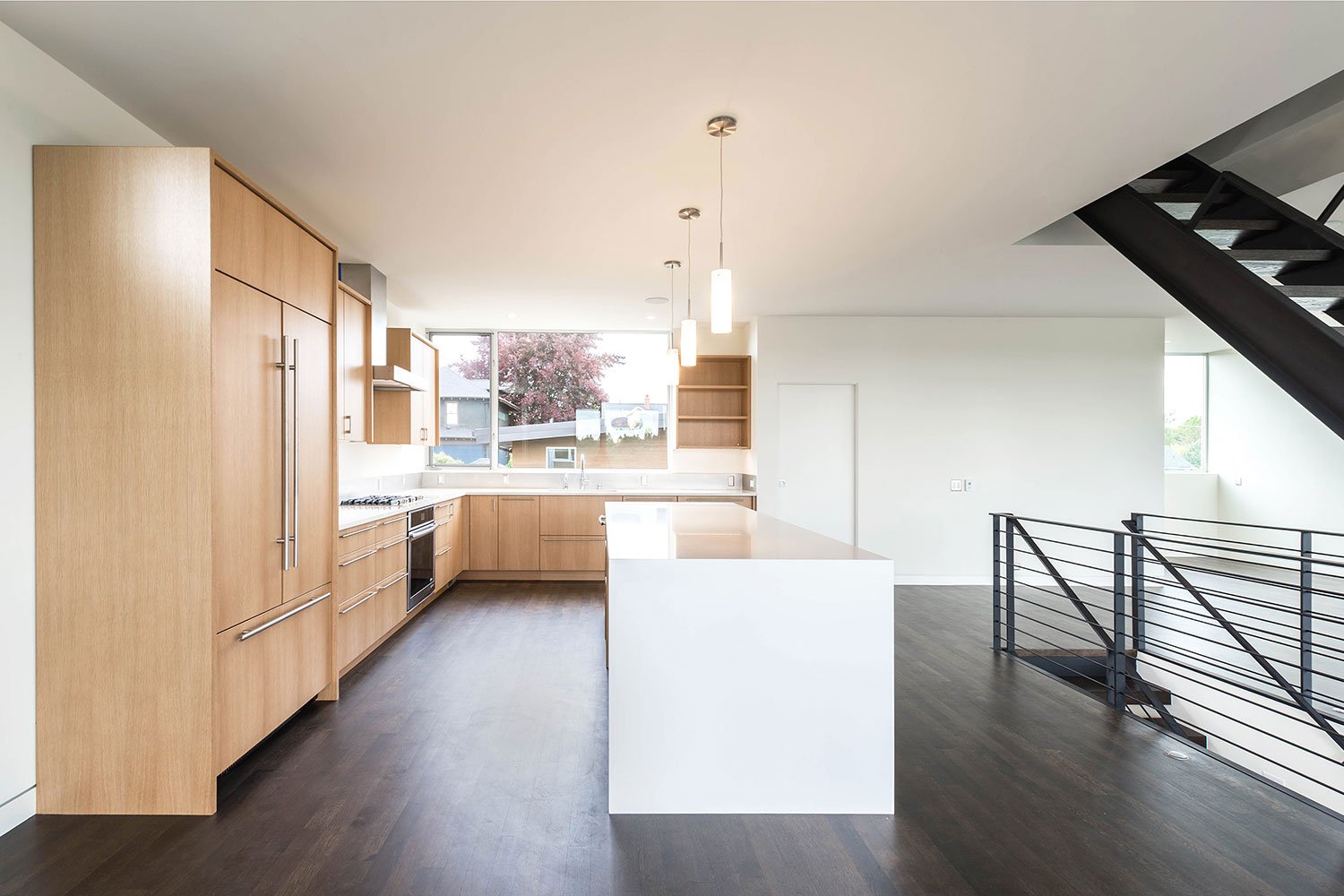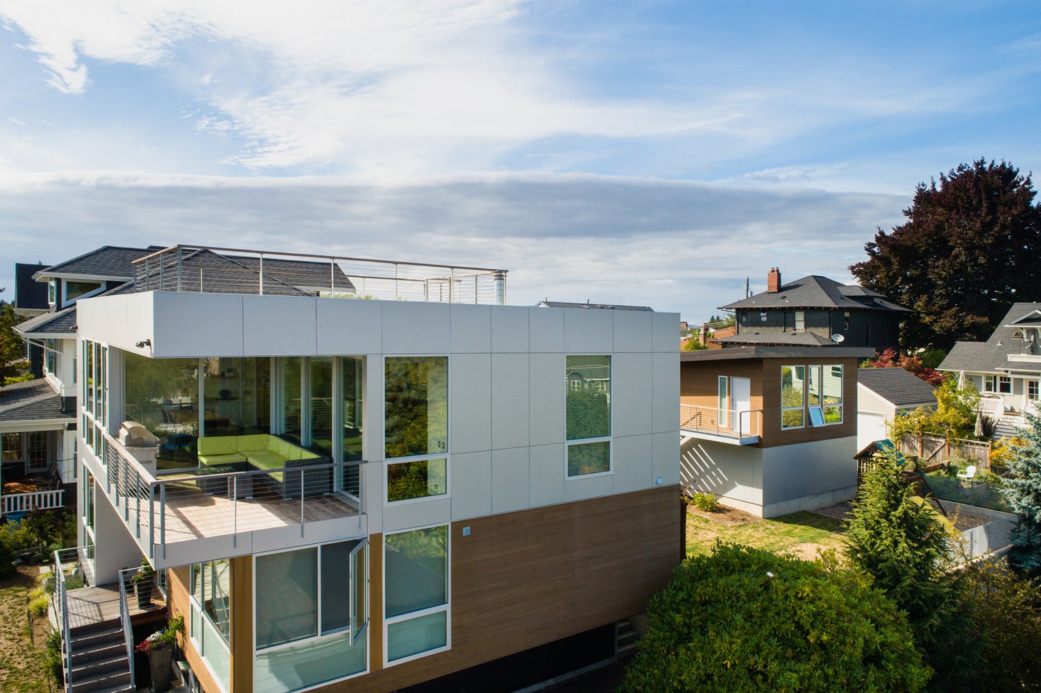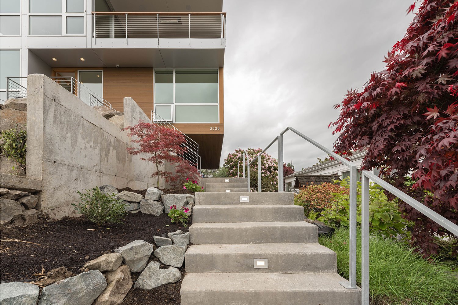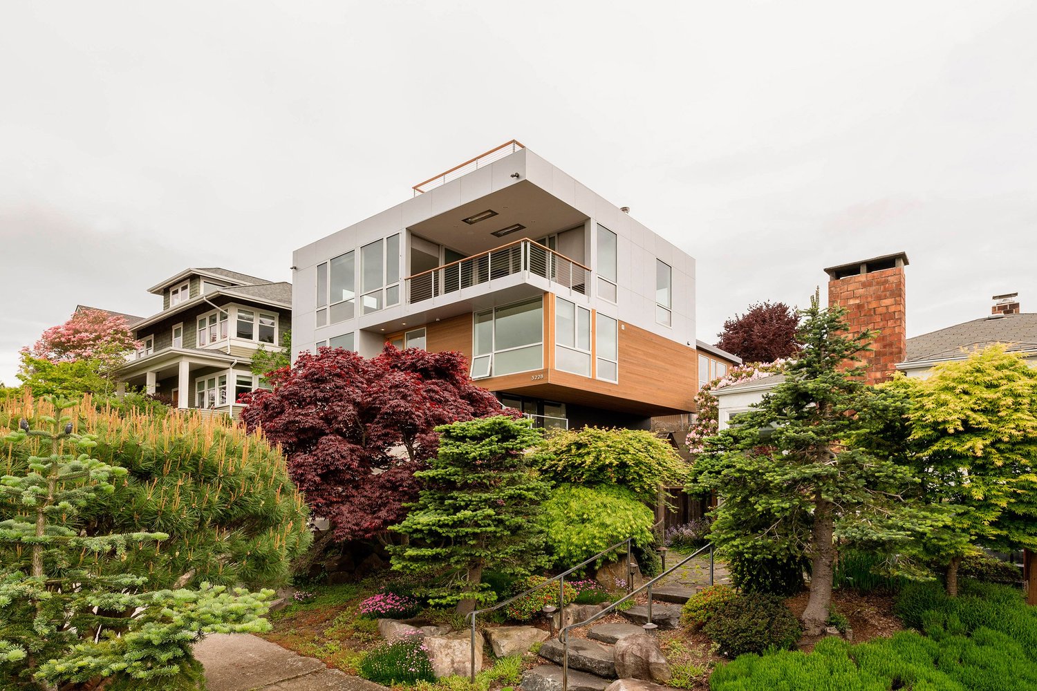 Continuing with our rich tradition of self-developing projects and experimenting with small, single-family lots with primary residences and accessory dwelling units, this three-storey residence for a small family employs a reverse floor plan where the common areas are located at the upper level to capture natural light and views of Ballard, the ship canal, and downtown Seattle. A steep slope condition, coupled with alley access, retains a tidy footprint while offering design opportunities for a day-lit basement and detached garage.