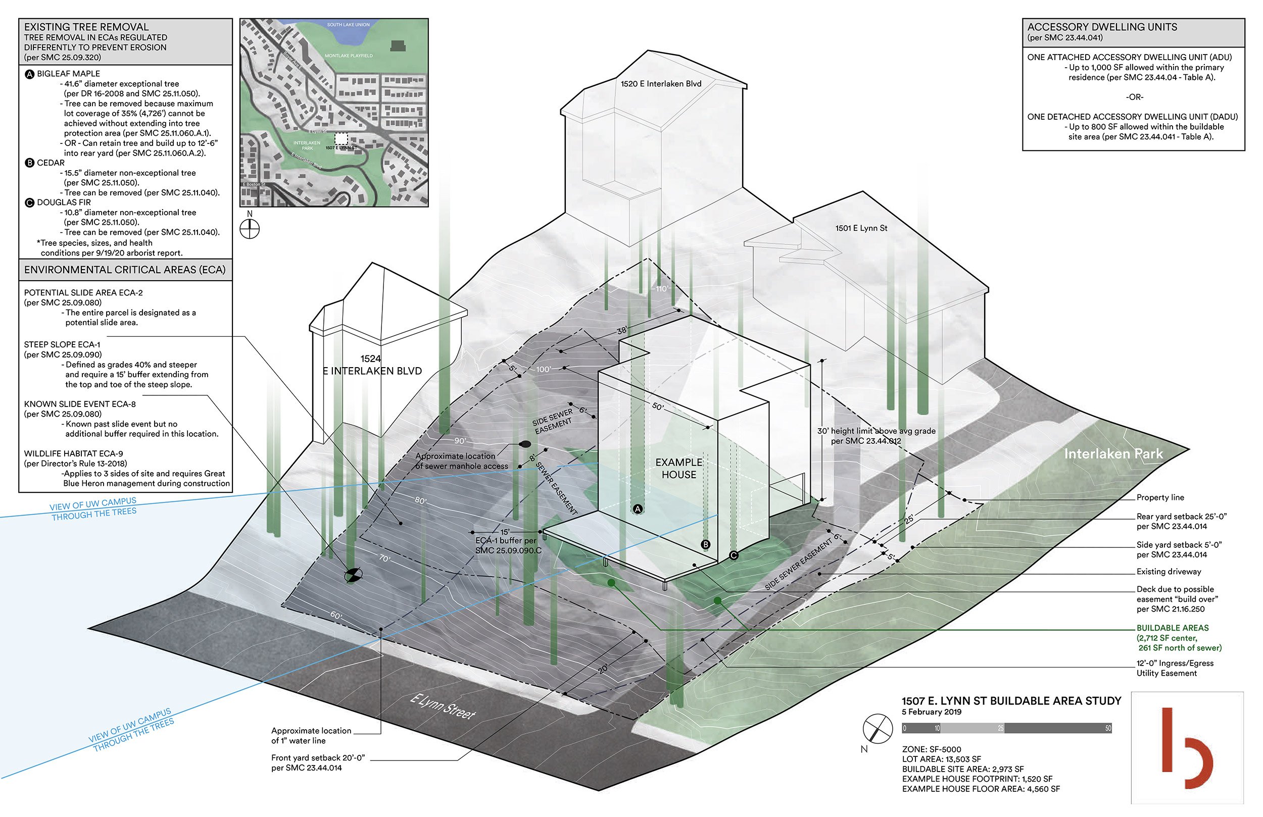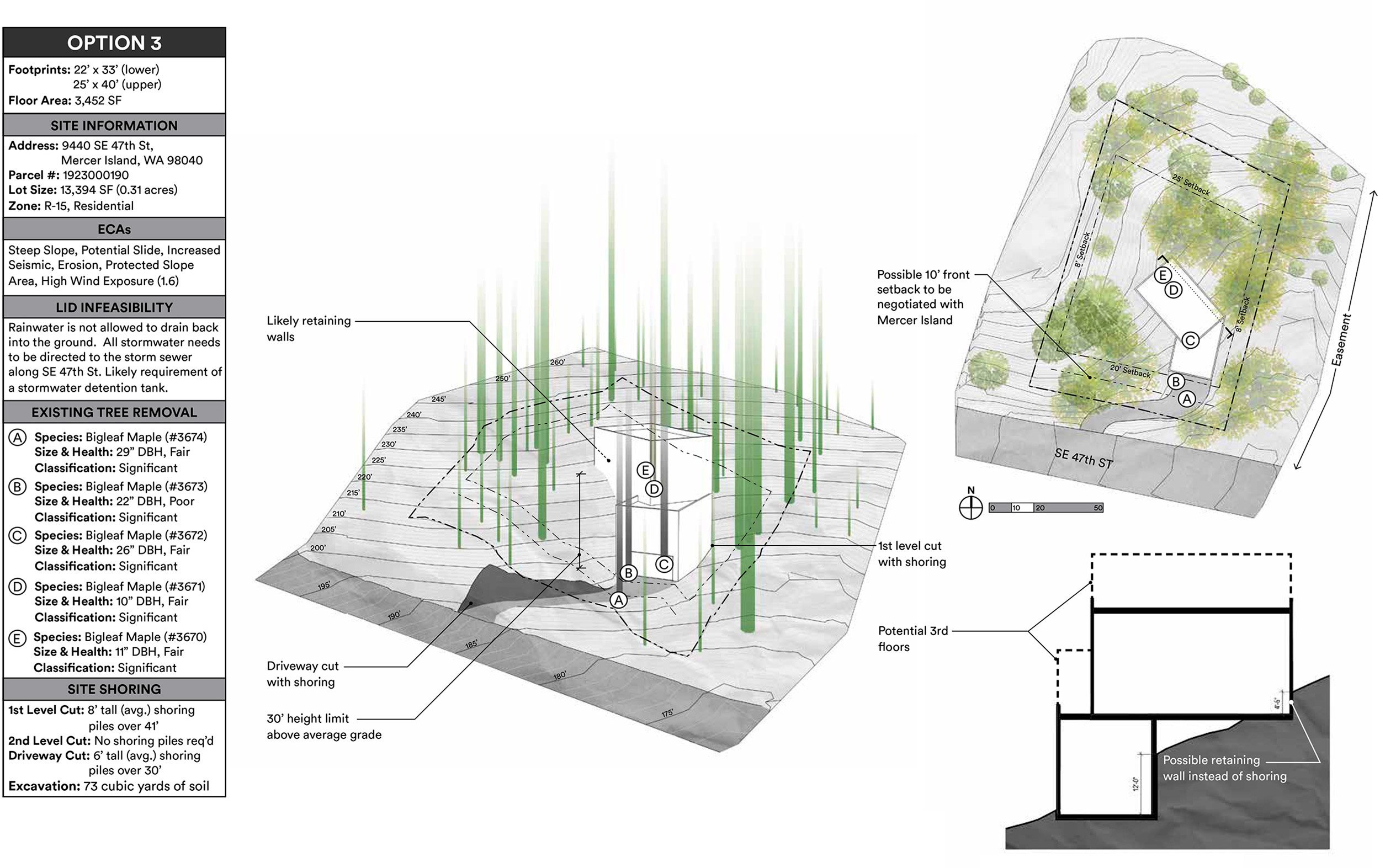 A set of diagrams demonstrated a clear path forward to design, permit, and construct a single-family residence on a forested, steep slope. This study was commissioned by the owners to include with the real estate listing for the property.