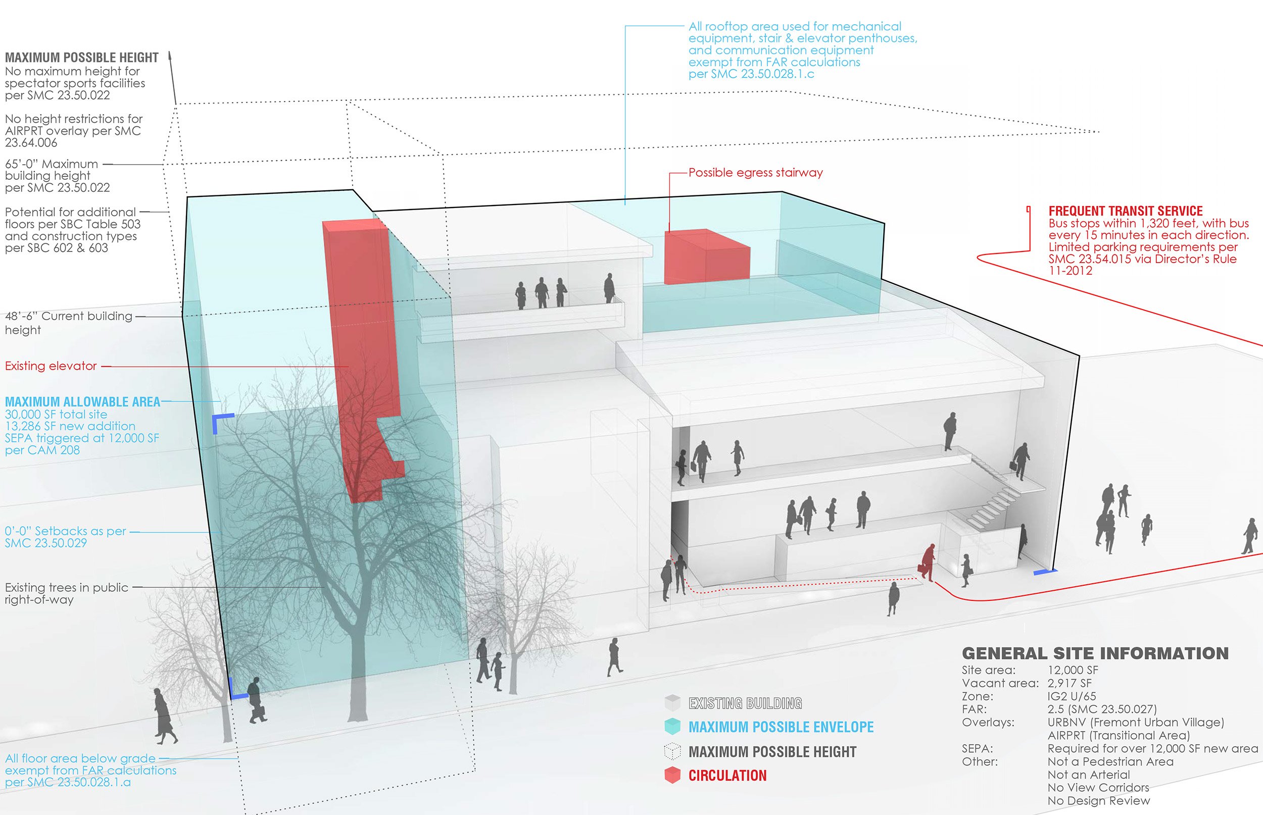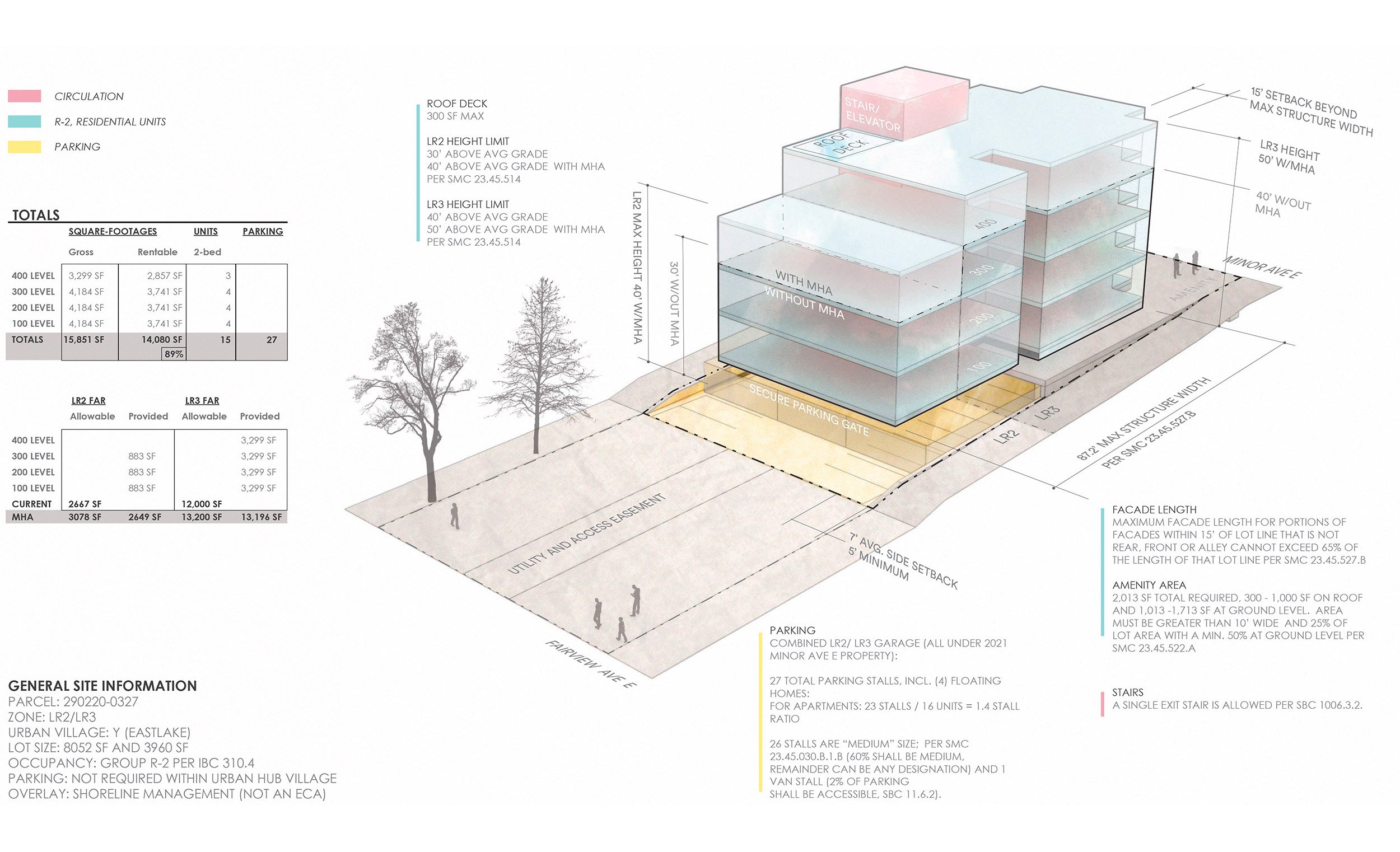 This site, zoning, and permitting analysis provides a clear strategy to design, permit and build a 14-unit apartment building on a 5,400 square foot lot within the City of Seattle. Strategic zoning code navigation allows the project to eliminate Seattle’s time consuming and costly design review process. The project type is an important example of the mid-density housing so desperately needed in the Puget Sound region.