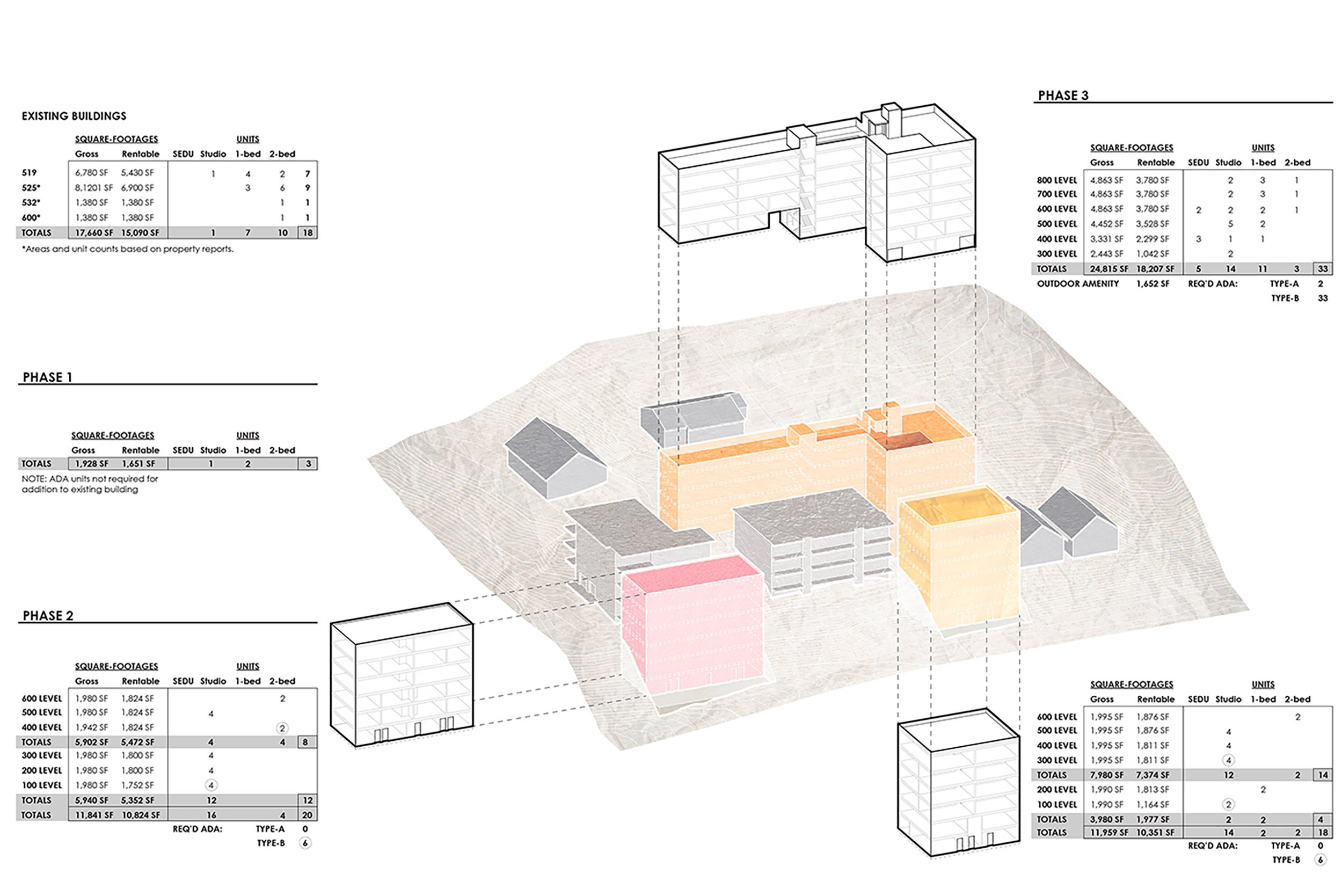 This study analyzed several scenarios to add floors onto an existing apartment building. Diagrams and pro formas were established to show proof of concept for a maximum of 16 additional units, or a 50% increase in rental units.