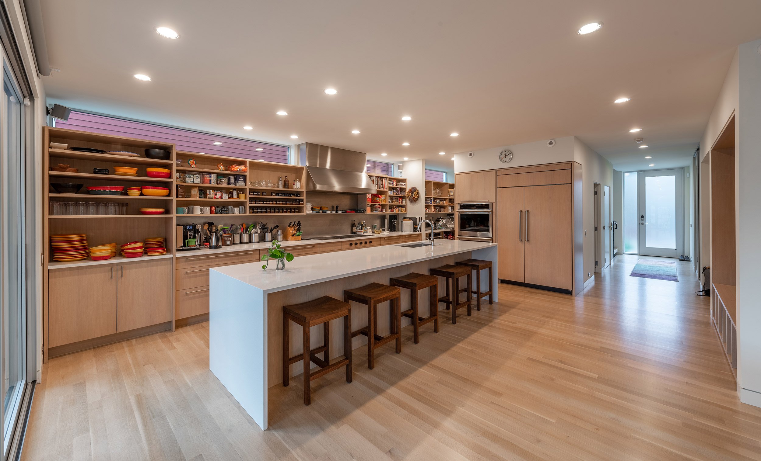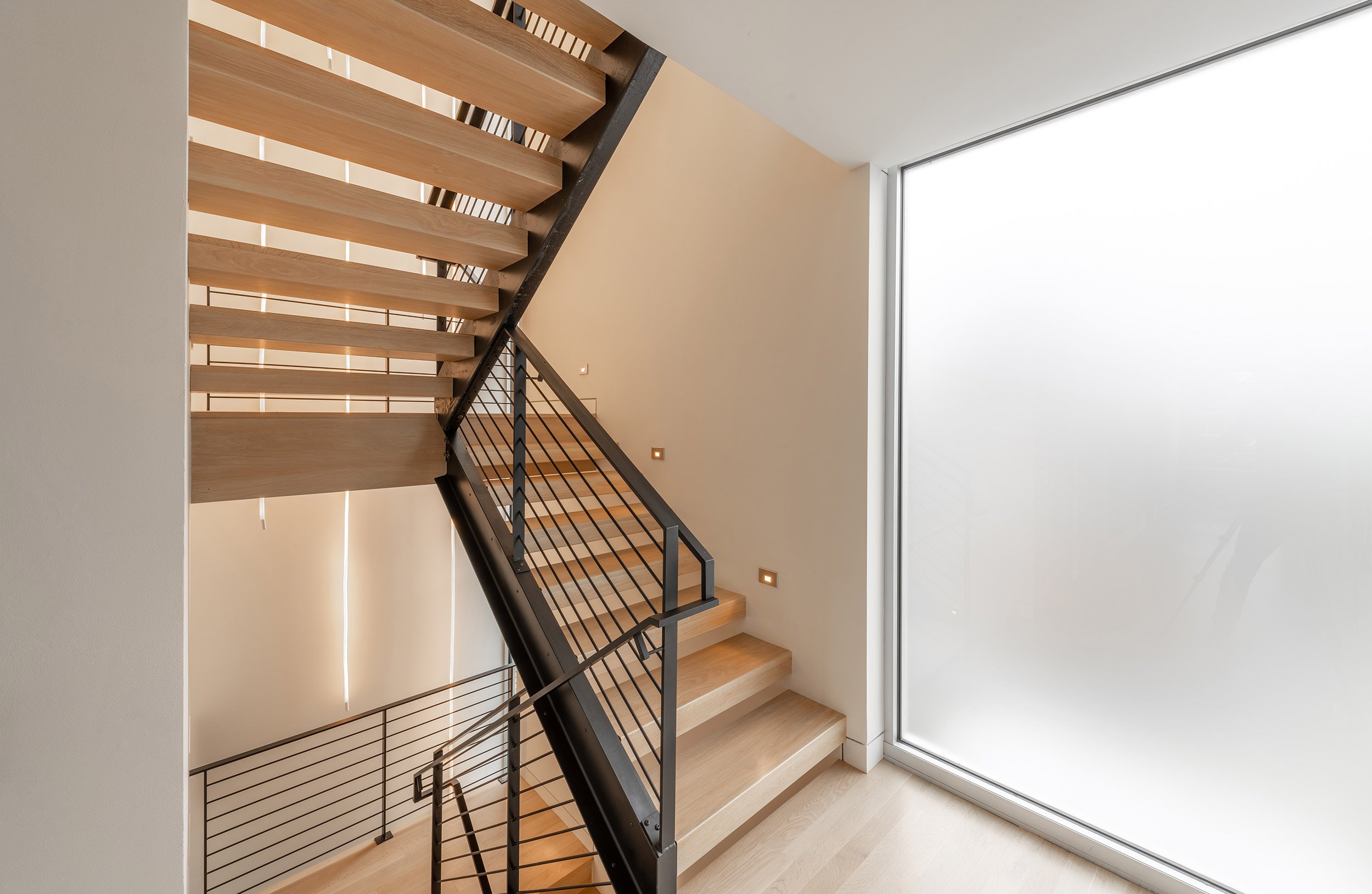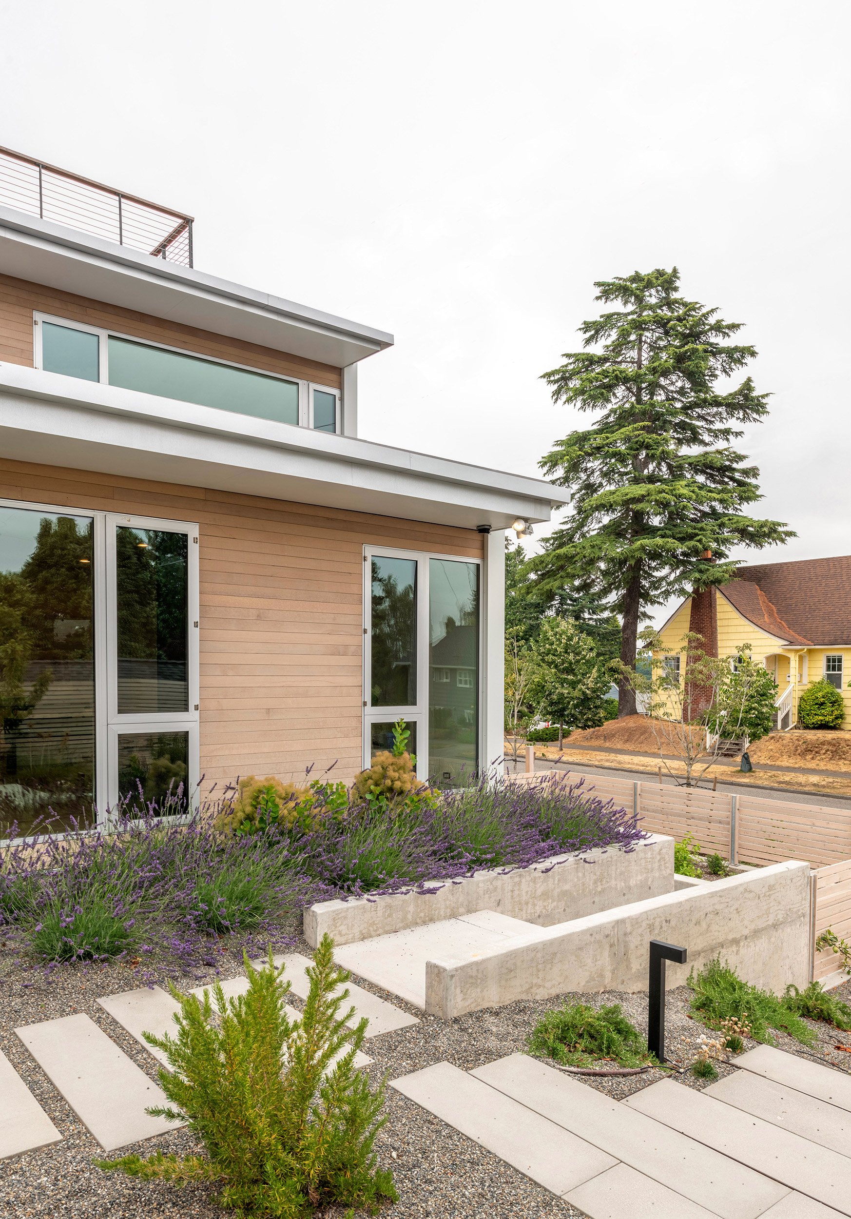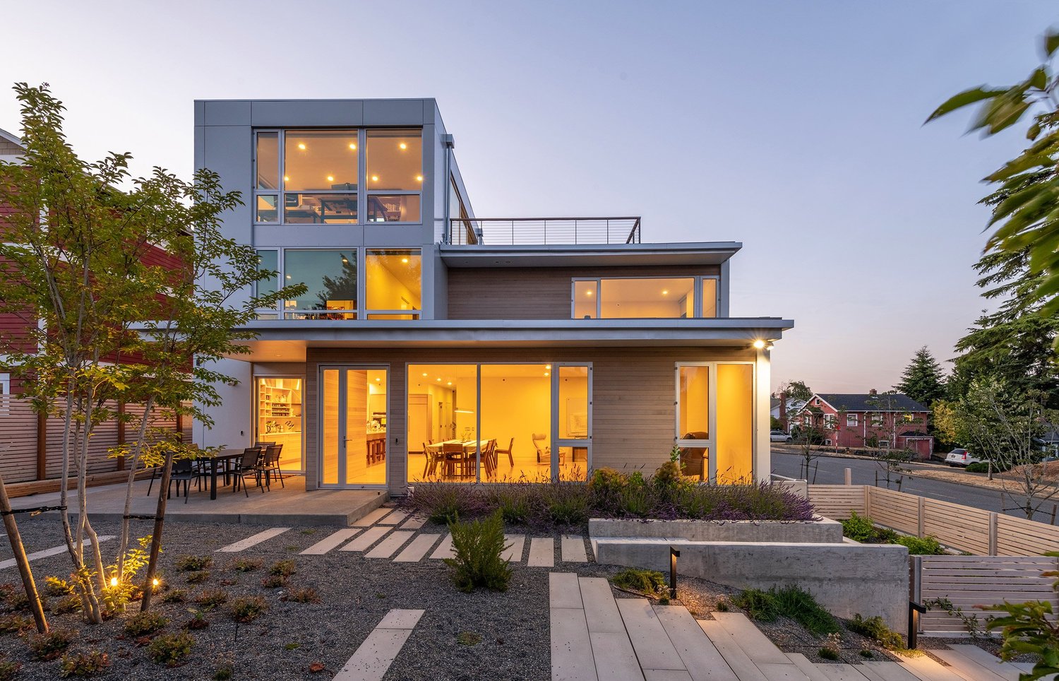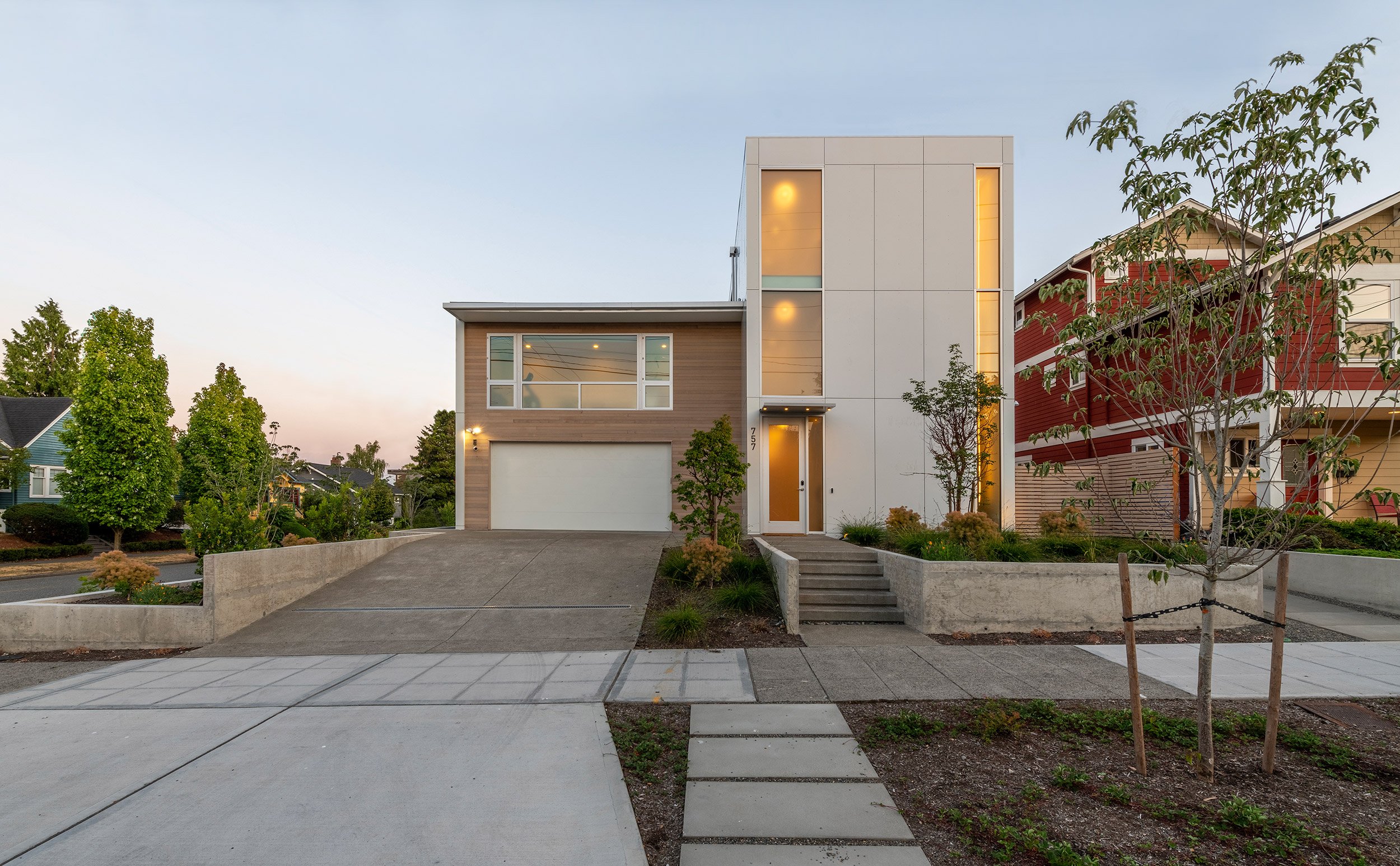 This three-level residence with a full basement boasts a vertical stature to access views from Seattle’s Greenwood neighborhood. Two primary volumes provide a hard edge to the street intersection, and the rear of the structures step down to a southern facing backyard. Crisp white walls create a modern envelope, and long roof eaves provide protection to inset cedar walls. The landscape package draws alignment from the house geometry.