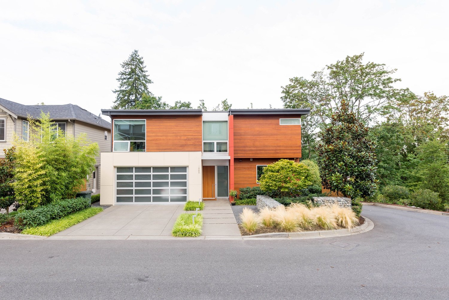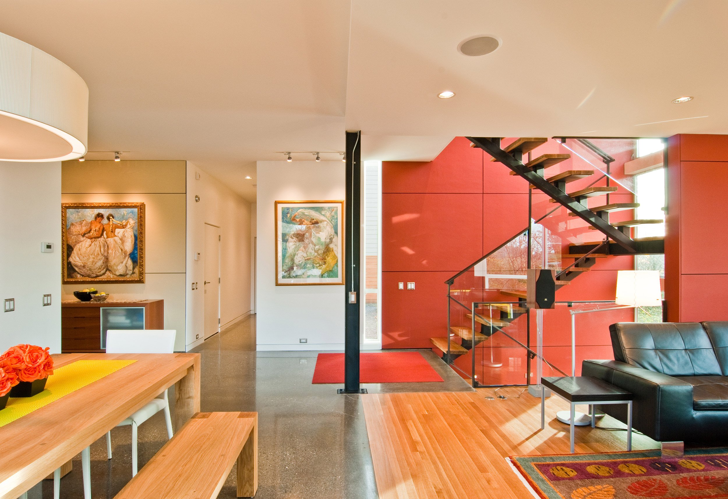 This two-storey home was built on an empty lot in Bellevue, WA. The floor plan is efficient and effective, and includes 2,400-sf of conditioned area, and a two car garage. Inside, the open floor plan allows for smaller, smarter spaces, and the envelope is a simple and elegant translation of the interior functions. The cantilevered living room hovers adjacent to a greenbelt, giving the interior common areas a tree-house-like feel. An open tread stairway is a sculptural feature of the home, and allows unique views to the tree canopy beyond. Floor-to-ceiling windows in the bedrooms allow generous amounts of natural daylight and fresh air.
