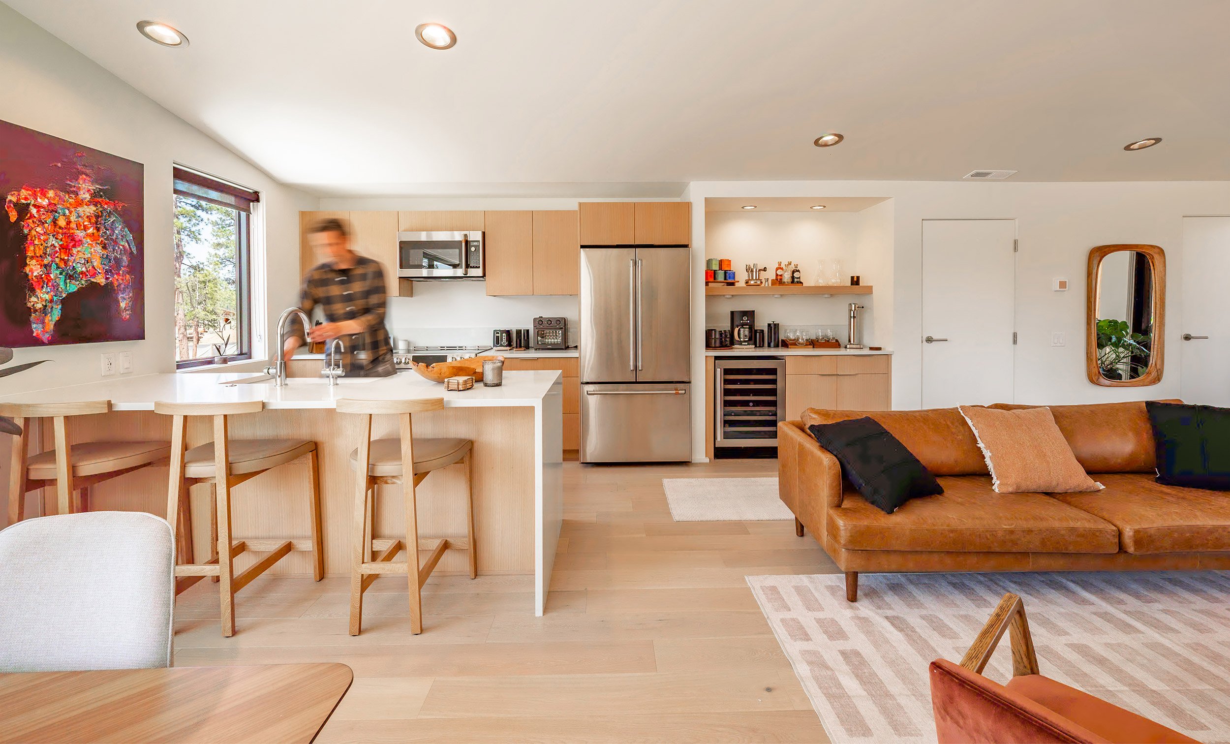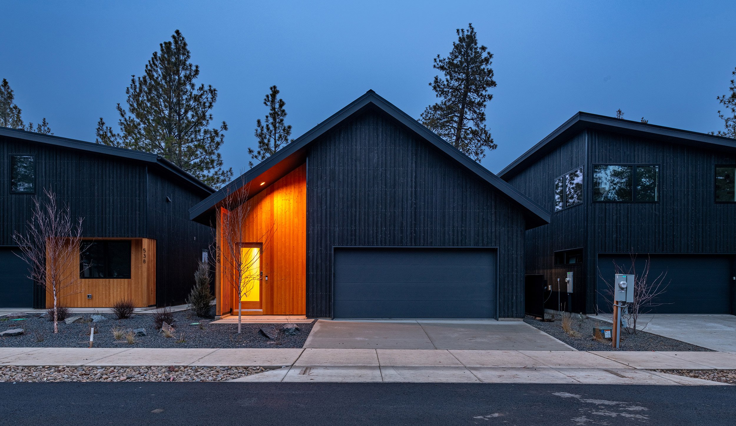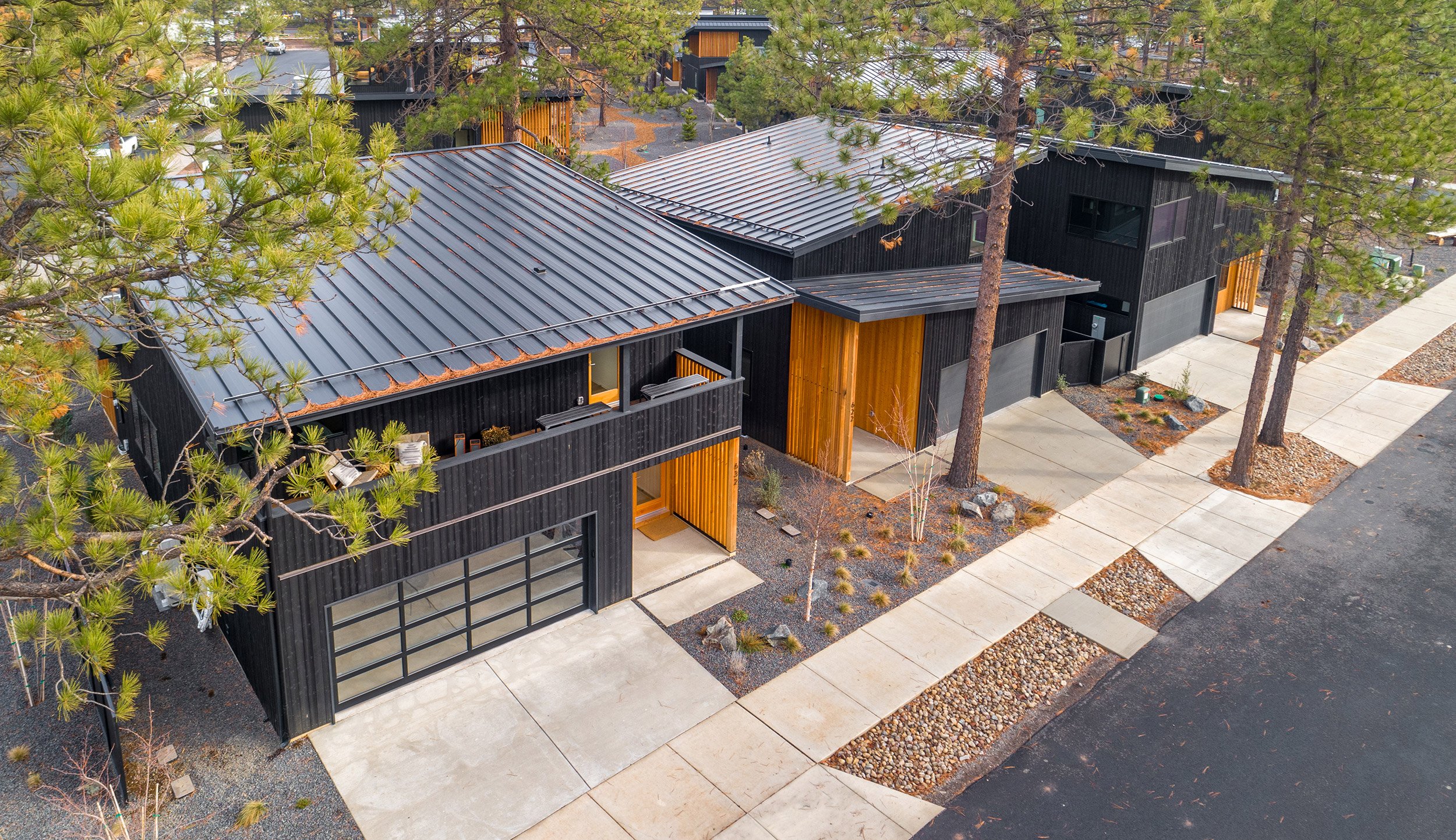 Each cottage is comprised of a minimum of two off-street parking spaces, two bathrooms, two to three bedrooms, and vaulted living, dining and kitchen spaces. The front of each cottage includes a generous covered porch that faces a shared community space, and the rear-facing garages contain modest entrances. The design of the cottages was inspired by the western frontier storefront facades that have historically been used throughout Sisters, and the surrounding mountains that may be viewed prominently from the site.